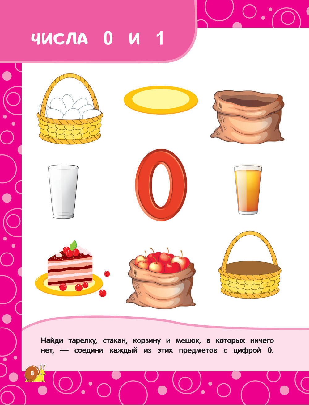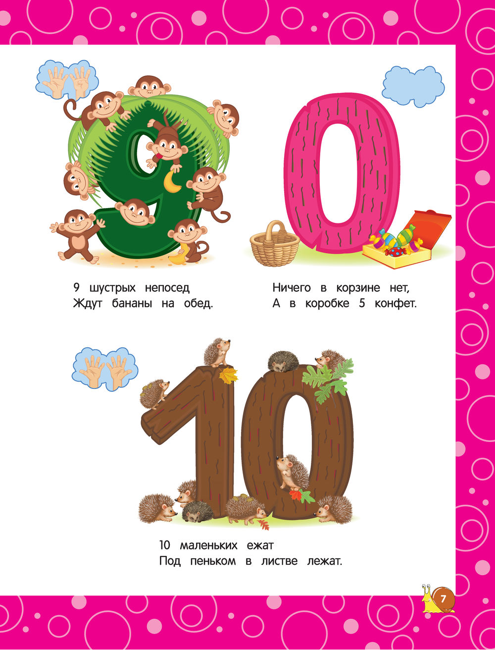 Цель книги – научить ребёнка считать. Большинство заданий направлено на то, чтобы малыш освоил навык счёта в прямом и обратном порядке и смог сравнить группы предметов по количеству; потренировался в написании цифр; научился соотносить число и количество; закрепил понятия "над", "под", "перед", "слева", "справа", "позади".