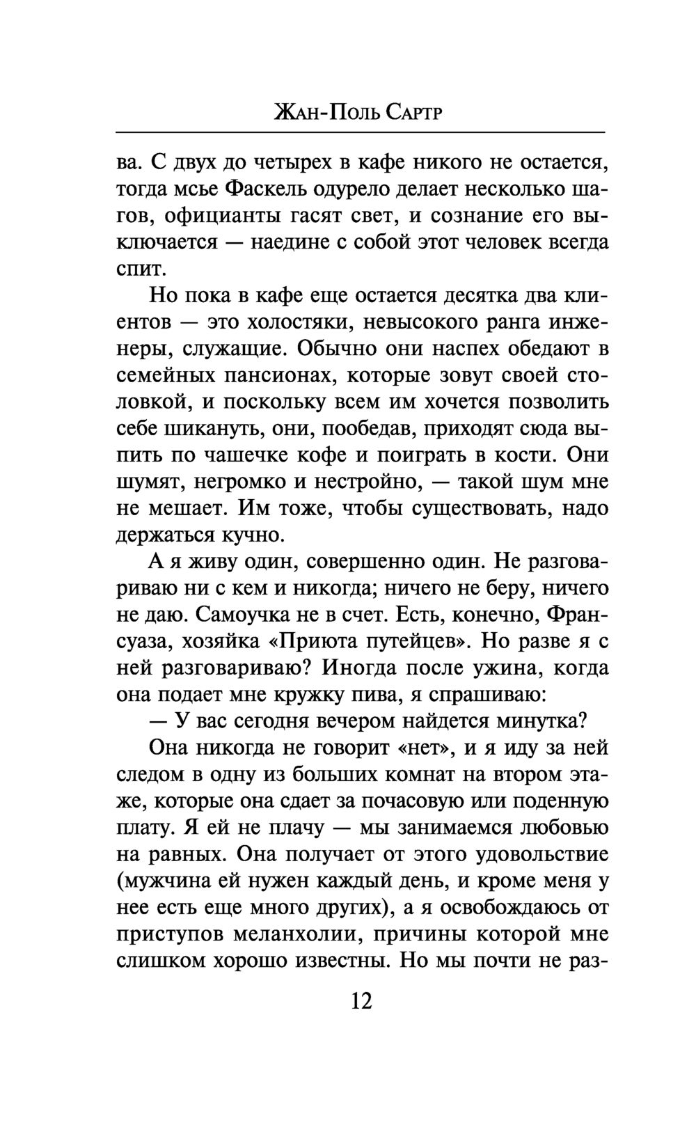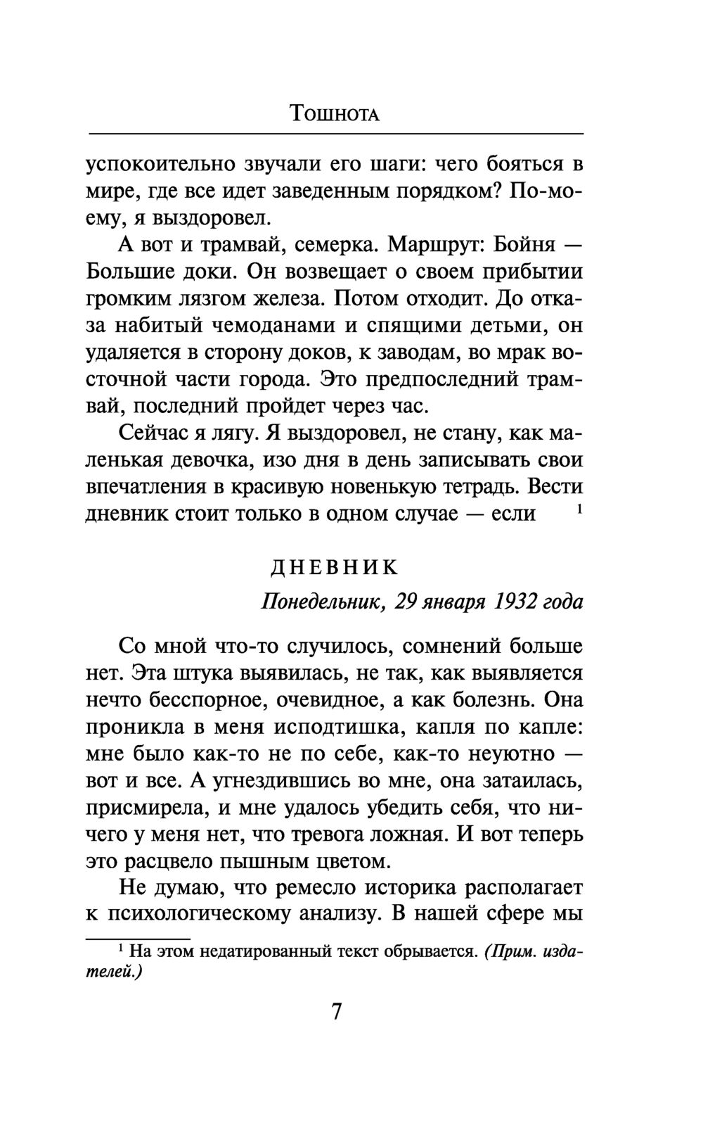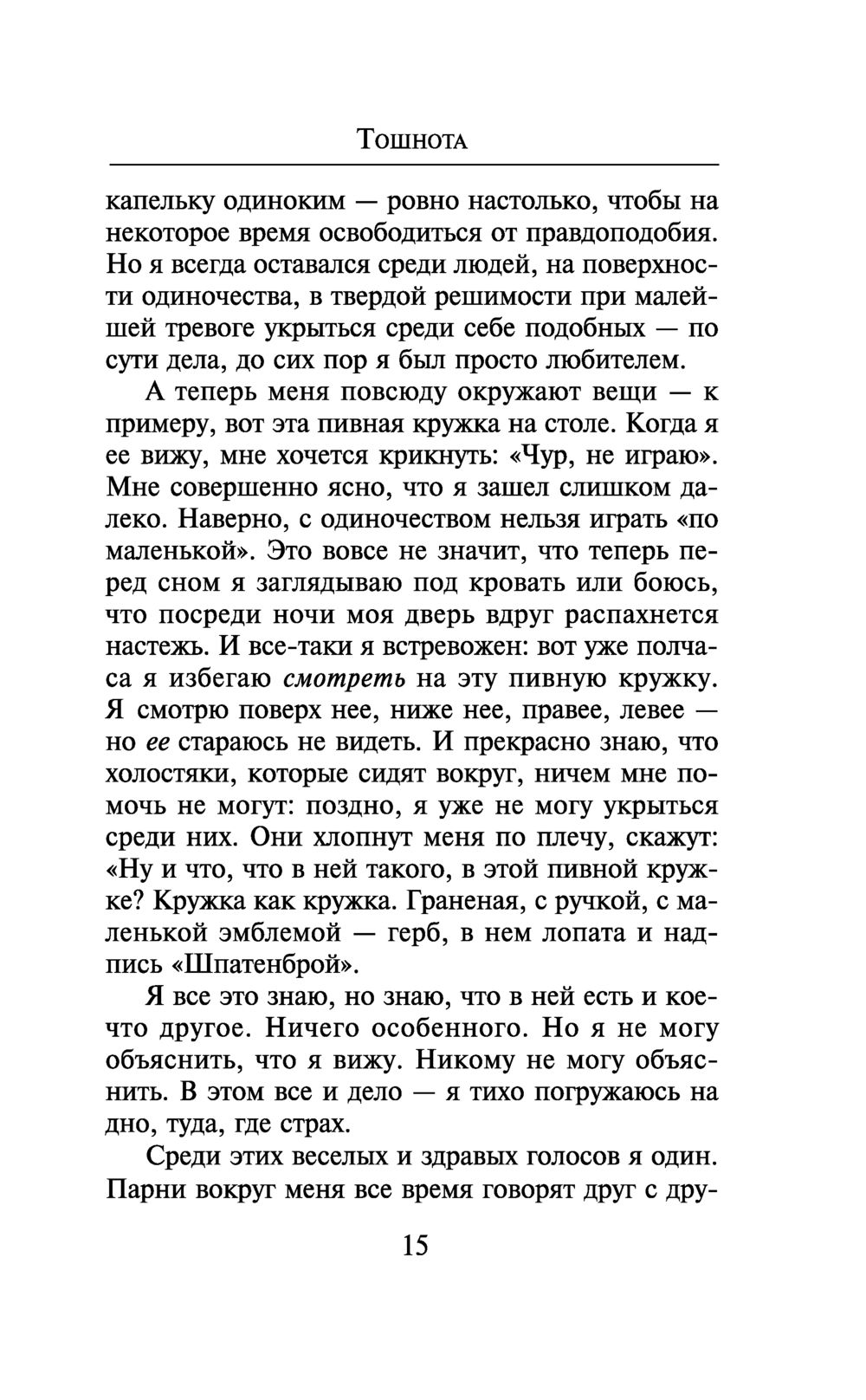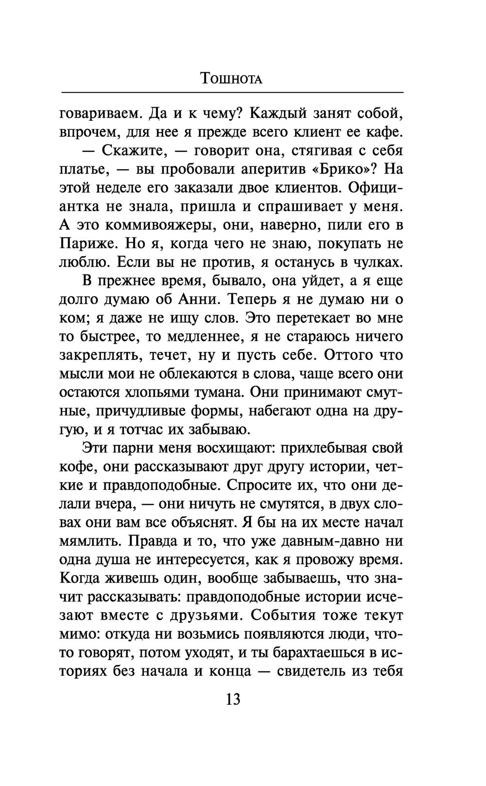 Тошнота – это суть бытия людей, застрявших "в сутолоке дня". Людей – брошенных на милость чуждой, безжалостной, безотрадной реальности. Тошнота – это невозможность любви и доверия, это – попросту – неумение мужчины и женщины понять друг друга. Тошнота – это та самая "другая сторона отчаяния", по которую лежит Свобода. Но – что делать с этой проклятой свободой человеку, осатаневшему от одиночества?..
