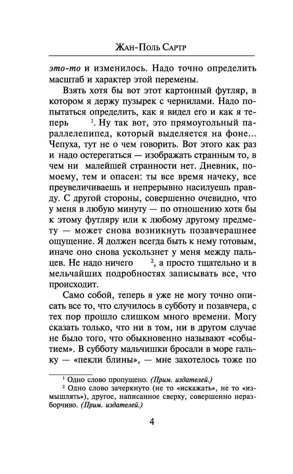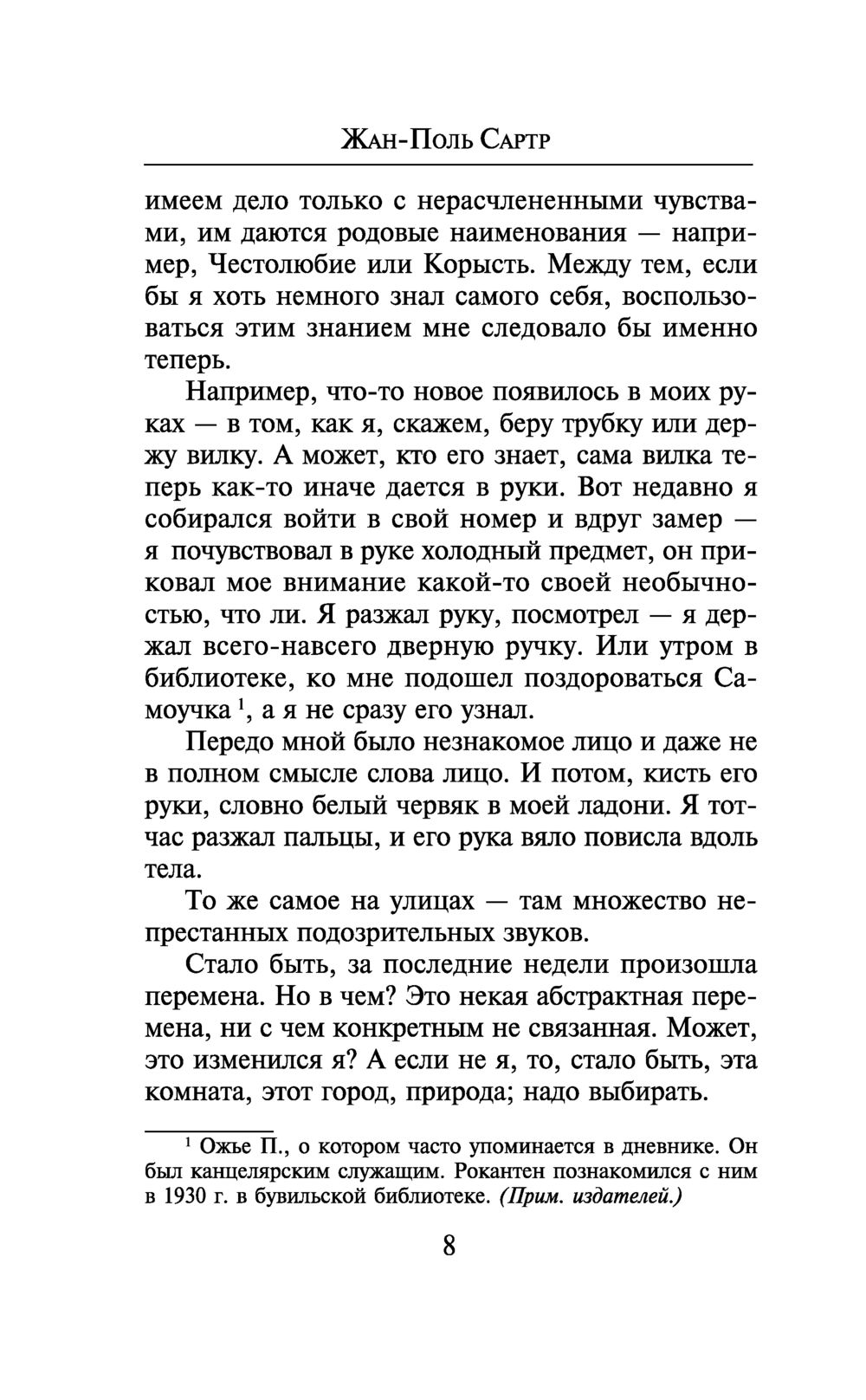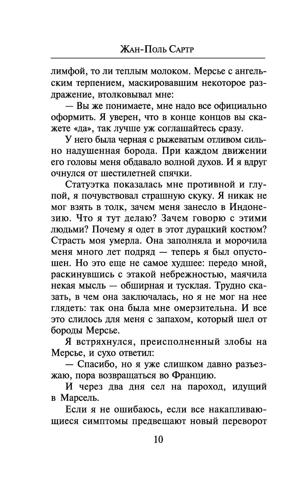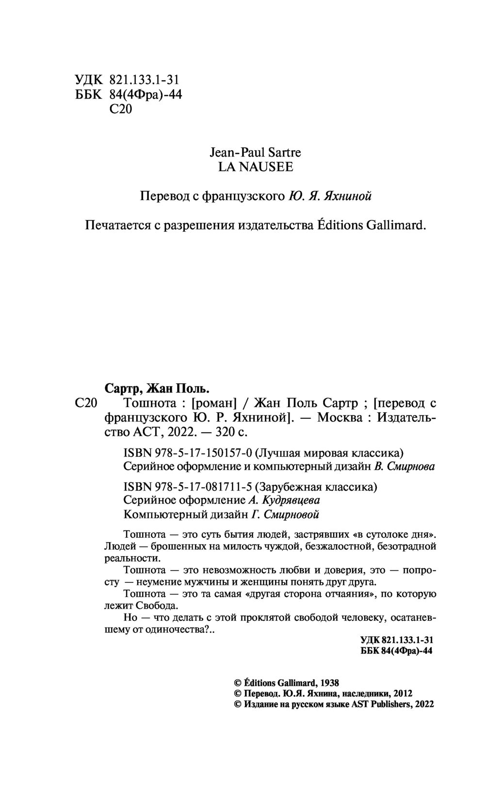 Тошнота – это суть бытия людей, застрявших "в сутолоке дня". Людей – брошенных на милость чуждой, безжалостной, безотрадной реальности. Тошнота – это невозможность любви и доверия, это – попросту – неумение мужчины и женщины понять друг друга. Тошнота – это та самая "другая сторона отчаяния", по которую лежит Свобода. Но – что делать с этой проклятой свободой человеку, осатаневшему от одиночества?..