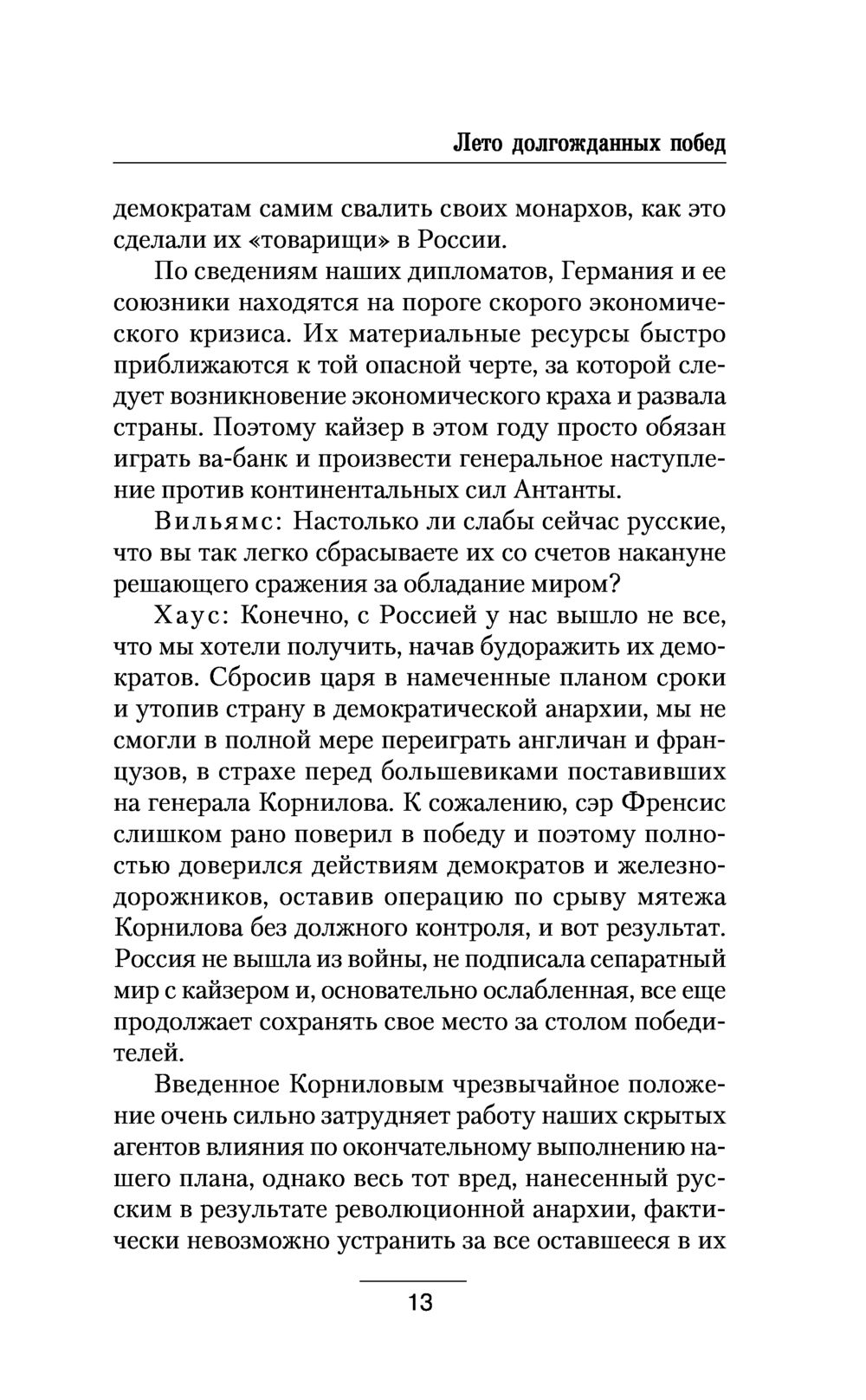 Август 1917 года, мятеж генерала Корнилова удался. История пошла по новому пути. Верховный правитель России генерал Лавр Петрович Корнилов собрал вокруг себя истинных патриотов таких как Слащев, Кутепов, Деникин, а так же Сталин, Держинский, Камо... И Россия не упала в анархию, удержала фронт, и вот уже проливы и Константинополь под рукой России. Но и германский гений не дремлет, и новое немецкое оружие стирает с земли Лондон и Париж. Война разгорается с новой силой и на суше и на море и в воздухе.