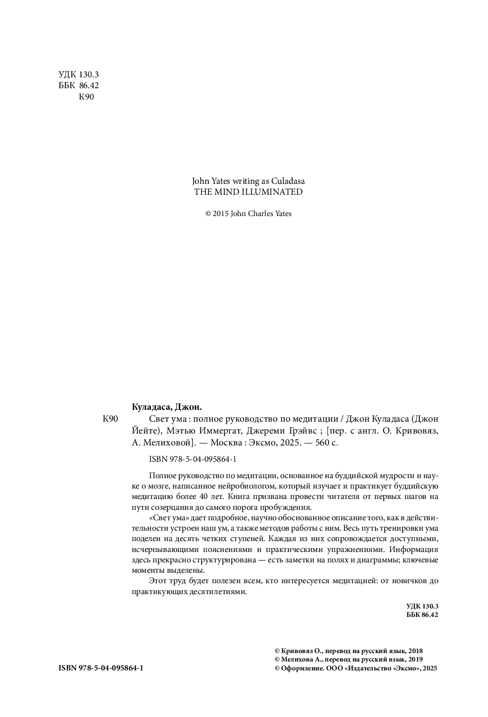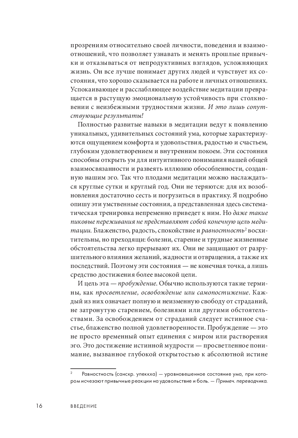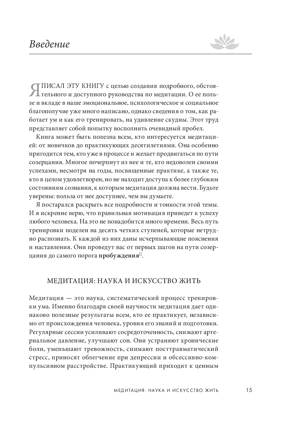 Книга представляет собой подробнейшее современное исследование о том, как устроен наш ум. Автор – доктор философии и нейробиолог – практикует буддийскую медитацию более 40 лет, обладает широким и всесторонним знанием буддийского учения, которое он объединил с современным научным взглядом на ум. Цель книги – предоставить читателю понятную, подробную «дорожную карту» медитации и провести его от первых шагов на пути созерцания до самого порога пробуждения.