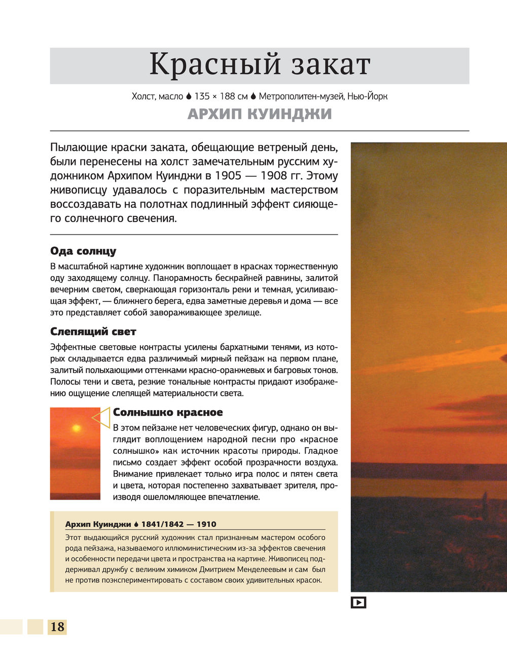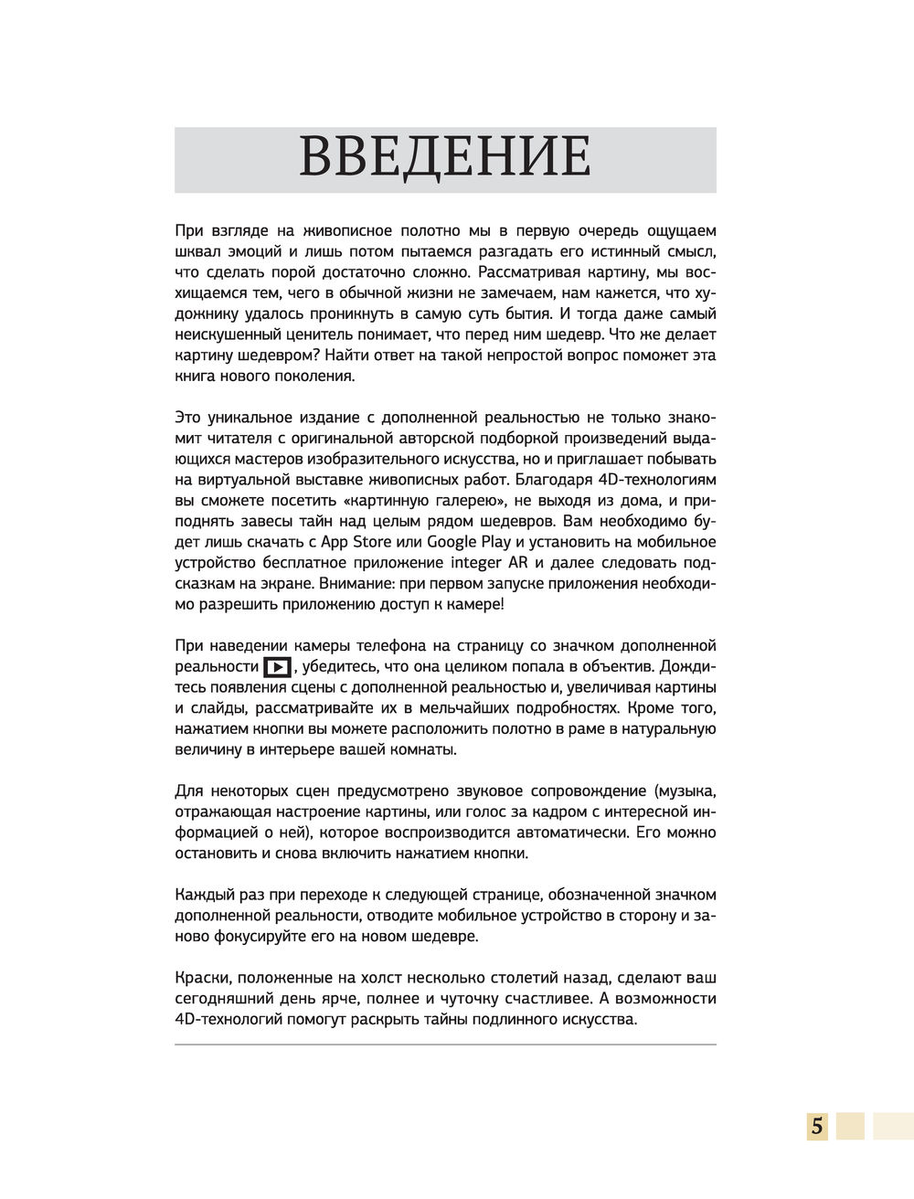 Это уникальное издание с дополненной реальностью станет вашим личным экскурсоводом по миру шедевров живописи. Живой и увлекательный рассказ поможет понять смысл и рассмотреть подлинную ценность полотен. Более того, с помощью современных 4D-технологий вы сумеете глубже окунуться в произведения мастеров мировой живописи: установив бесплатное приложение, вы станете полноценным зрителем виртуальной выставки картин, собрать которые мечтают лучшие музеи мира. И поверьте, оторваться от этого зрелища будет практически невозможно! Рассматривайте фрагменты, листайте эскизы, наслаждайтесь богатейшими сериями под классическую музыку или закадровый голос. Совершите это интереснейшее, полное открытий путешествие в мир живописи с помощью 4D-технологий, которые подарят вам новые возможности в постижении вечной красоты.