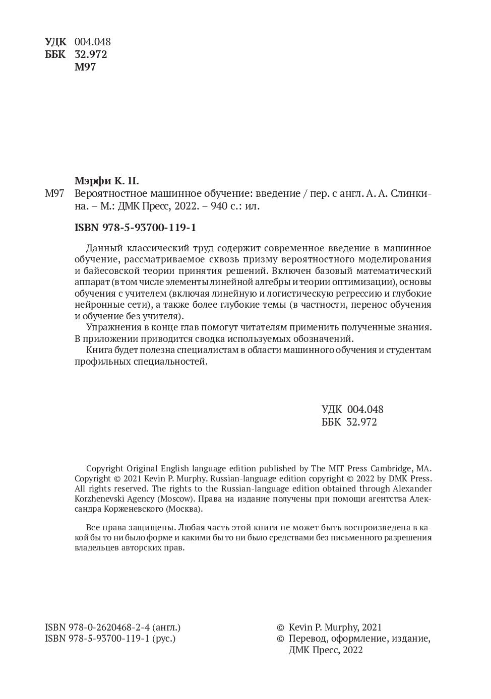 В основу издания легла вышедшая в 2012 году книга Кэвина Мэрфи "Machine Learning: A Probabilistic Perspective". Однако это совершенно новая работа, отражающая многие достижения, случившиеся в этой области за последние 10 лет.