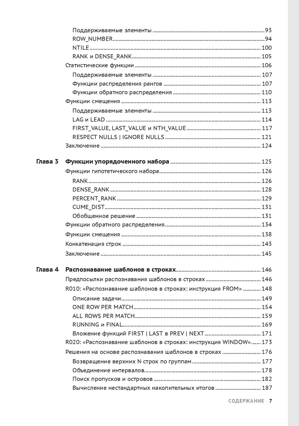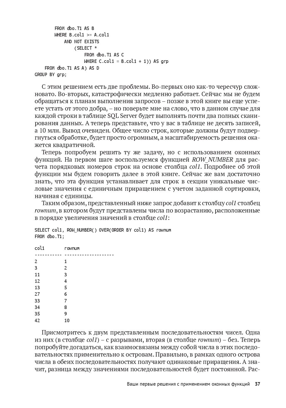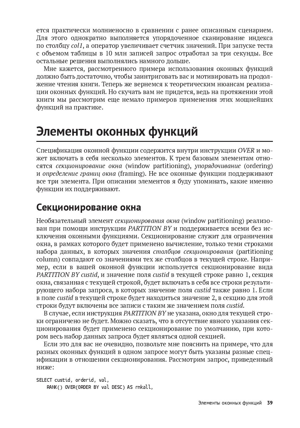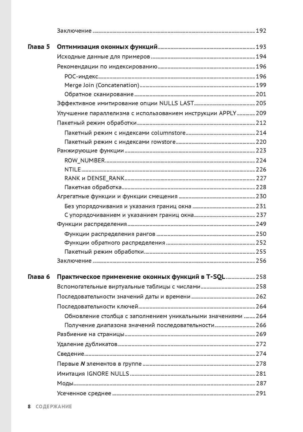В своей книге Ицик Бен-Ган, эксперт по оптимизации запросов на языке T-SQL, предлагает на примерах ознакомиться со всеми типами оконных функций: агрегатными, ранжирующими, статистическими, а также функциями смещения и функциями упорядоченного набора. Большая часть книги посвящена оптимизации оконных функций, а также готовым решениям бизнес-задач с использованием новейших техник.