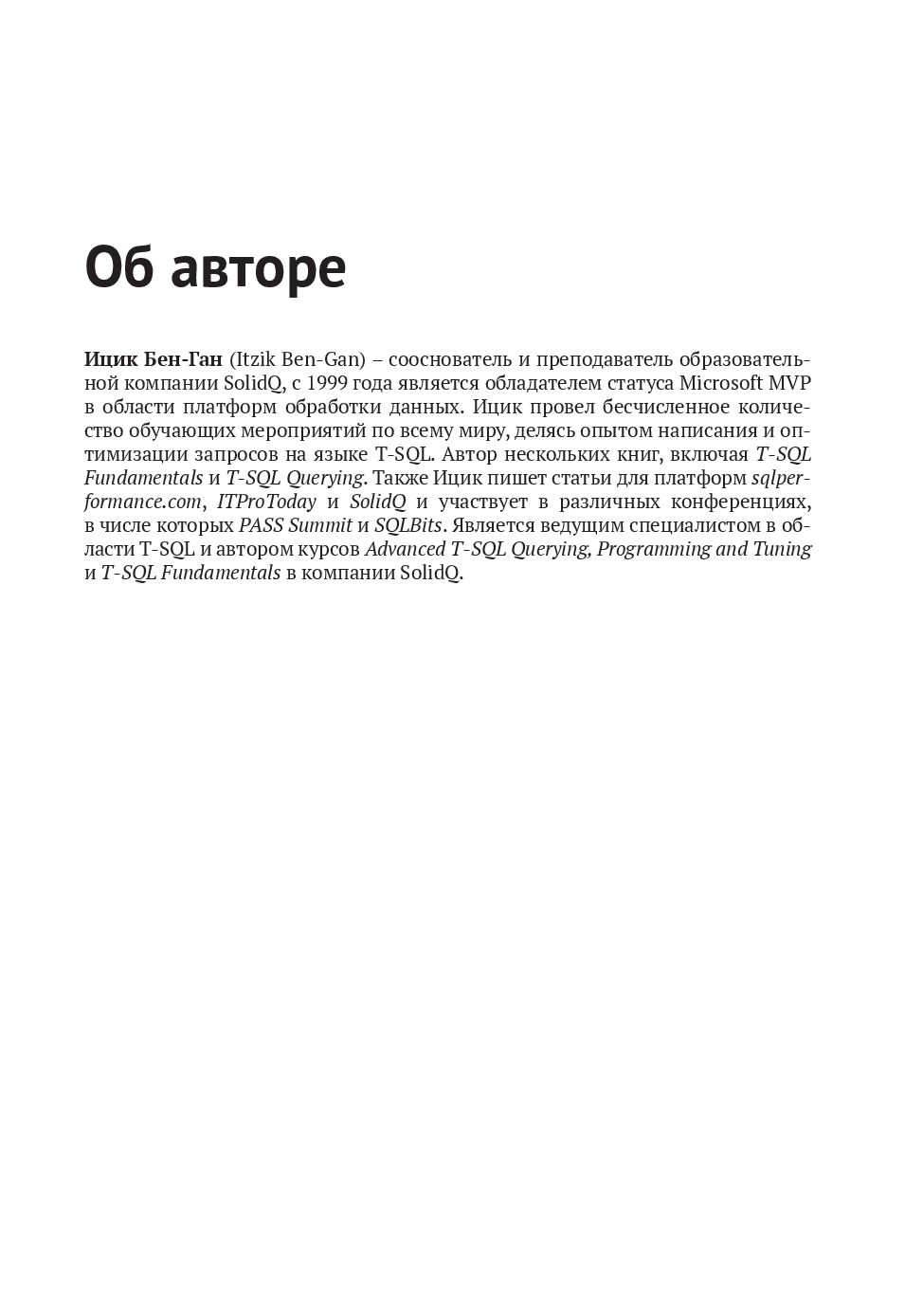 Книга предназначена для разработчиков и администраторов СУБД, аналитиков данных, специалистов в области бизнес-аналитики и тех, кто знаком с основами запросов на языке T-SQL.