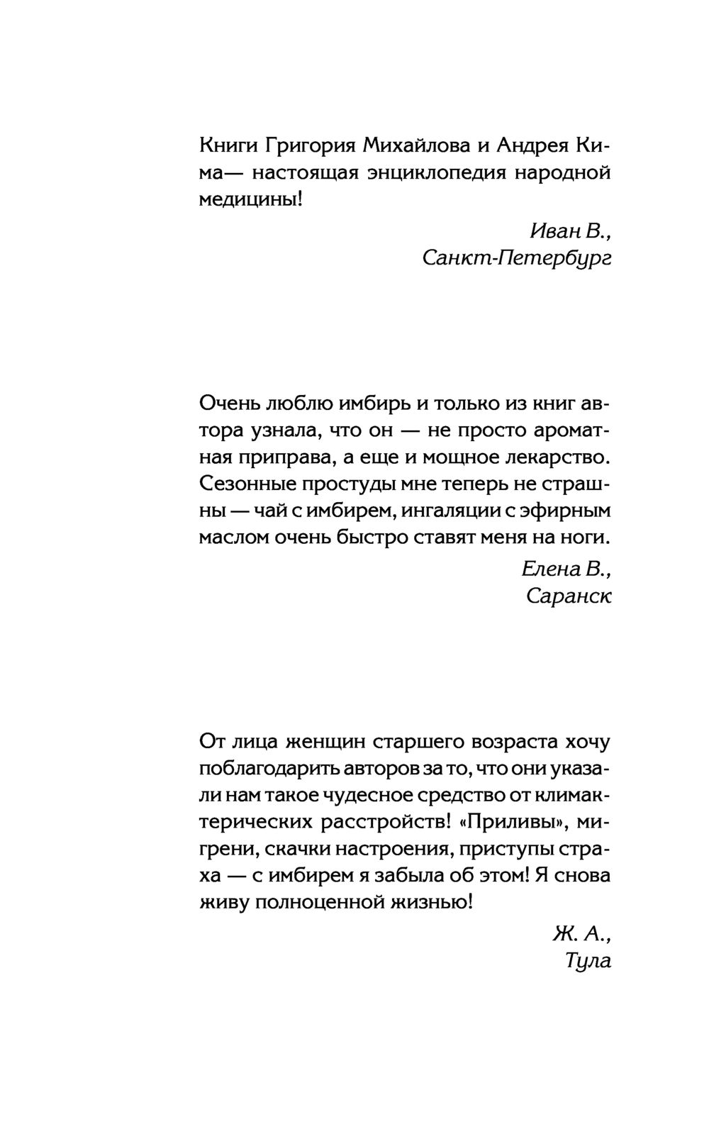 Книга Андрея Кима и Григория Михайлова, специалистов по народной медицине и оздоровительным практикам Востока, "Имбирь – древний лекарь. Новые возможности и рецепты" – это увлекательная история ароматной специи и уникального лекарственного средства, известного людям с глубокой древности. Из этой книги вы узнаете о лекарственных свойствах имбиря, о способах его использования в качестве добавки к пище и о том, как приготовить из него целебные средства, помогающие в самых разных ситуациях. Имбирь – это кладезь витаминов, макро- и микроэлементов и аминокислот, а также прекрасное средство при инфекционных и паразитарных заболеваниях, он оказывает благотворное воздействие на иммунитет и работу желудочно-кишечного тракта, помогает при выпадении волос, излишнем весе и проблемах с кожей. Подробные и доступные рецепты дадут вам возможность пополнить свою домашнюю аптечку прекрасным народным средством, возвращающим и укрепляющим здоровье!
