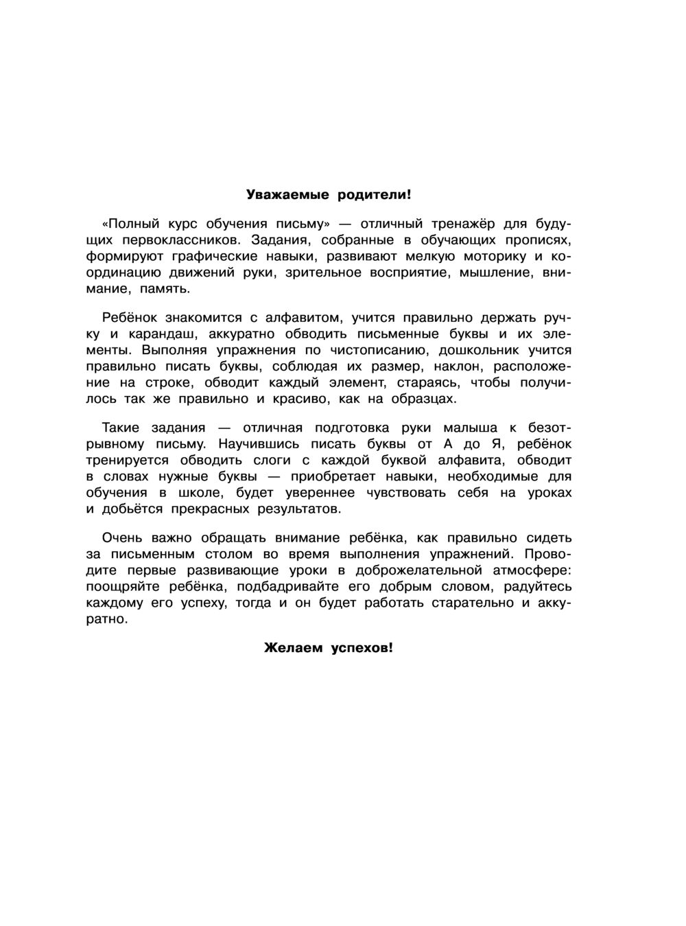 "Полный курс обучения письму" – пособие для подготовки руки к письму и отработки графических навыков. Дошкольники познакомятся с азбукой и научатся писать письменные буквы, потренируются аккуратно обводить элементы букв, буквы, слоги и слова смогут умело обращаться с ручкой и карандашом.