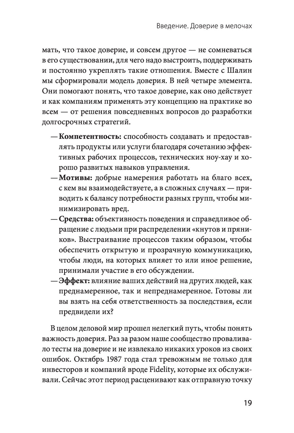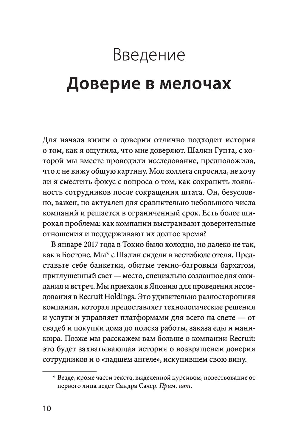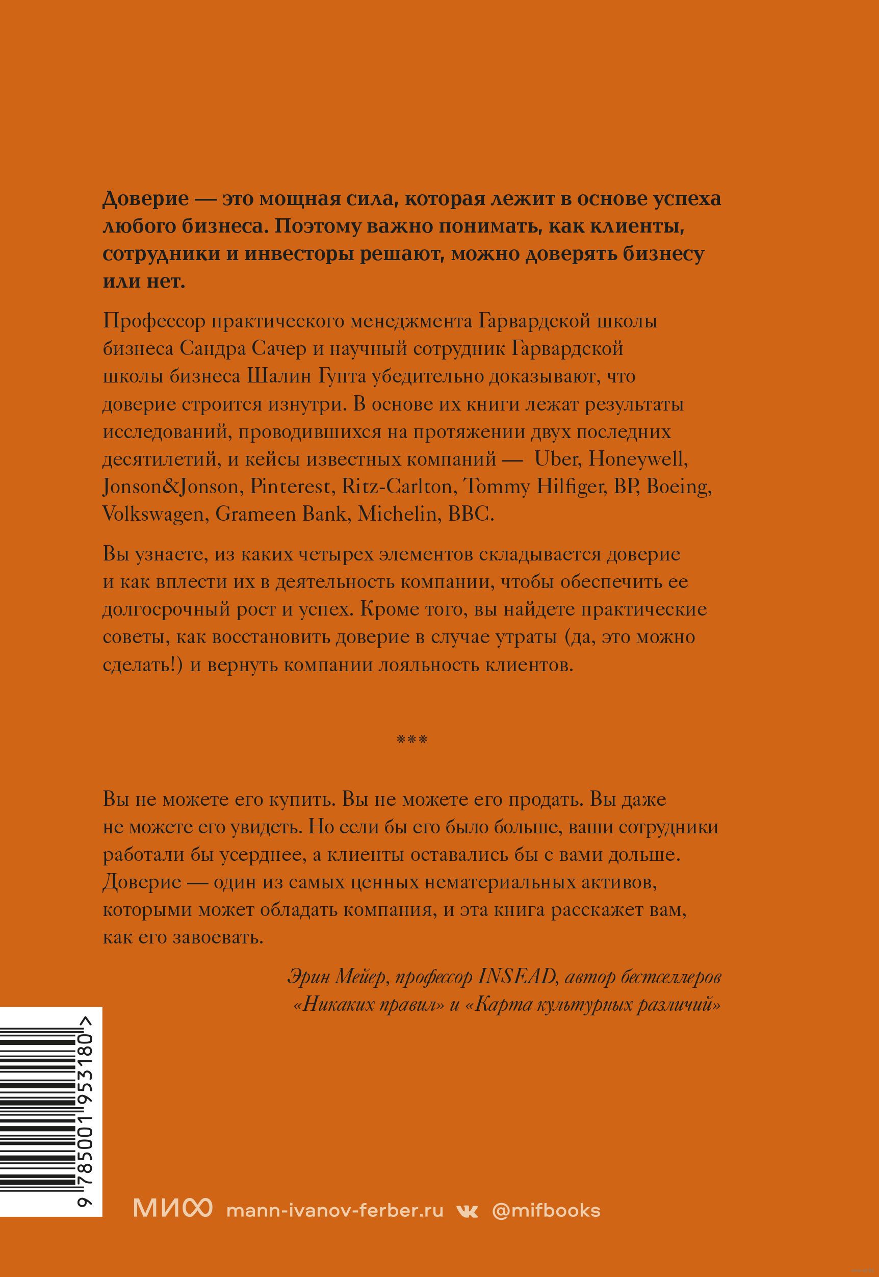 Сандра Сачер и Шалин Гупта убедительно доказывают, что доверие строится изнутри. Оно возникает благодаря тому, что компания изначально честна по отношению к клиентам и сотрудникам: создает качественные продукты и услуги, открыта к общению, справедливо относится к людям и берет на себя ответственность за последствия принимаемых решений.