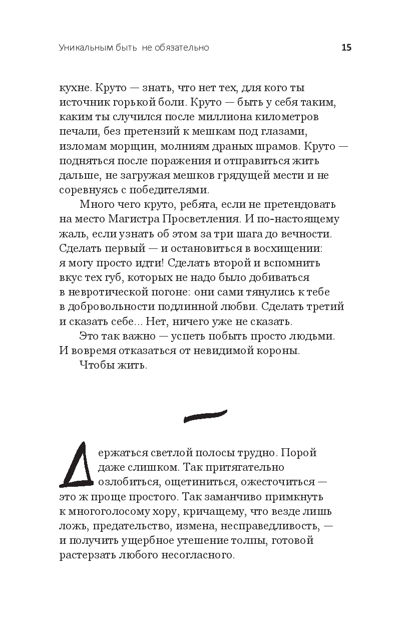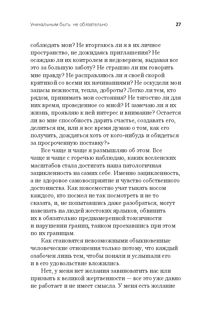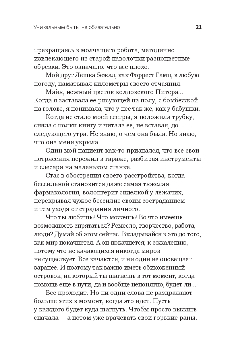 В этих текстах много сочувствия, юмора, нежности, глубины и настоящей жизни – жизни, где отчаяние уже содержит в себе оттенки надежды, где не обязательно быть уникальным и где звучит только наша, ни с чем не сравнимая музыка. Жизнь нередко "заслуживает иронии, а не слез" – но она стоит того, чтобы ее любить. Эта книга – дверь, за которой можно посмотреть на себя по-новому. А можно просто выдохнуть и набраться сил.