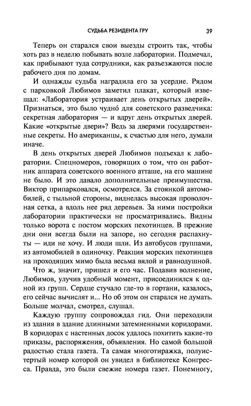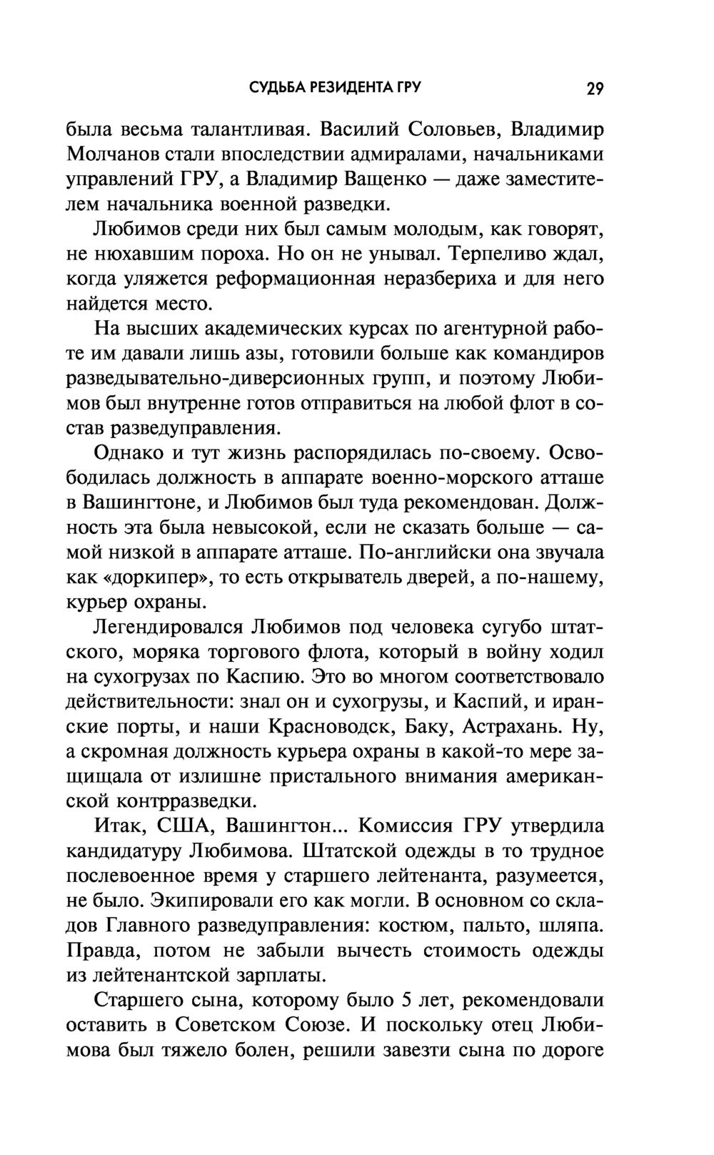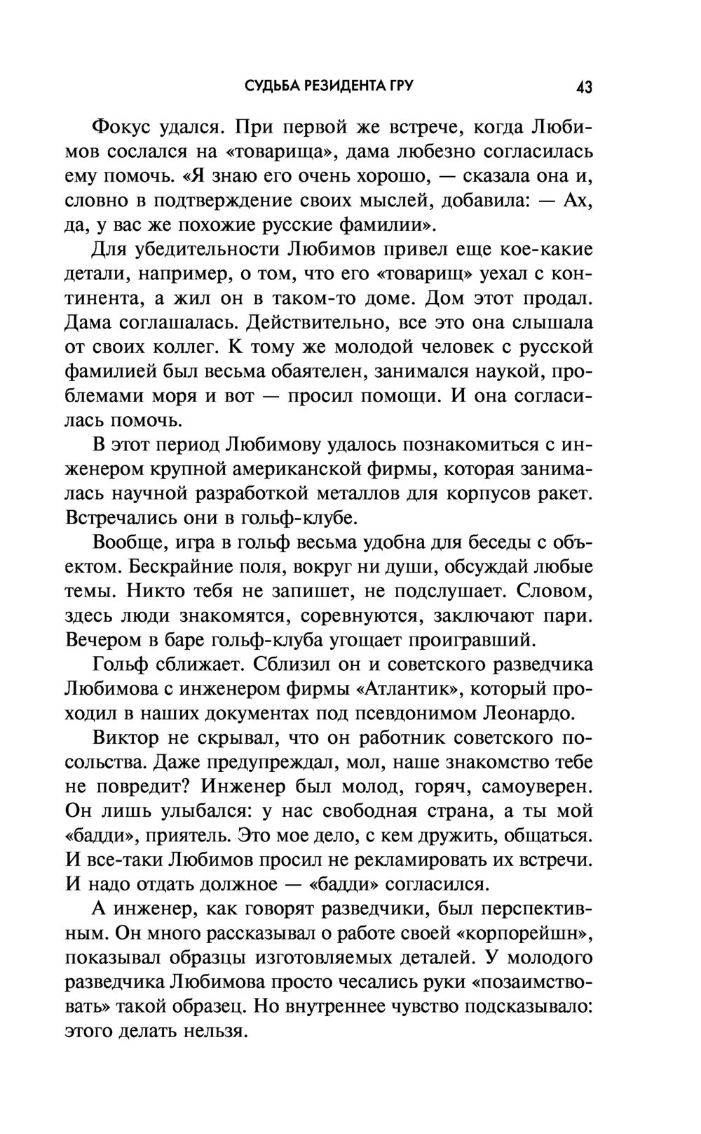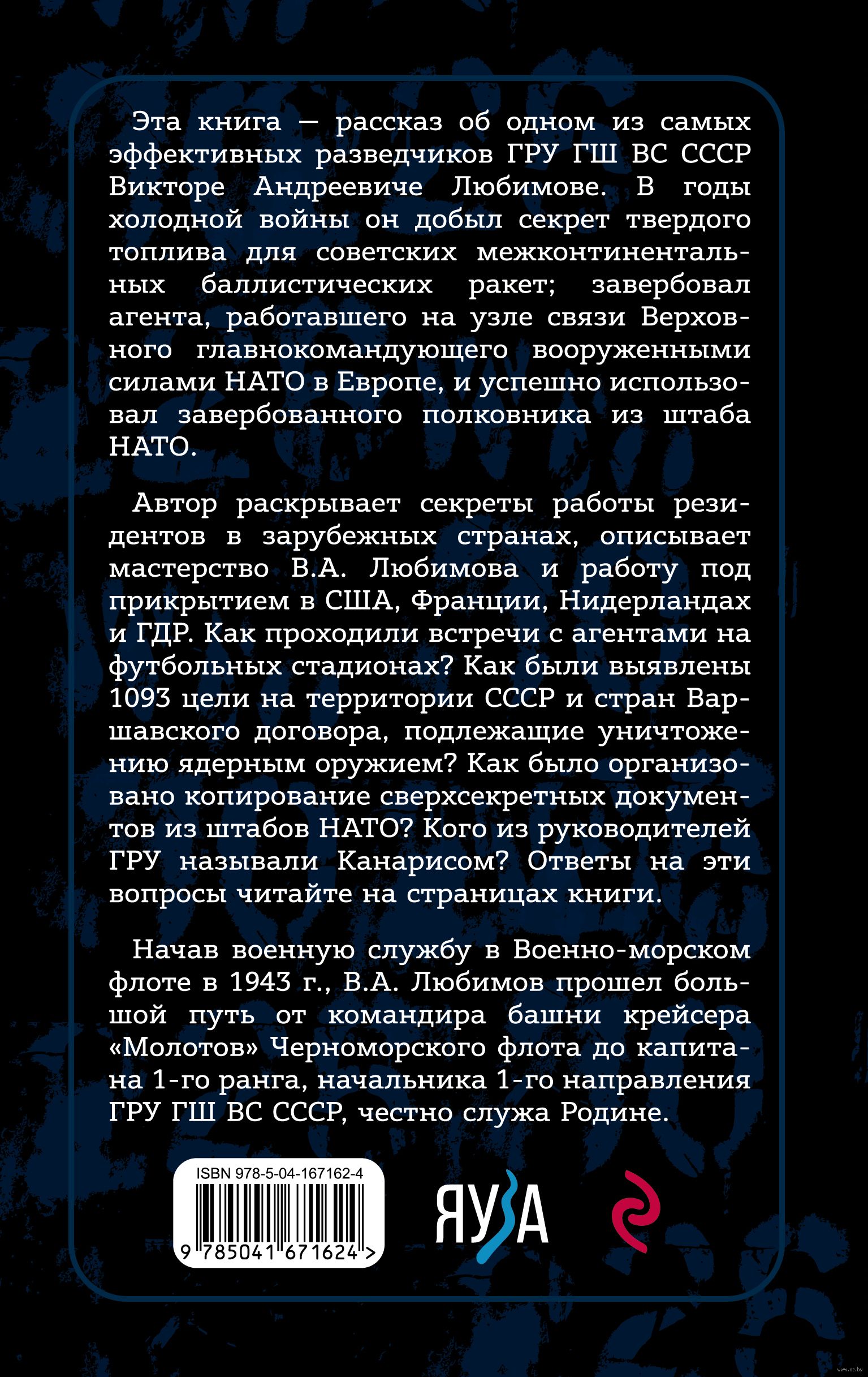 Автор раскрывает секреты работы резидентов в зарубежных странах, описывает мастерство В. А. Любимова и работу под прикрытием в США, Франции, Нидерландах и ГДР. Как проходили встречи с агентами на футбольных стадионах? Как были выявлены 1093 цели на территории СССР и стран Варшавского договора, подлежащие уничтожению ядерным оружием? Как было организовано копирование сверхсекретных документов из штабов НАТО? Кого из руководителей ГРУ называли Канарисом? Ответы на эти вопросы читайте на страницах книги.
