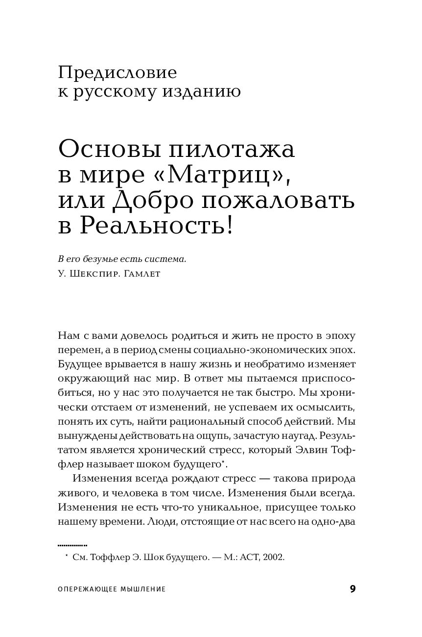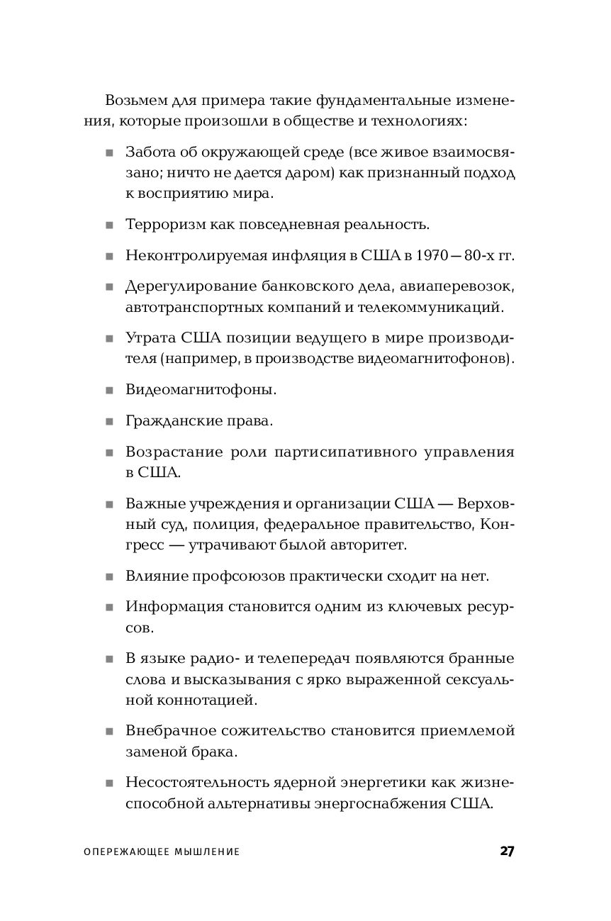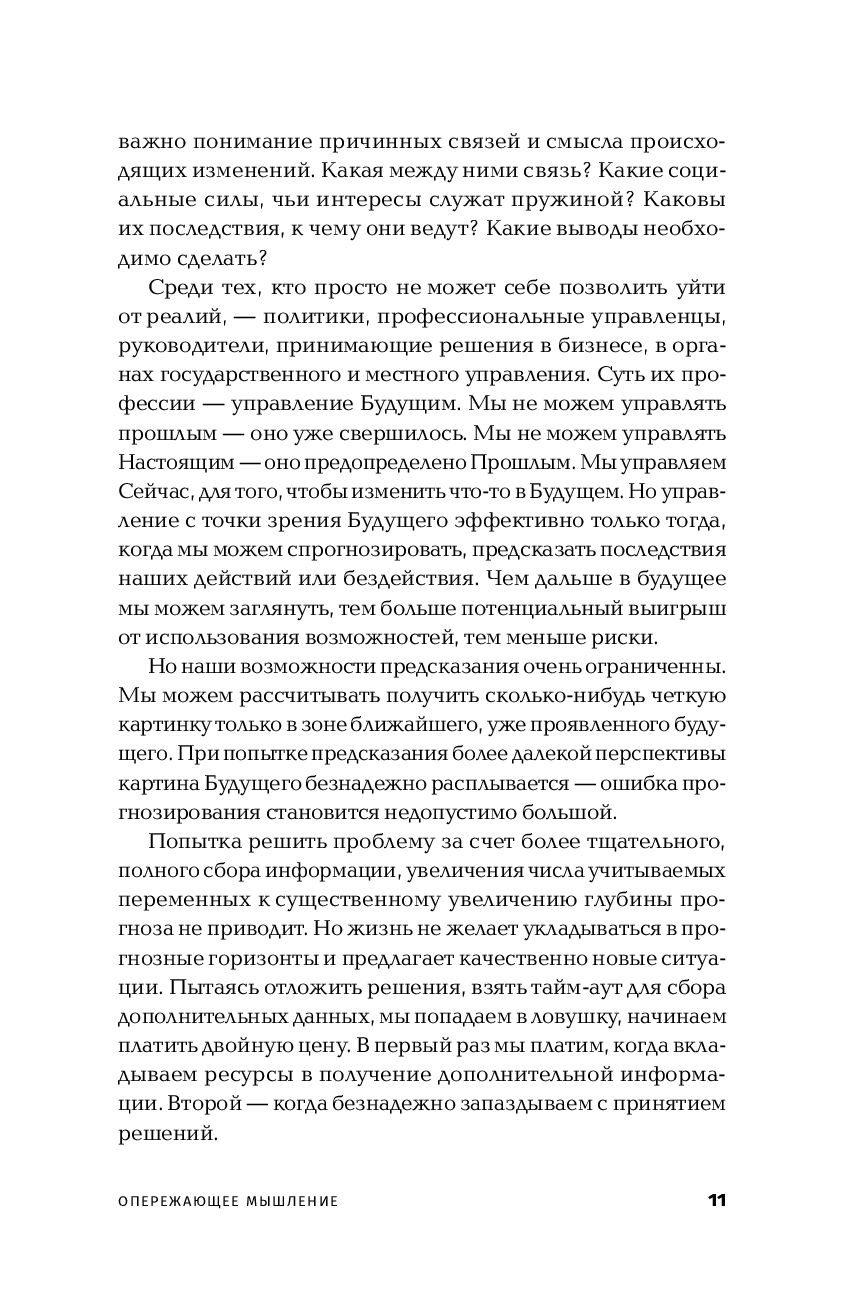 Управлять прошлым нельзя: оно уже безвозвратно прошло. Управлять настоящим – значит просто реагировать на события. Управлять можно только будущим, но для этого надо уметь его предвидеть: какие новые продукты появятся через несколько лет, как будет вести себя рынок, какие новые возможности и угрозы могут возникнуть. Умение заметить нарождающуюся тенденцию раньше других, развить опережающее мышление – ключевой навык современного успешного руководителя, политика, ученого.