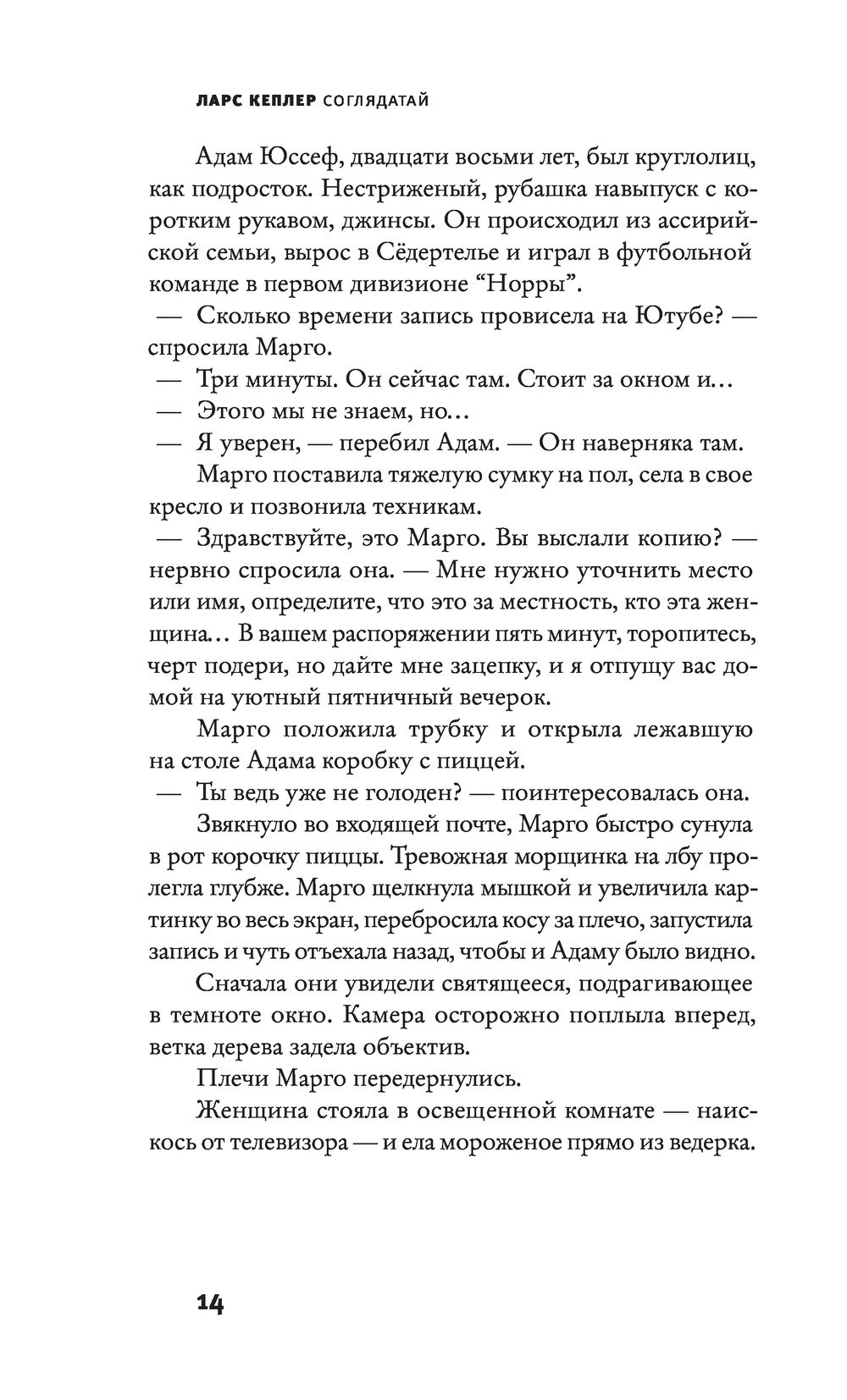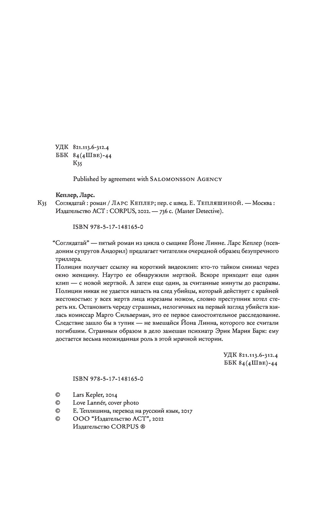 "Соглядатай" – пятый роман супругов Андорил, пишущих под псевдонимом Ларс Кеплер. Как и в остальных детективах из цикла о Йоне Линне, в "Соглядатае" Кеплер ставит читателя в затруднительное положение: очень страшно читать, но слишком интересно узнать, что же случится дальше.