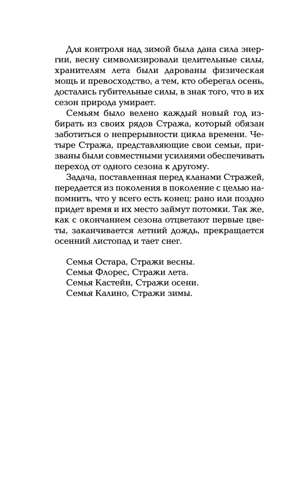 Блум родилась в семье хранителей Зимнего дома. Ее силы не проявлялись до тех пор, пока нынешнего Стража зимы не обнаружили мертвым. Теперь девушка должна передать амулет времен года наступающему сезону – весне. Но Блум еще не подозревает, что одной встречи и одного поцелуя будет достаточно, чтобы подвергнуть опасности не только собственную жизнь, но и весь мир.