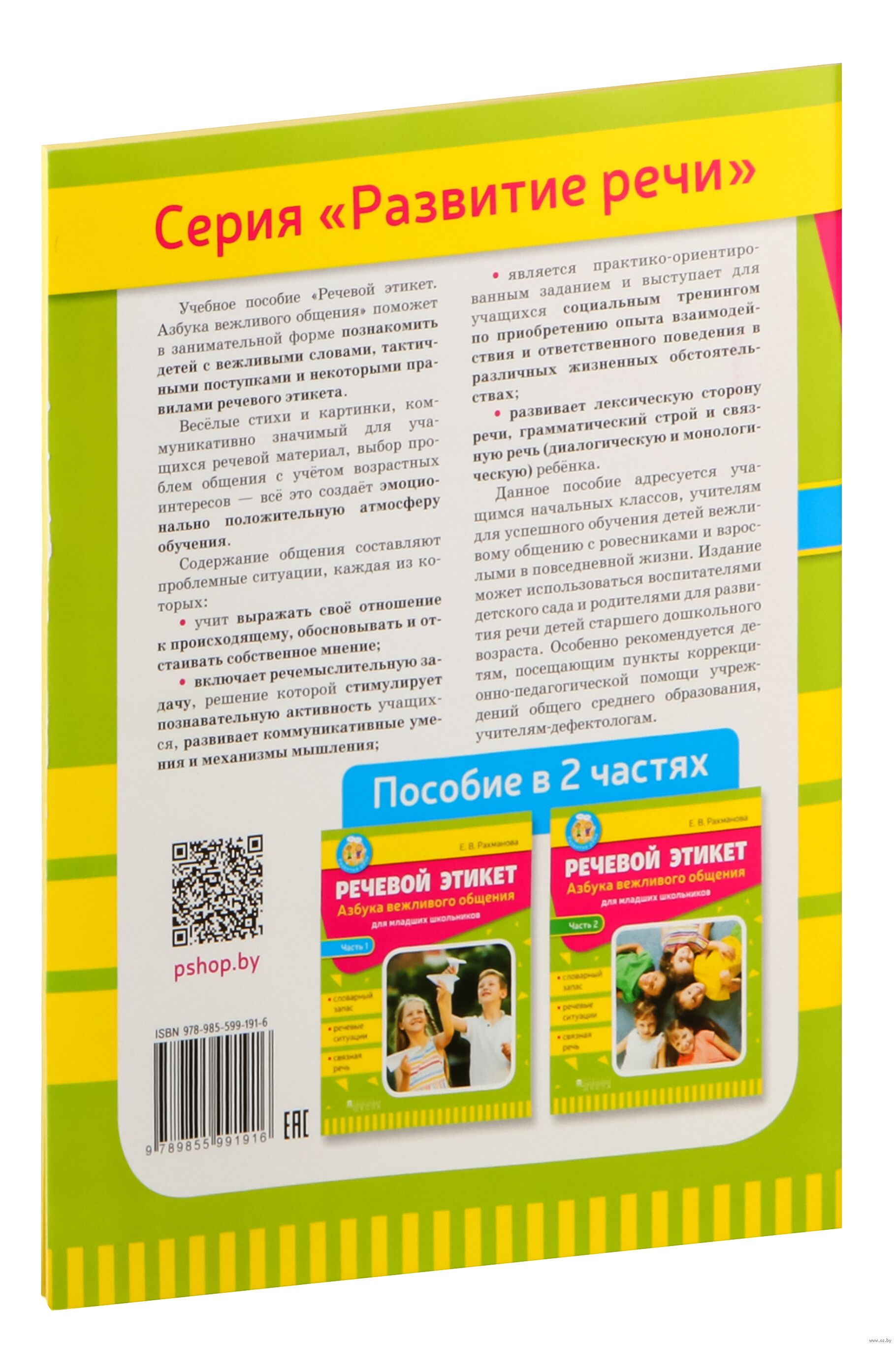 Учебное пособие "Речевой этикет. Азбука вежливого общения" поможет в занимательной форме познакомить детей с вежливыми словами, тактичными поступками и некоторыми правилами речевого этикета. Весёлые стихи и картинки, коммуникативно значимый для учащихся речевой материал, выбор проблем общения с учётом возрастных интересов – всё это создаёт эмоционально положительную атмосферу обучения. Содержание общения составляют проблемные ситуации, каждая из которых: