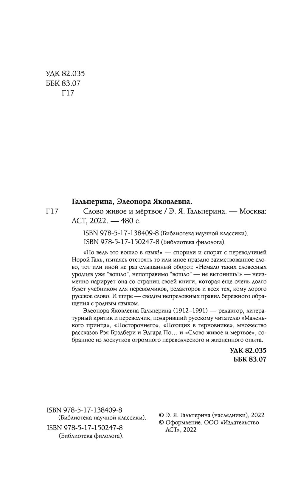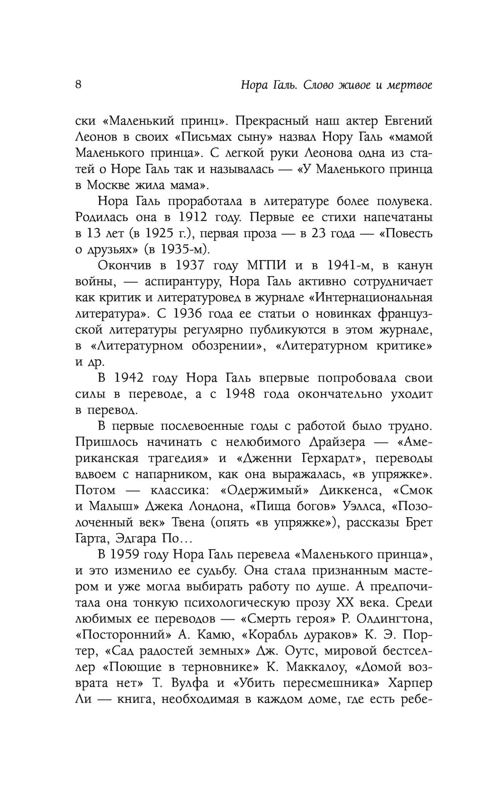 Элеонора Яковлевна Гальперина (1912-1991) – редактор, литературный критик и переводчик, подаривший русскому читателю "Маленького принца", "Постороннего", "Поющих в терновнике", множество рассказов Рэя Брэдбери и Эдгара По... и "Слово живое и мертвое", собранное из лоскутков огромного переводческого и жизненного опыта.
