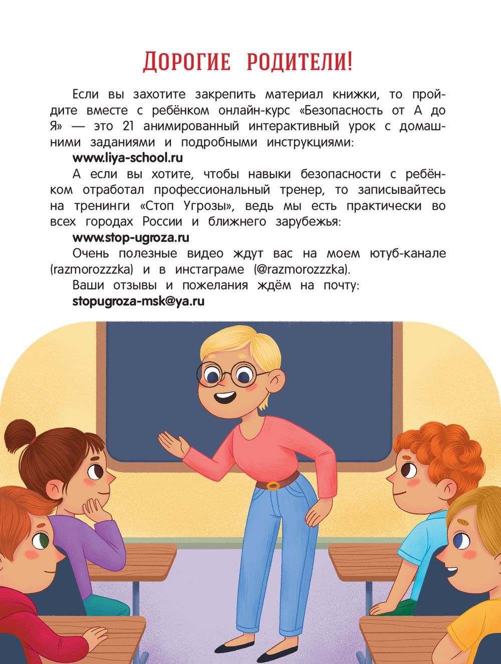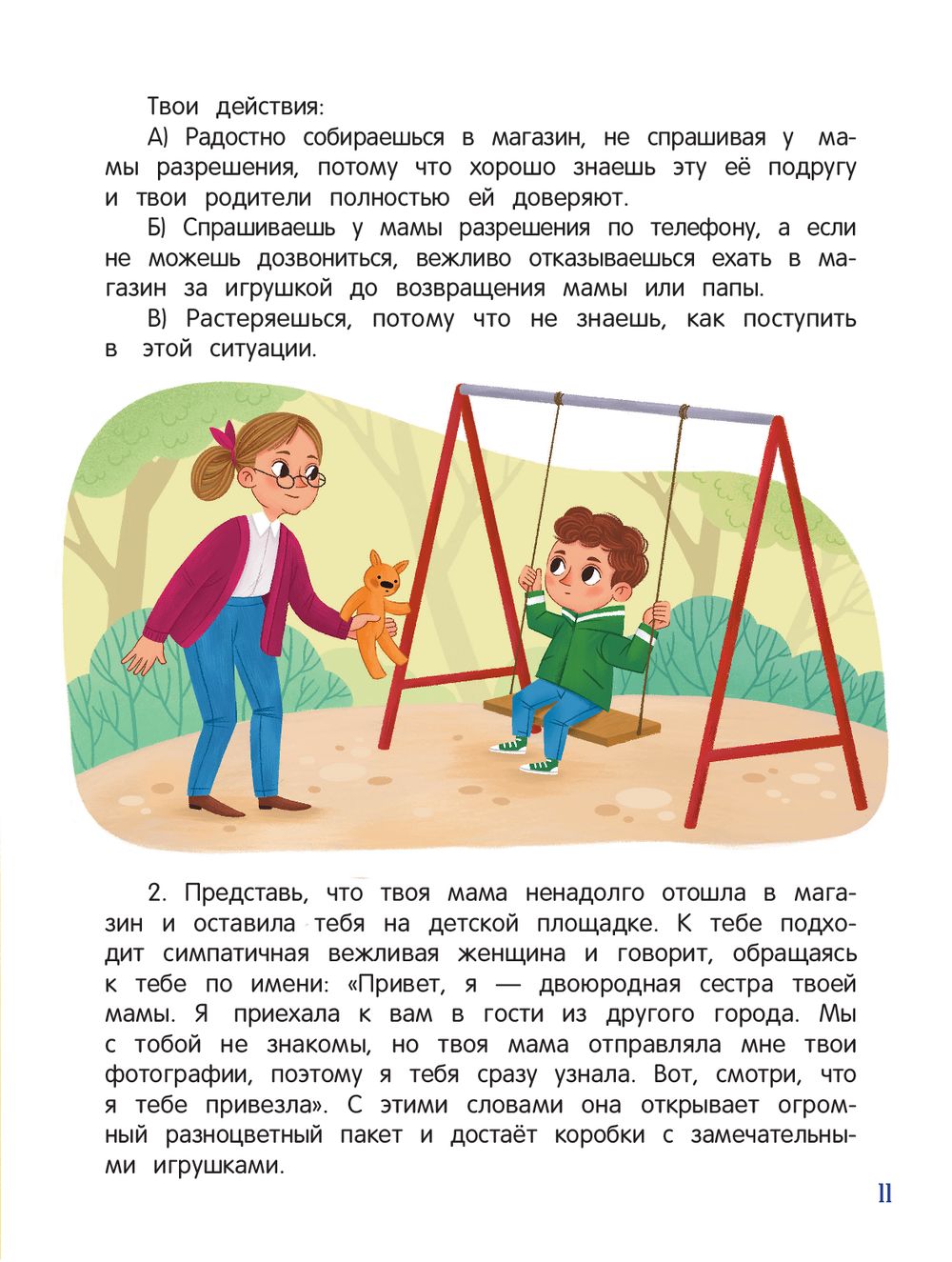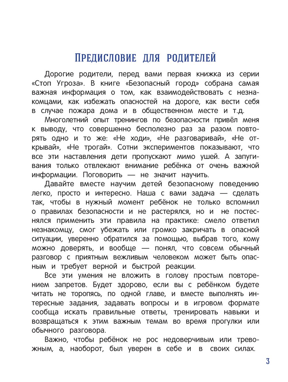 Перед вами книга, которая научит ребёнка распознавать потенциально опасные ситуации и избегать их, а в случае возникновения реальной угрозы – не растеряться и правильно среагировать. Наша с вами задача – сделать так, чтобы в нужный момент ребёнок не только вспомнил о правилах безопасности и не растерялся, но и не постеснялся применить эти правила на практике: смело ответил незнакомцу, смог убежать или громко закричать в опасной ситуации, уверенно обратился за помощью, выбрав того, кому можно доверять, и вообще – понял, что обычный разговор с приятным вежливым человеком может быть опасным и требует верной и быстрой реакции.