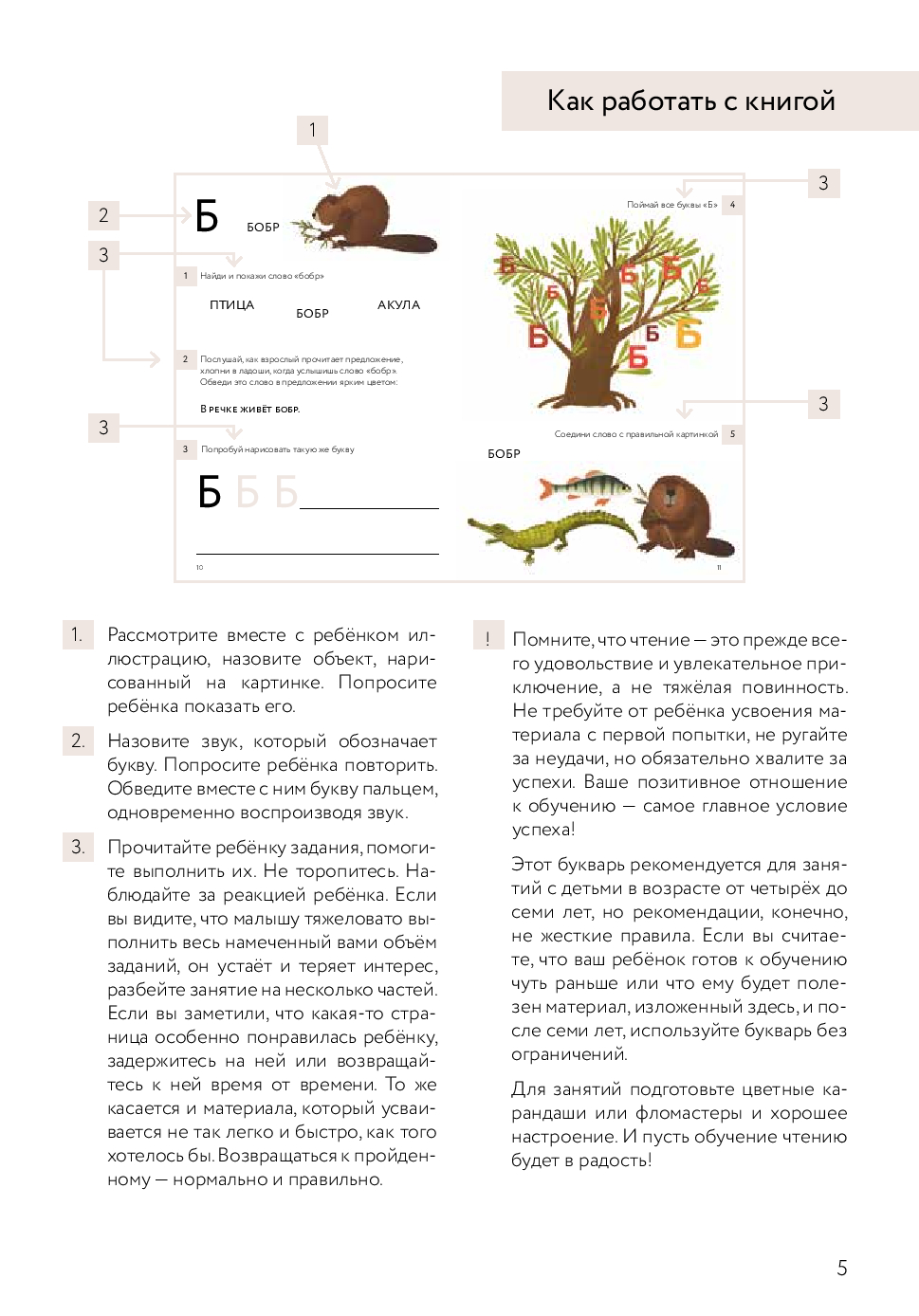 В букваре большое количество практических заданий, составленных с учетом особенностей детской психологии. С их помощью вы эффективно закрепите пройденный материал и превратите обучение чтению в интересную игру, попутно расширяя познания ребенка и об окружающем мире.