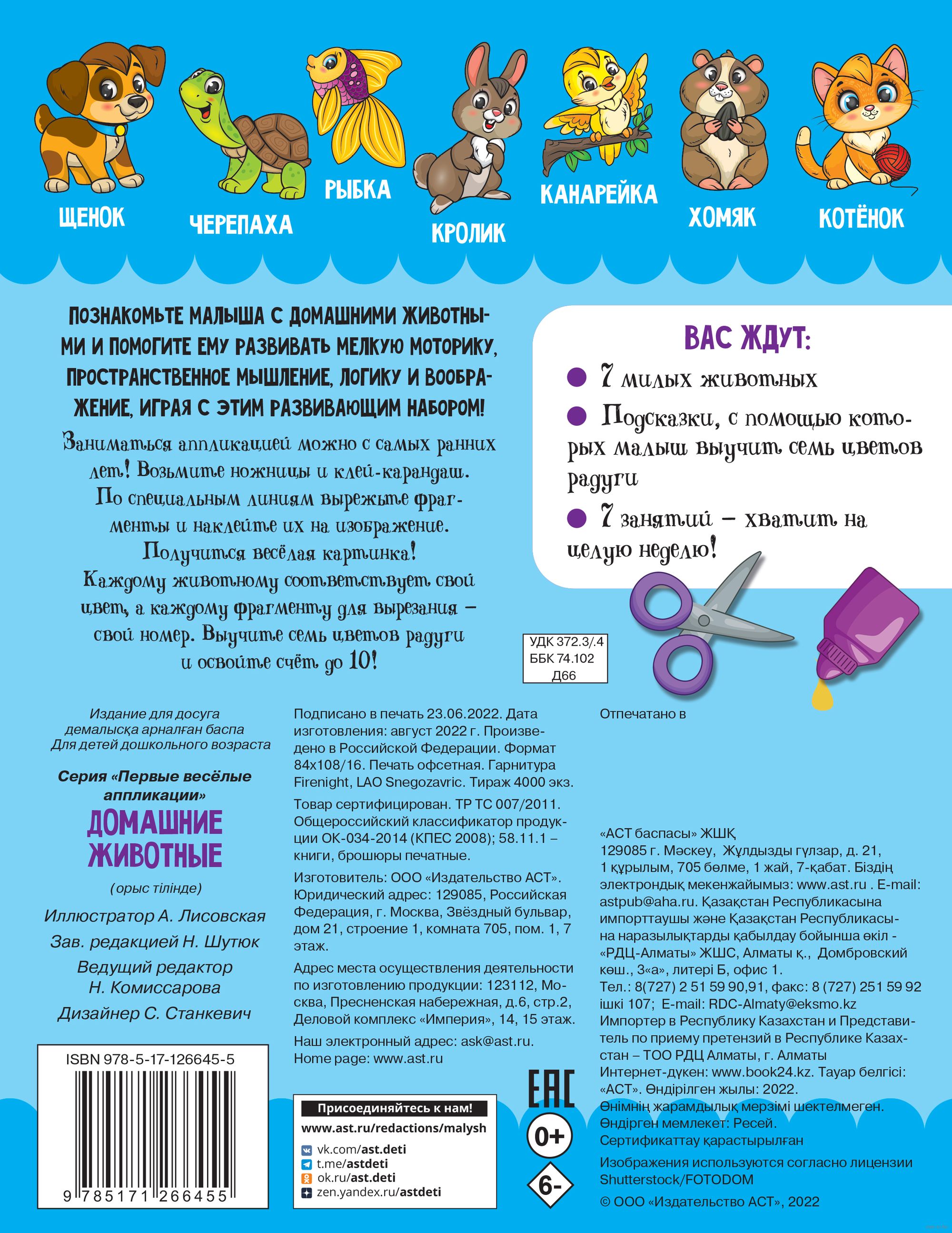 Познакомьте малыша с домашними животными и помогите ему развивать мелкую моторику, пространственное мышление, логику и воображение, играя с этим развивающим набором! Вас ждут 7 милых животных, а также подсказки, с помощью которых малыш выучит семь цветов радуги и счет до 10. В книге 7 занятий – хватит на целую неделю!