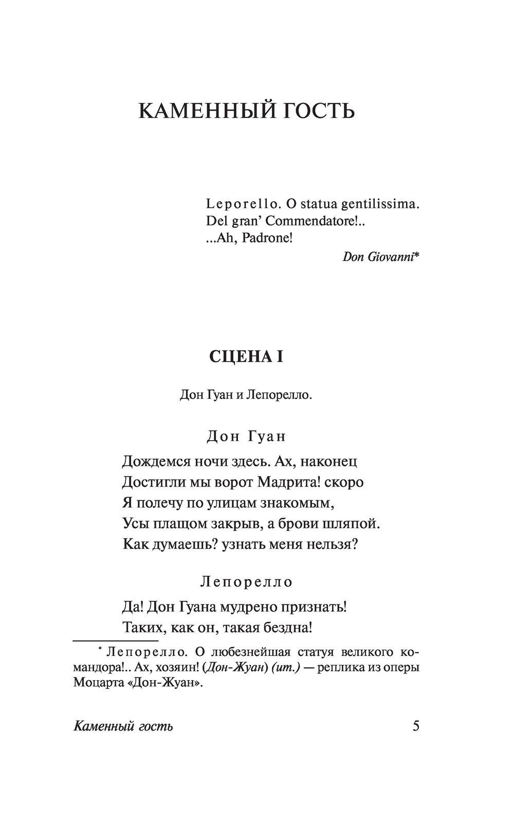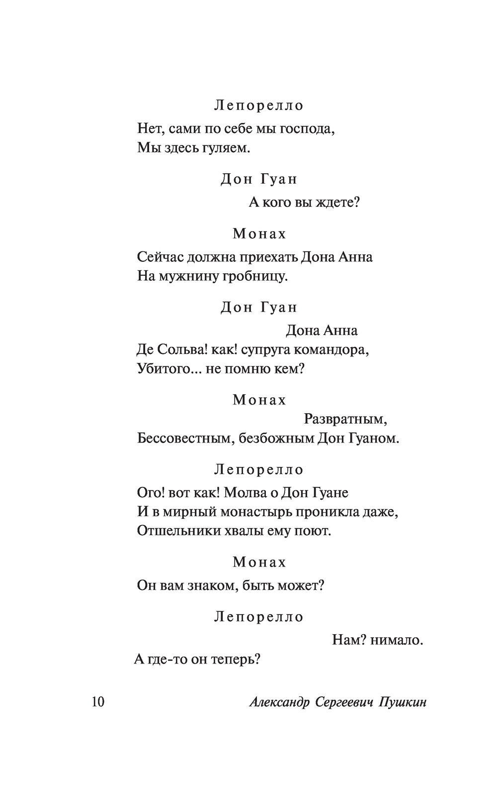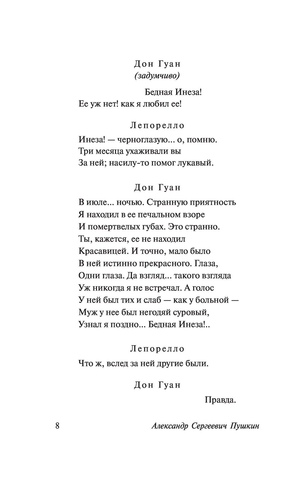Блестящая драма "Каменный гость" – одна из самых талантливых в истории литературы интерпретаций легенды о Дон Жуане – и увлекательная сказка-баллада "Жених", озорные, веселые поэмы "Гавриилиада" и "Домик в Коломне" соседствуют с ранними романтическими творениями Пушкина и поэтическими, драматургическими и прозаическими работами, оставшимися, к несчастью, незавершенными, – такими, как изумительная по красоте пьеса "Русалка" или остроумная сатирическая "История села Горюхина".