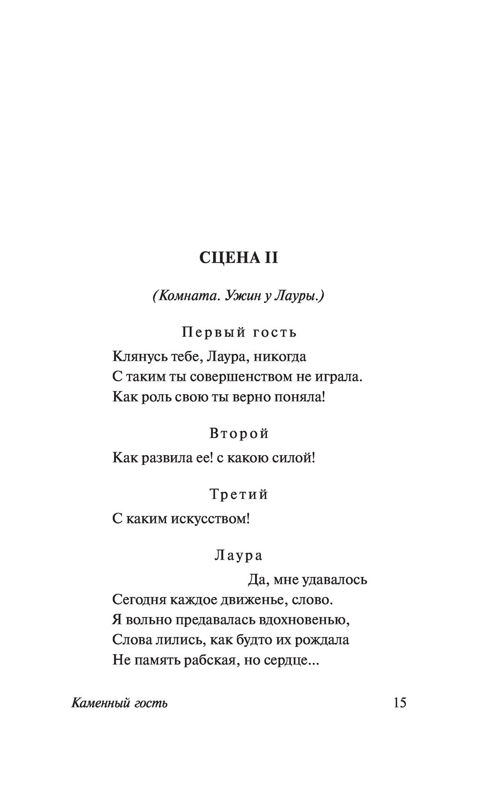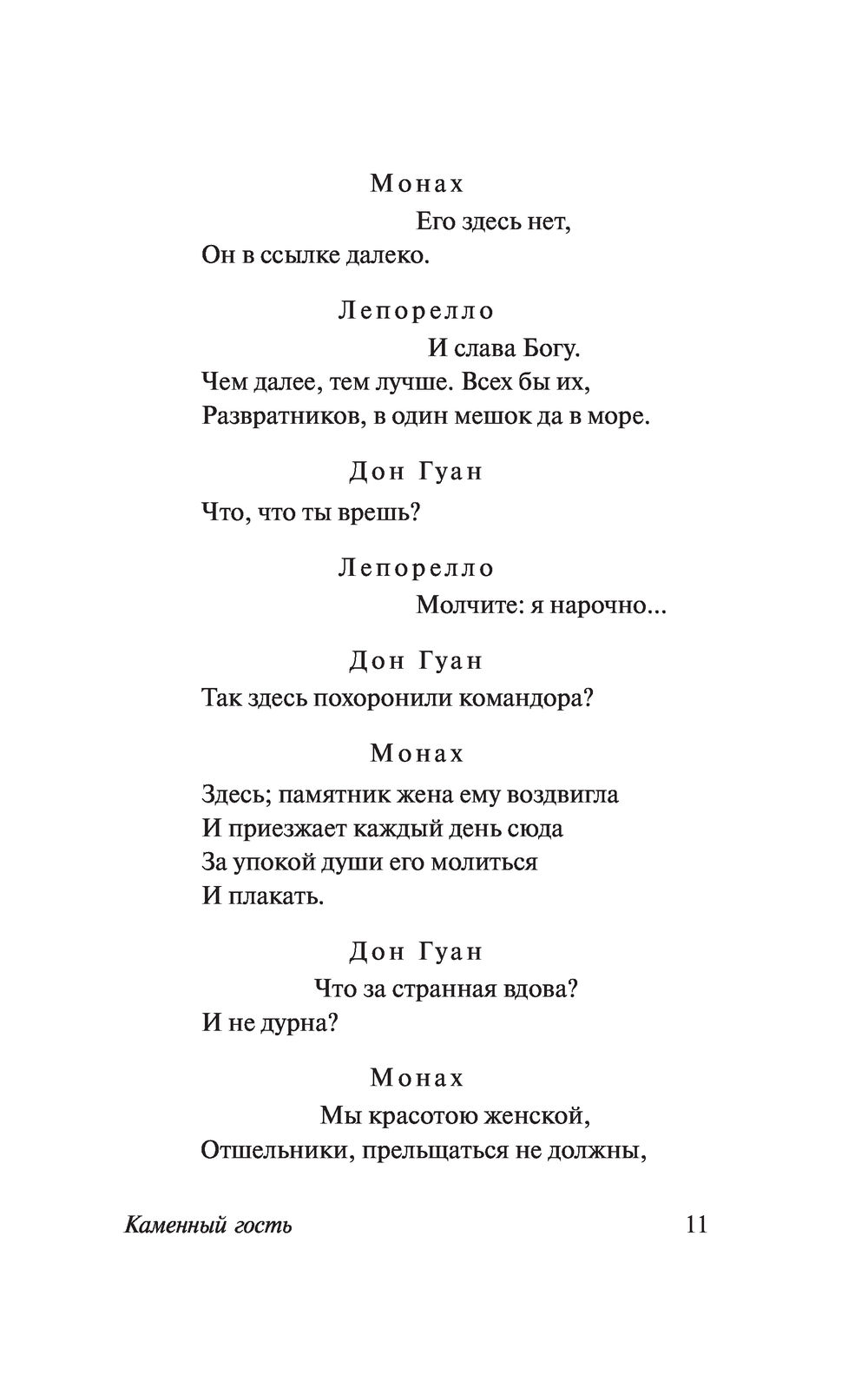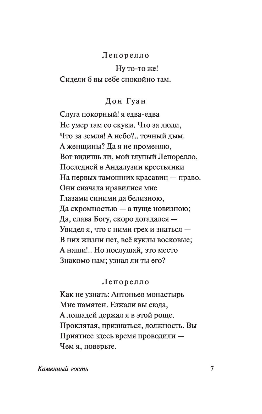 Блестящая драма "Каменный гость" – одна из самых талантливых в истории литературы интерпретаций легенды о Дон Жуане – и увлекательная сказка-баллада "Жених", озорные, веселые поэмы "Гавриилиада" и "Домик в Коломне" соседствуют с ранними романтическими творениями Пушкина и поэтическими, драматургическими и прозаическими работами, оставшимися, к несчастью, незавершенными, – такими, как изумительная по красоте пьеса "Русалка" или остроумная сатирическая "История села Горюхина".