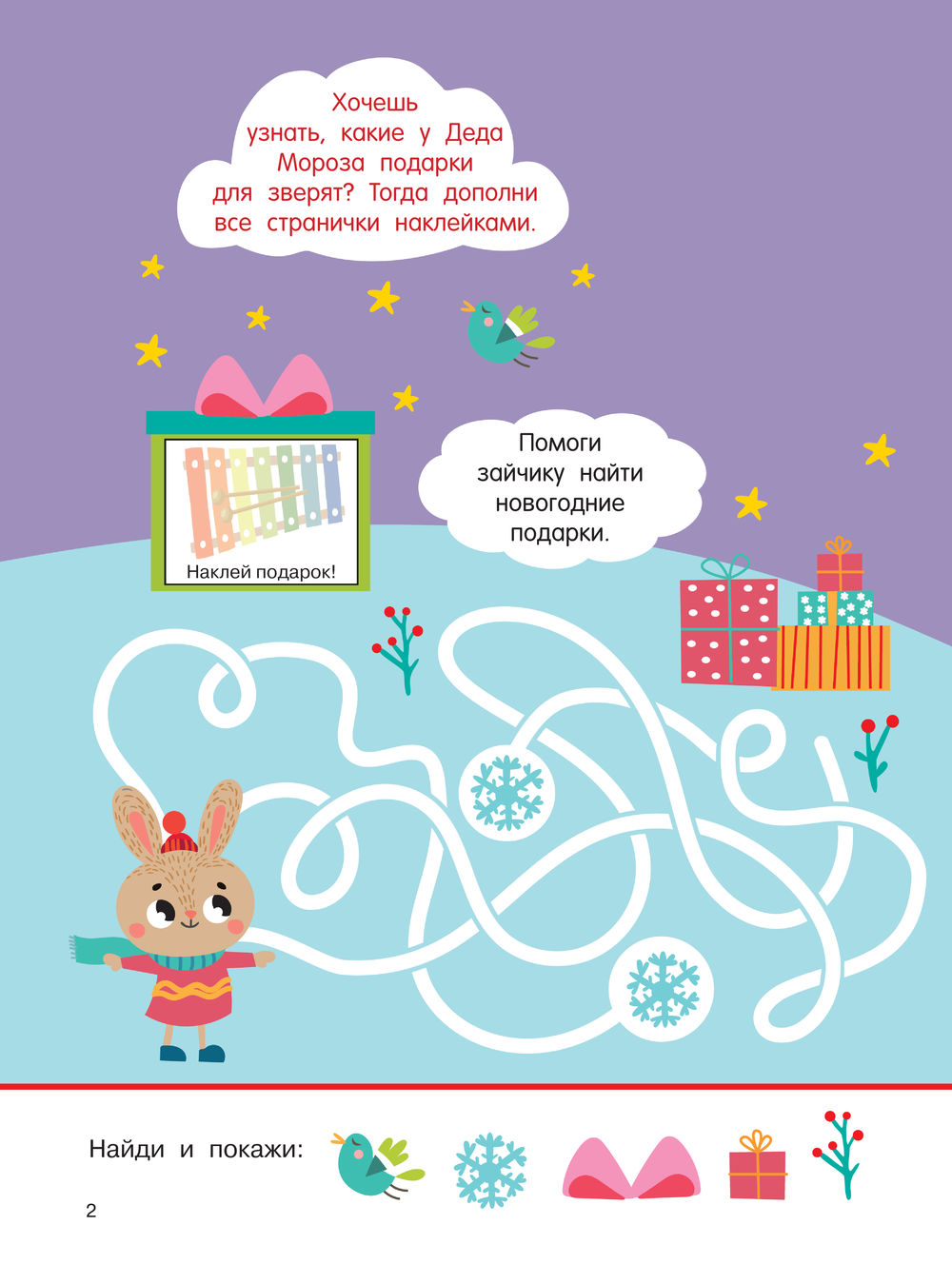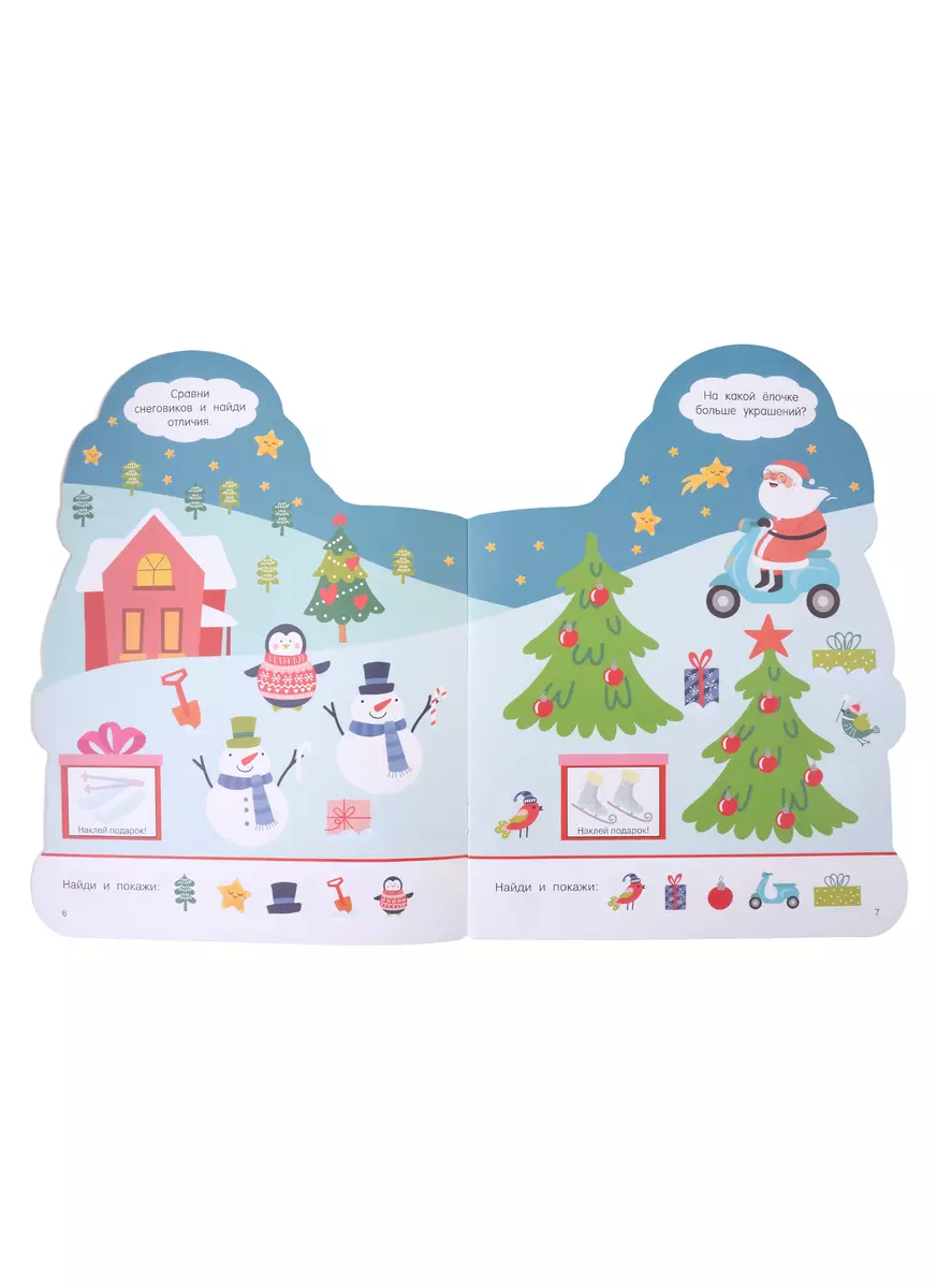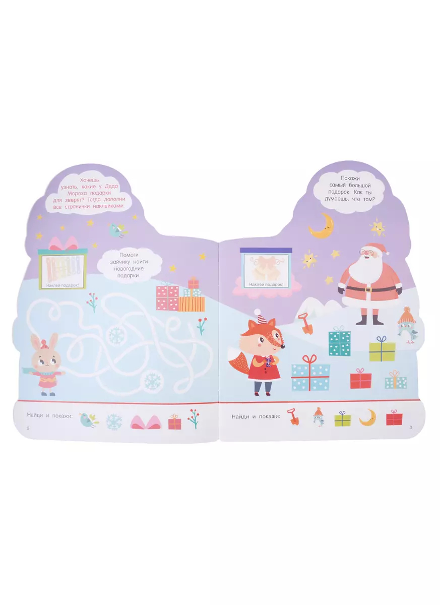 Книжка с фигурной вырубкой плюс коллекция новогодних наклеек станет прекрасным подарком малышам, с нетерпением ожидающим Нового года. Замечательные иллюстрации позволят погрузиться в атмосферу зимних чудес и волшебства. На последней странице книжки бонус – пазлы-наклейки, из которых нужно сложить картинку.
