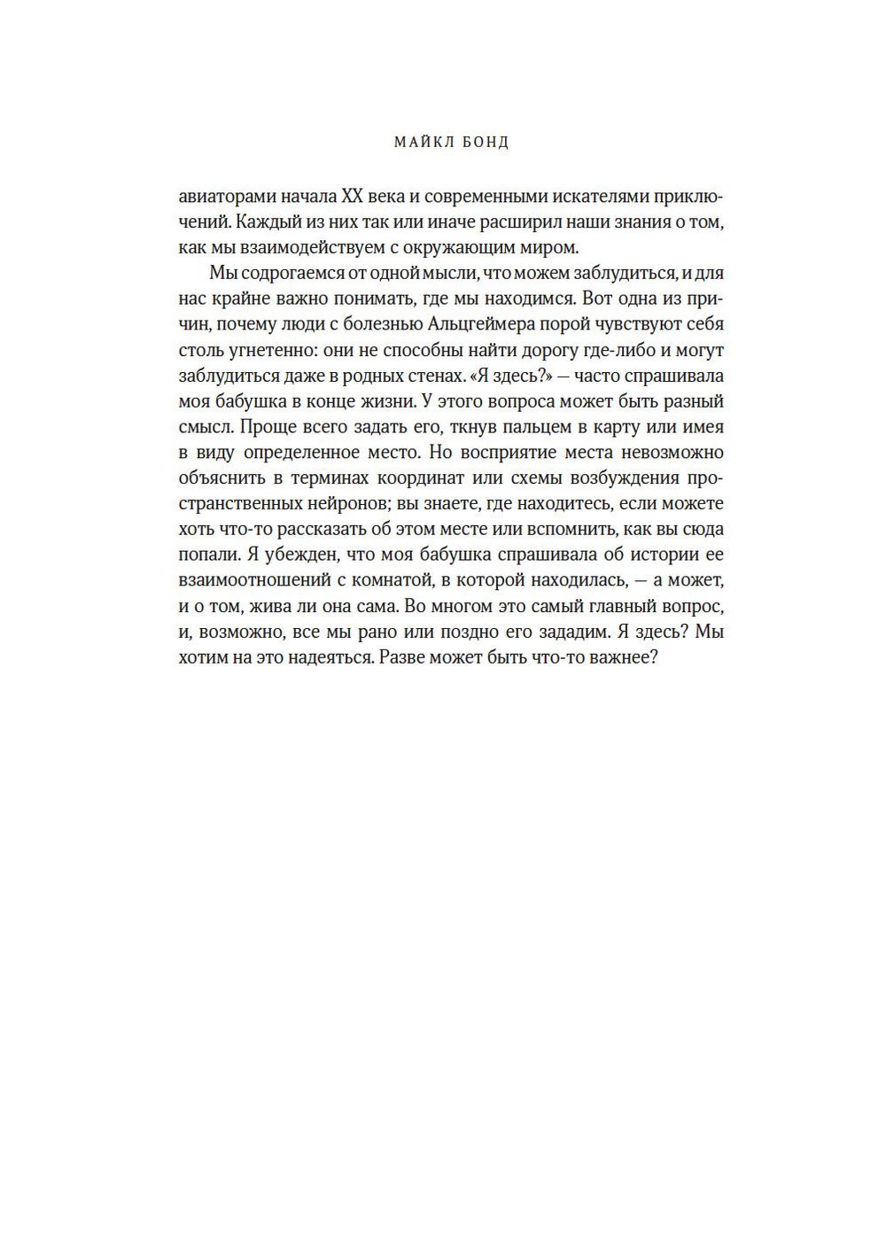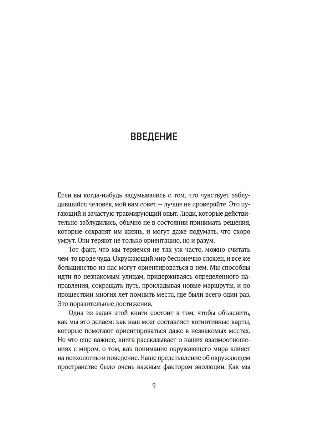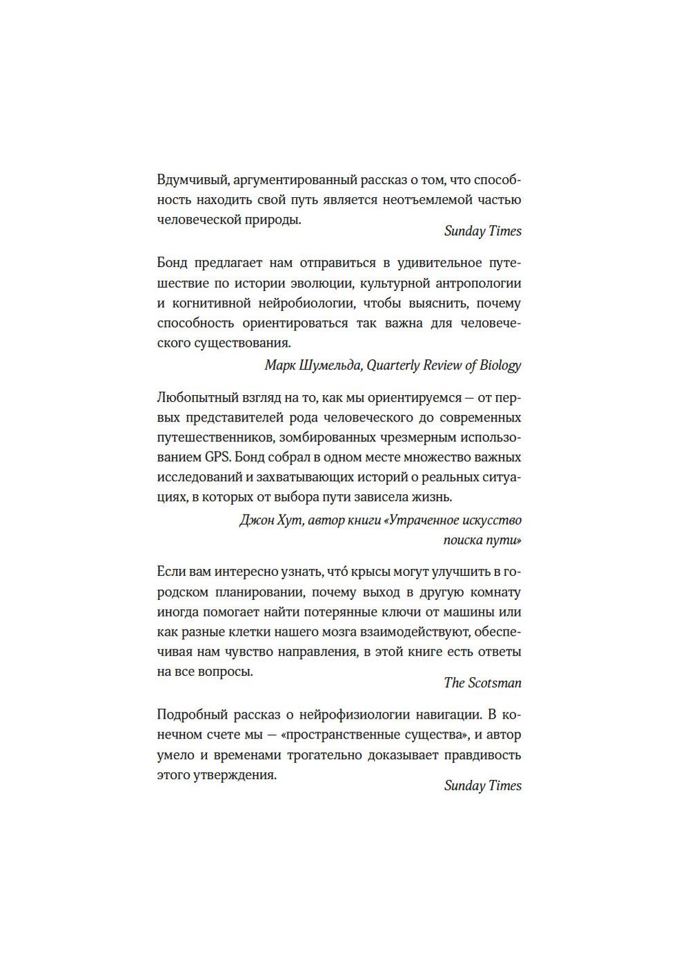 "Тот факт, что мы теряемся не так уж часто, можно считать чем-то вроде чуда. Окружающий мир бесконечно сложен, и все же большинство из нас могут ориентироваться в нем. Мы способны идти по незнакомым улицам, придерживаясь определенного направления, сокращать путь, прокладывая новые маршруты, и по прошествии многих лет помнить места, где были всего один раз. Это поразительные достижения. Одна из задач этой книги состоит в том, чтобы объяснить, как мы это делаем: как наш мозг составляет когнитивные карты, которые помогают ориентироваться даже в незнакомых местах. Но что еще важнее, книга рассказывает о наших взаимоотношениях с миром, о том, как понимание окружающего мира влияет на психологию и поведение". (Майкл Бонд)