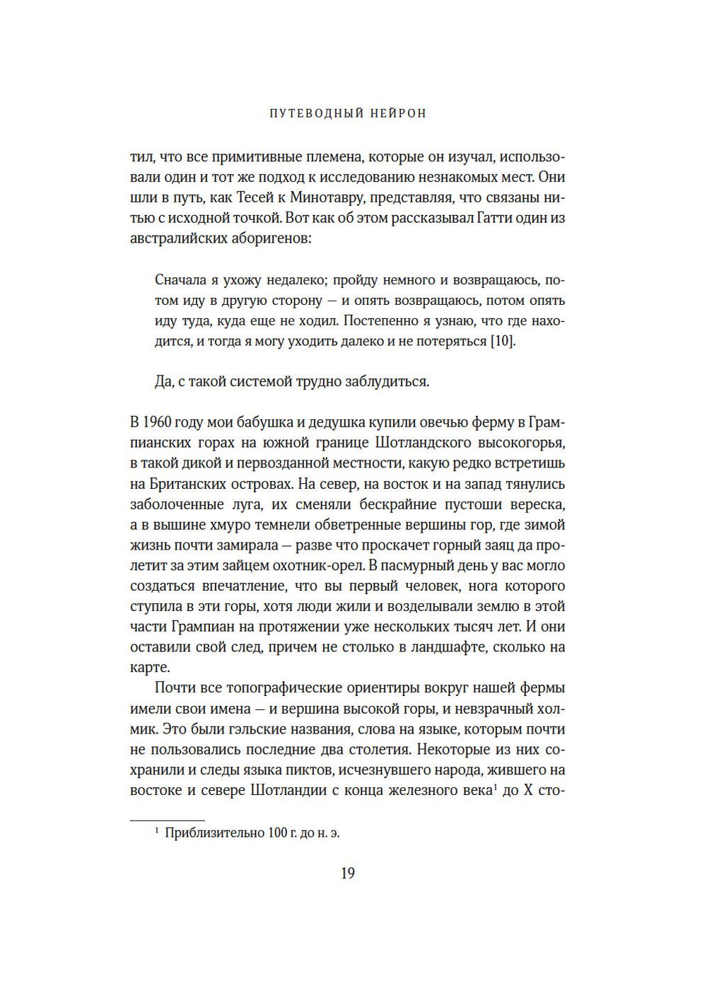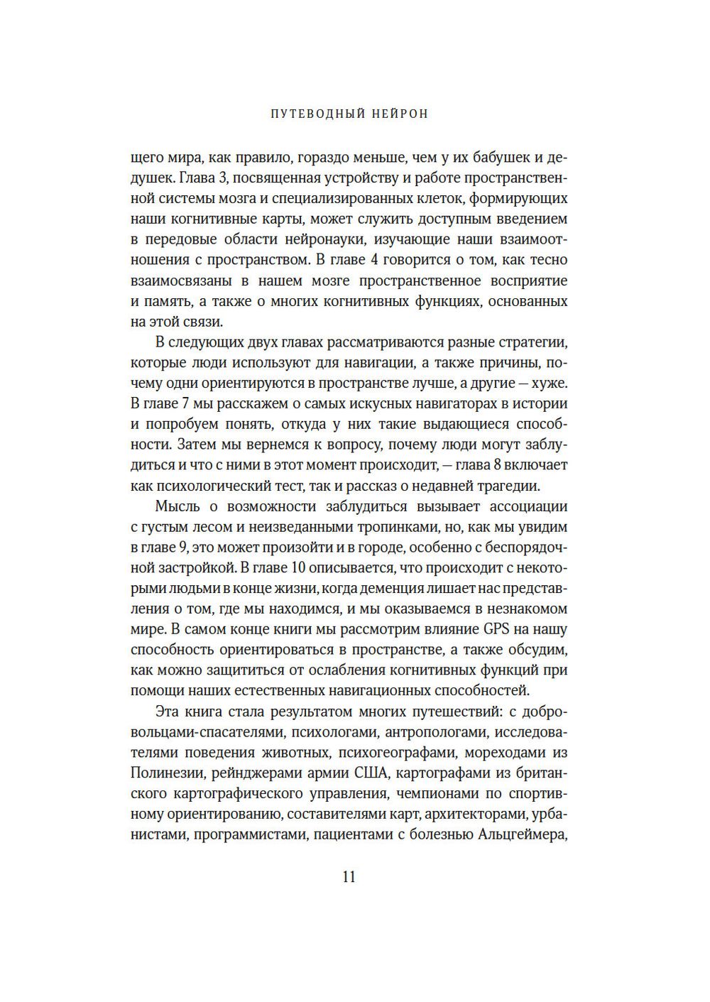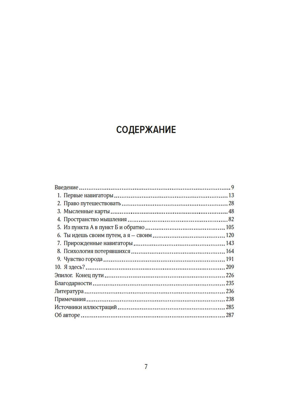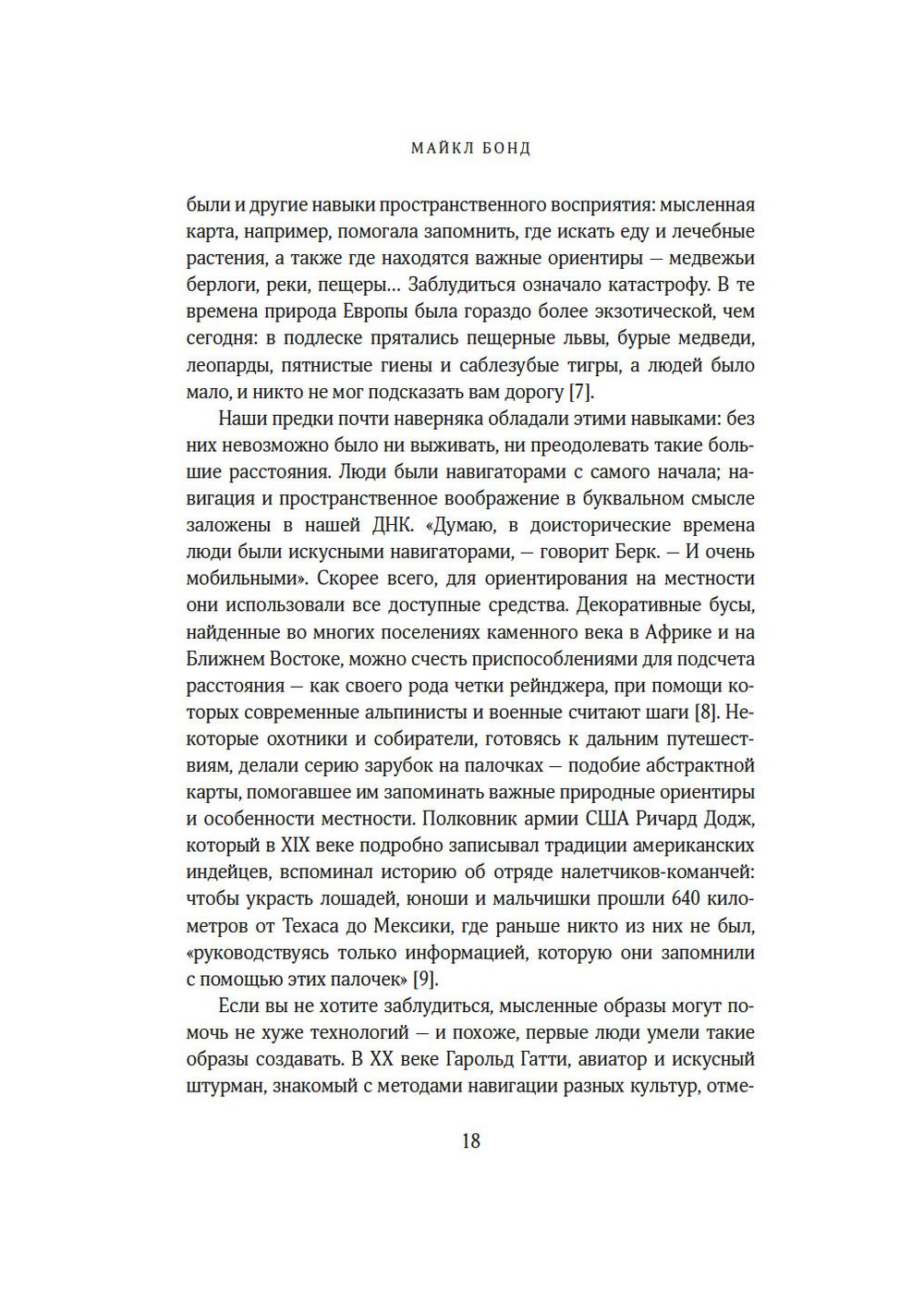 Навыки навигации глубоко укоренились в нашей биологии. Способность находить путь на большие расстояния в доисторические времена дала Homo sapiens эволюционное преимущество, позволяя исследовать самые отдаленные уголки планеты. Умение ориентироваться тесно связано с другими важными когнитивными функциями, такими как абстрактное мышление, воображение и память. Майкл Бонд обобщает результаты новейших исследований в области психологии, нейробиологии, этологии и антропологии и приводит примеры из опыта людей, чья профессия или род занятий так или иначе связаны с навигацией – мастеров спортивного ориентирования, летчиков, поисково-спасательных добровольцев, картографов, градостроителей и других. Результатом стало увлекательное погружение в тему ориентирования человека в естественной и искусственной среде с особым акцентом на рассмотрении нейробиологических основ этого важнейшего навыка.