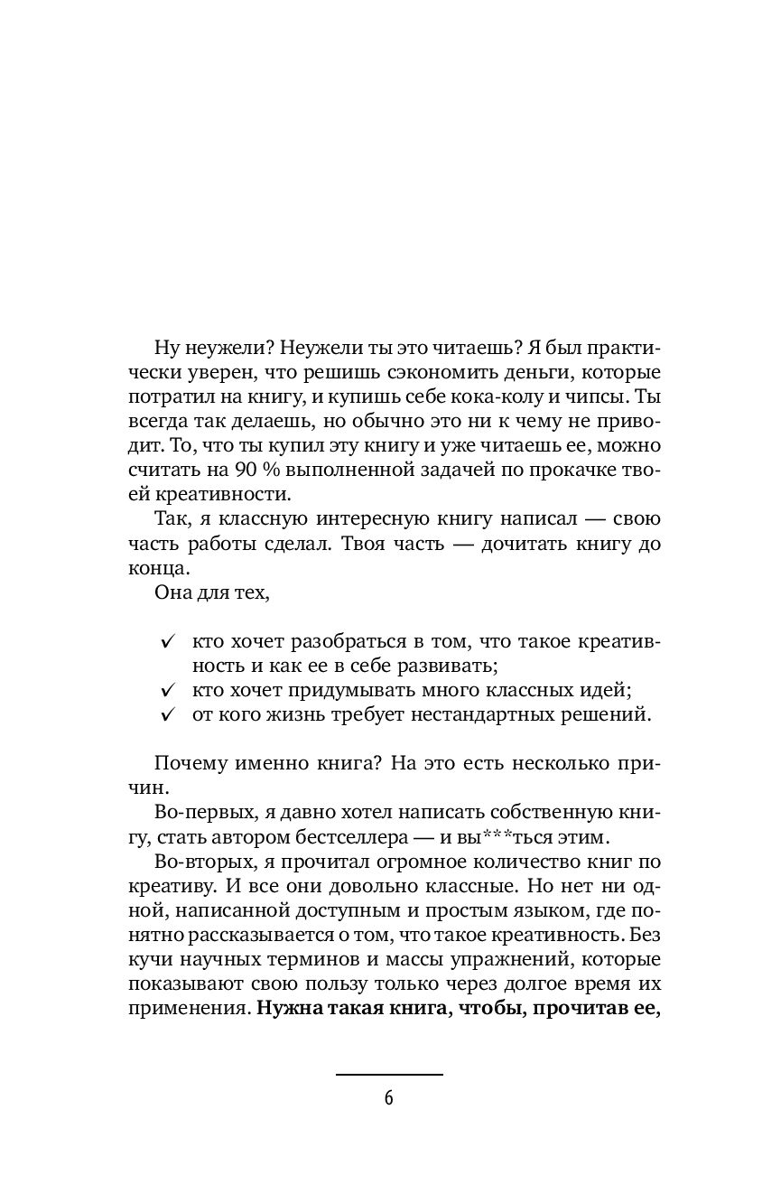 Эта книга будет одинаково полезна как тем, кто считает себя обделённым креативностью, но хочет развить этот навык, так и тем, кто уже считает себя креатором и стремится получить больше понимания этого процесса.