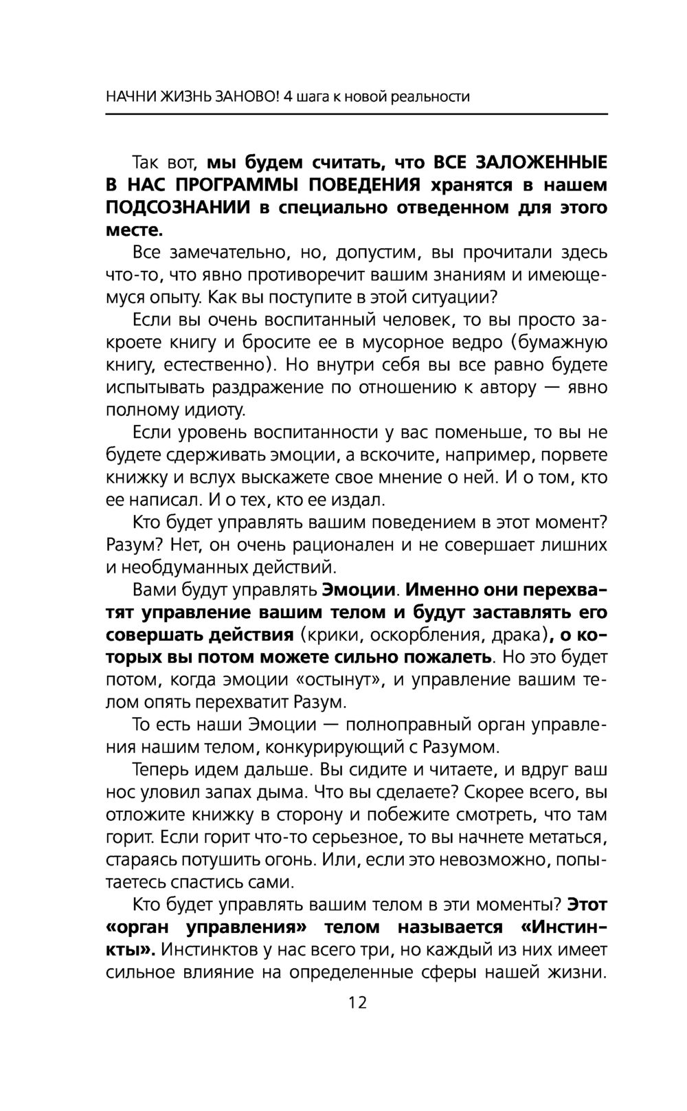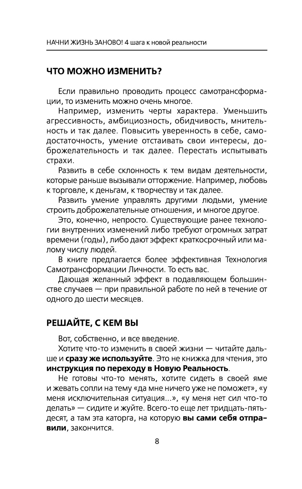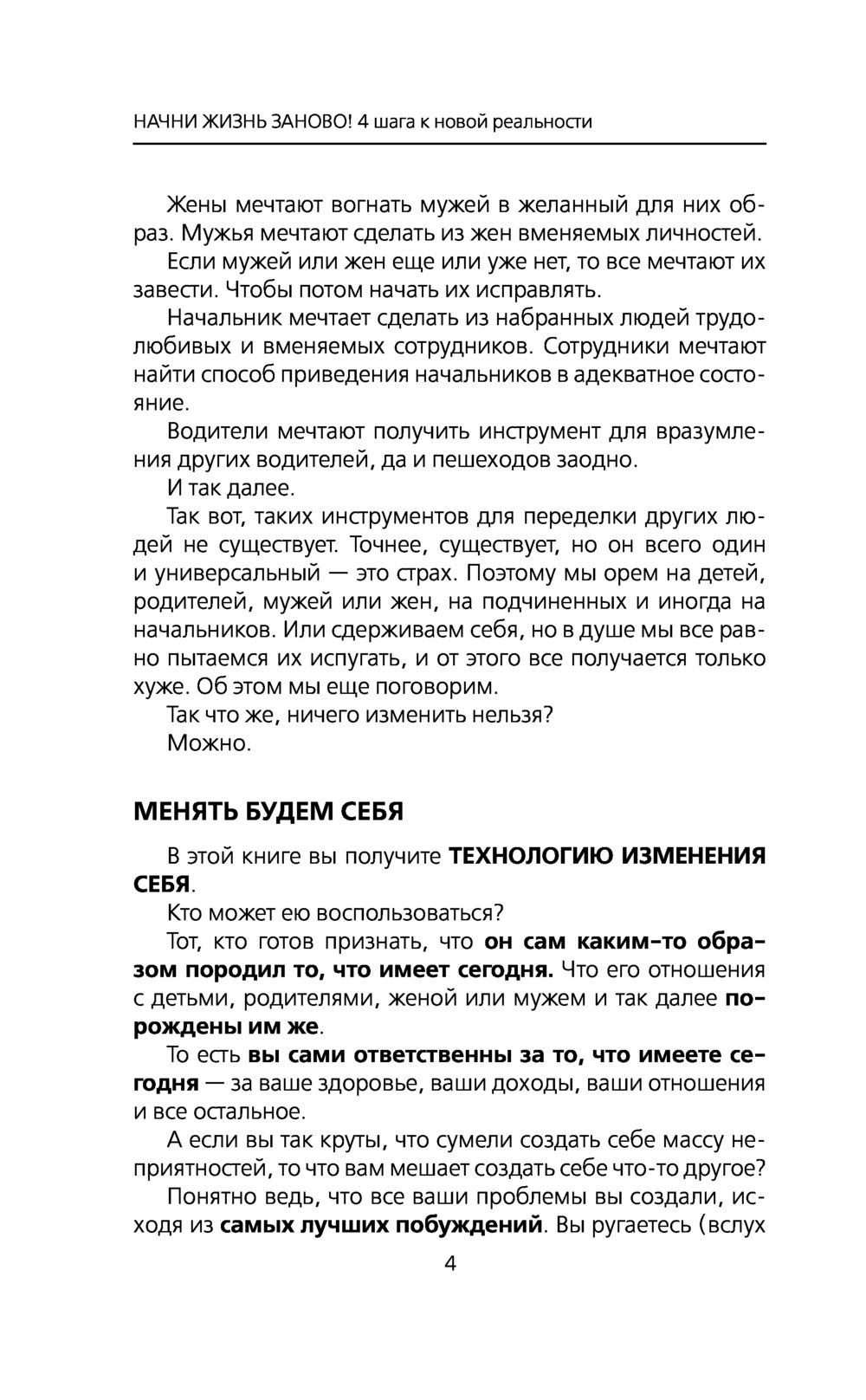Что мы будем менять? Не окружающий мир, не других людей, как бы вам этого ни хотелось. В книге "Начни жизнь заново! 4 шага к новой реальности" вы получите технологию изменения себя. Потому что именно вы ответственны за то, что имеете сегодня, – за ваше здоровье, доходы, отношения и все остальное. Это не книжка для чтения, а инструкция по переходу в новую реальность, по созданию пространства гармонии, внутреннего спокойствия, успешности и радости.
