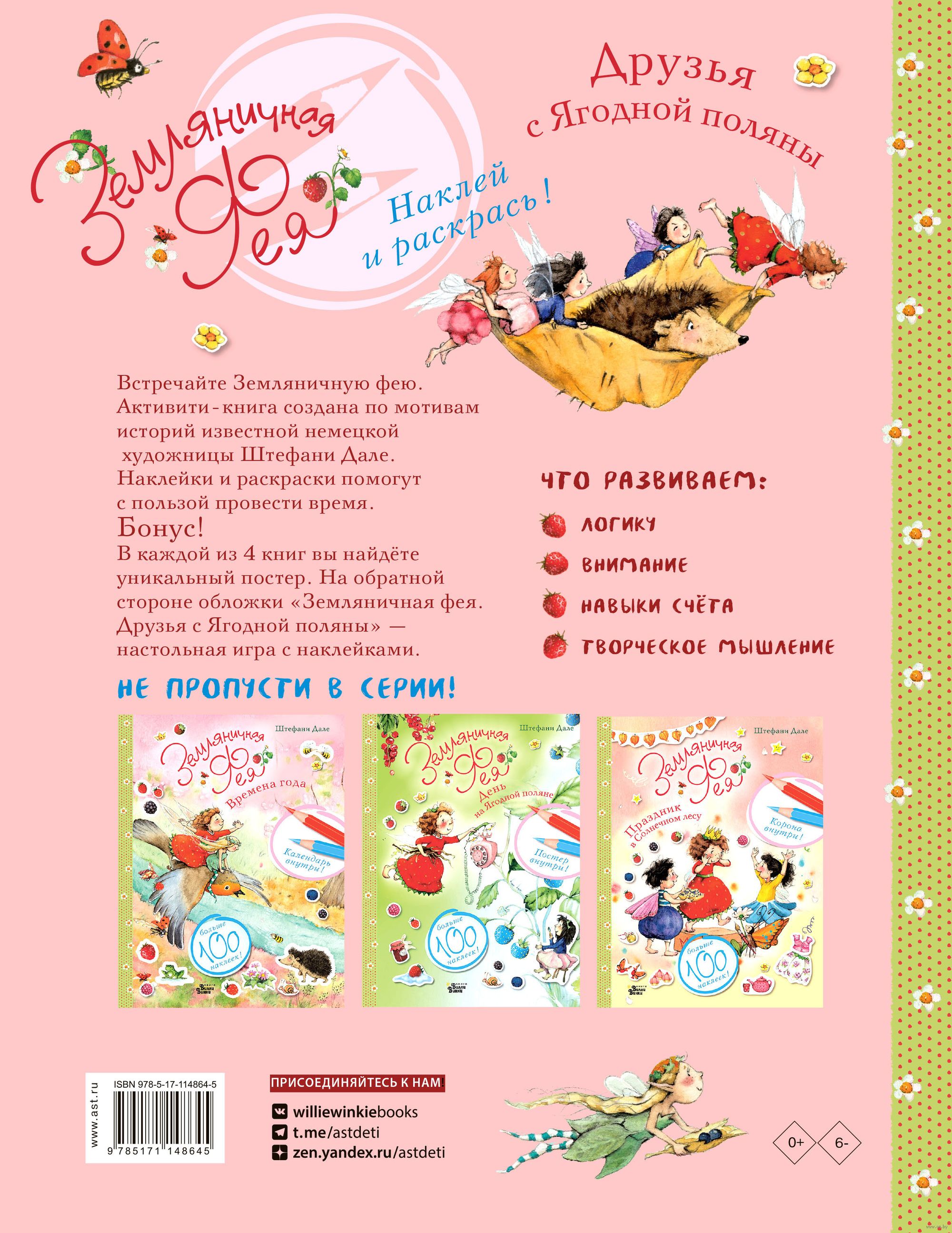 Раскраски и наклейки с популярным персонажем из серии книг о Земляничной фее увлекут ребенка. Бонус! В каждой из 4 книг вы найдете уникальный постер. На обратной стороне обложки "Земляничная фея. Друзья с Ягодной поляны" настольная игра с наклейками.