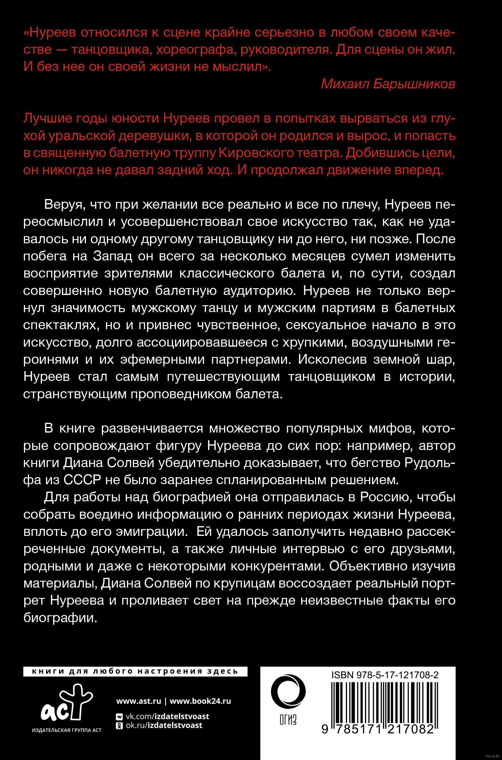 В книге развенчивается множество популярных мифов, которые сопровождают фигуру Нуреева до сих пор: например, автор книги Диана Солвей убедительно доказывает, что бегство Рудольфа из СССР не было заранее спланированным решением. Для работы над биографией она отправилась в Россию, чтобы собрать воедино информацию о ранних периодах жизни Нуреева, вплоть до его эмиграции. Ей удалось заполучить недавно рассекреченные документы, а также личные интервью с его друзьями, родными и даже с некоторыми конкурентами. Объективно изучив материалы, Диана Солвей по крупицам воссоздает реальный портрет Нуреева и проливает свет на прежде неизвестные факты его биографии.