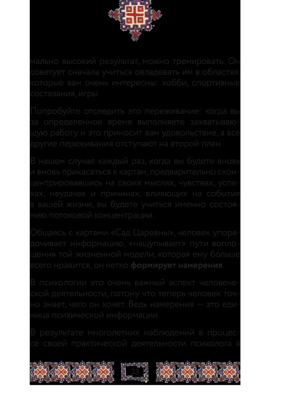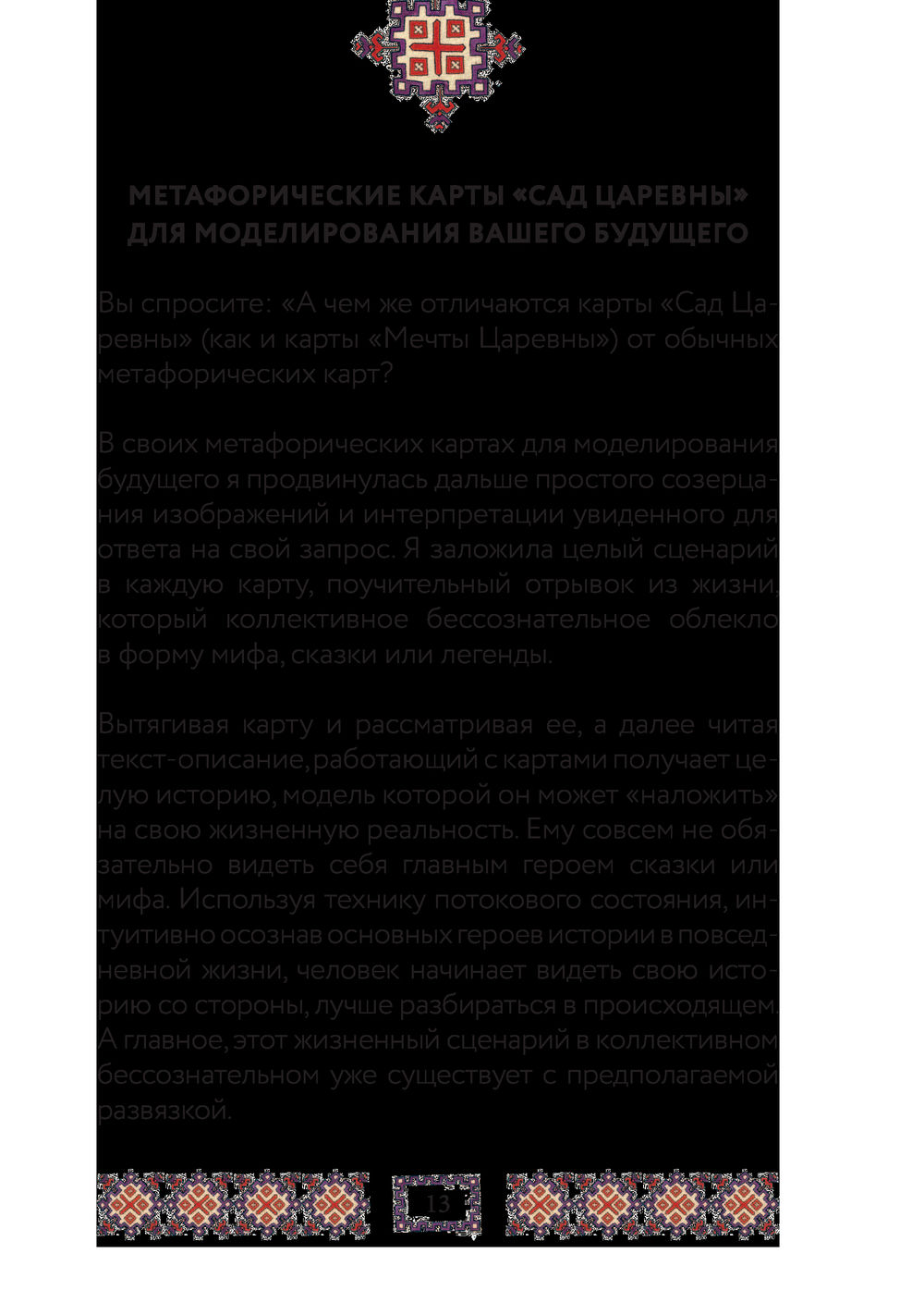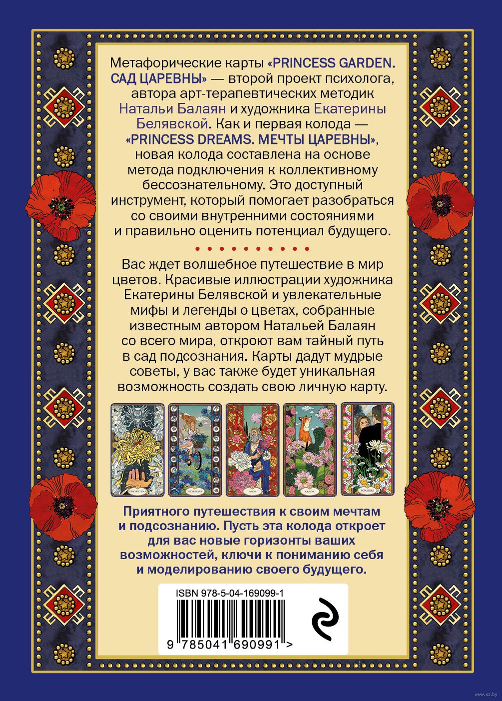 Метафорические карты "Princess Garden. Сад царевны" – второй проект психолога, автора арт-терапевтических методик Натальи Балаян и художника Екатерины Белявской. Как и первая колода – "Princess Dreams. Мечты царевны", новая колода составлена на основе метода подключения к коллективному бессознательному. Вас ждет волшебное путешествие в мир цветов. Красивые иллюстрации художника Екатерины Белявской и увлекательные мифы и легенды о цветах, собранные известным автором Натальей Балаян со всего мира, откроют вам тайный путь в сад подсознания.