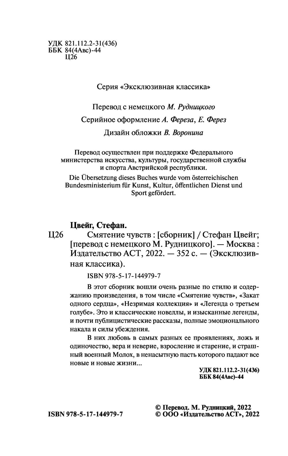 В этот сборник вошли очень разные по стилю и содержанию произведения, в том числе "Смятение чувств", "Закат одного сердца", "Незримая коллекция" и "Легенда о третьем голубе". Это и классические новеллы, и изысканные легенды, и почти публицистические рассказы, полные эмоционального накала и силы убеждения.