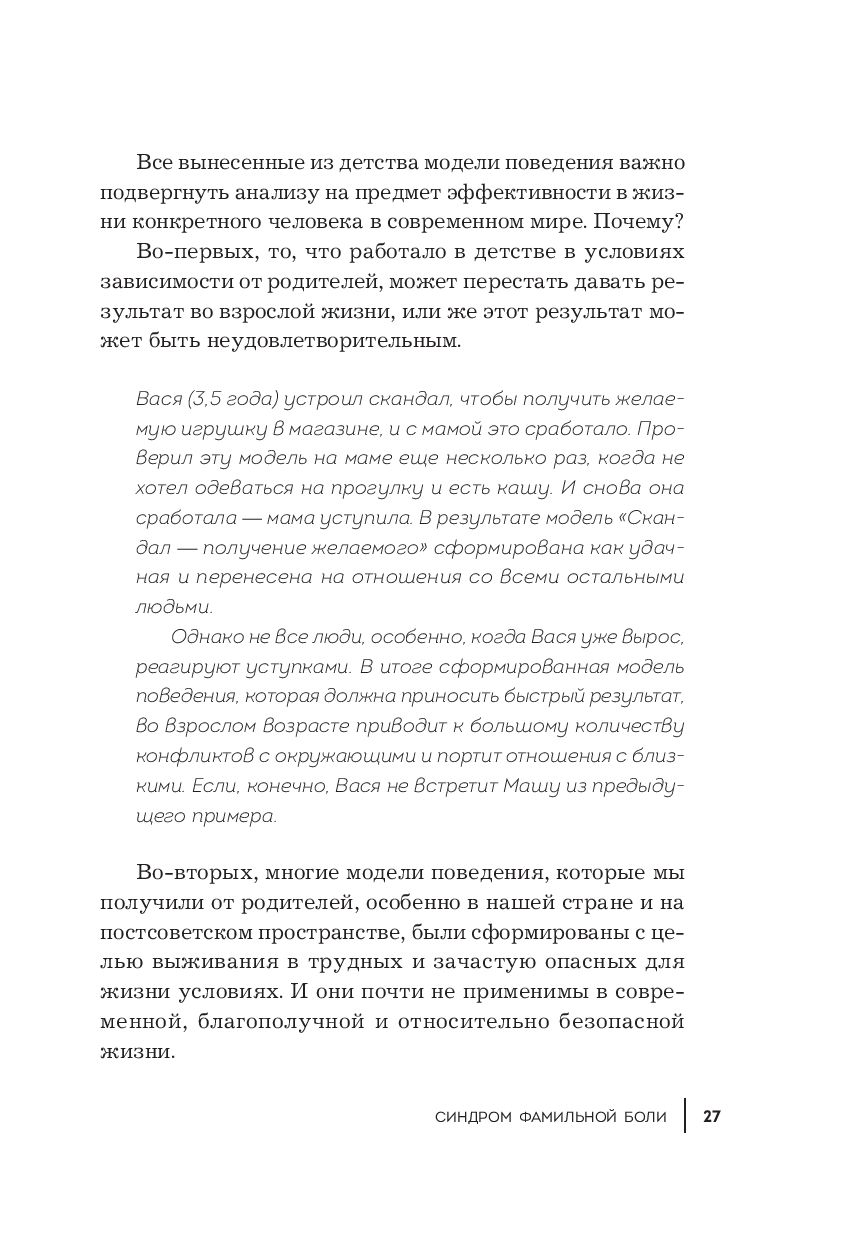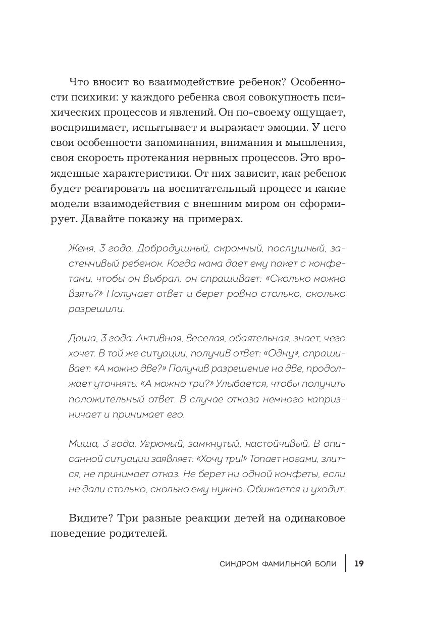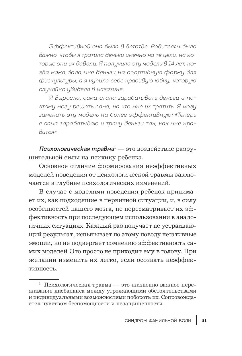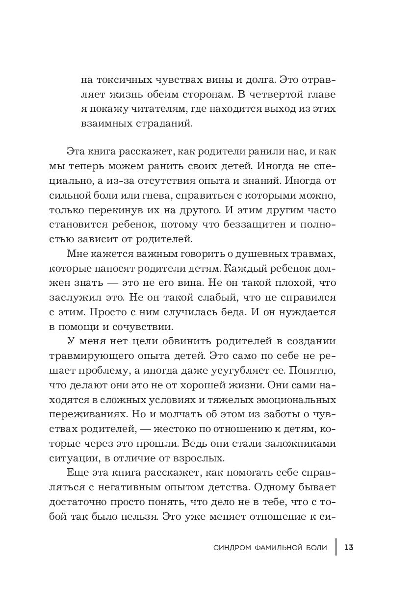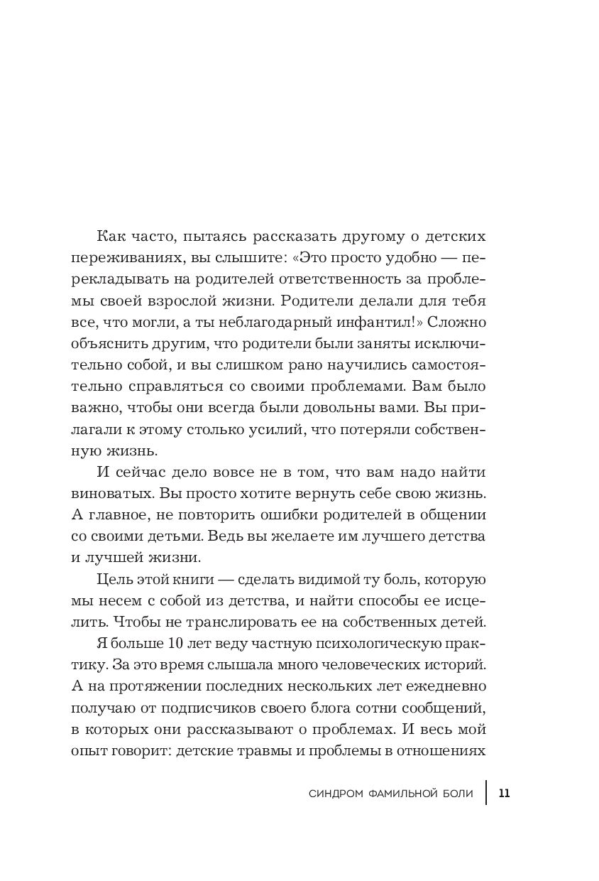 "Синдром фамильной боли" – книга о выборе собственного сценария. О том, как проработать детские негативные воспоминания и начать жить в соответствии с настоящими мечтами и запросами. И о том, как воспитывать своих детей, сохраняя их самодостаточность, здоровую самооценку и личностную цельность.