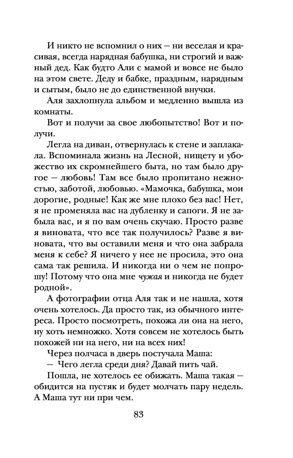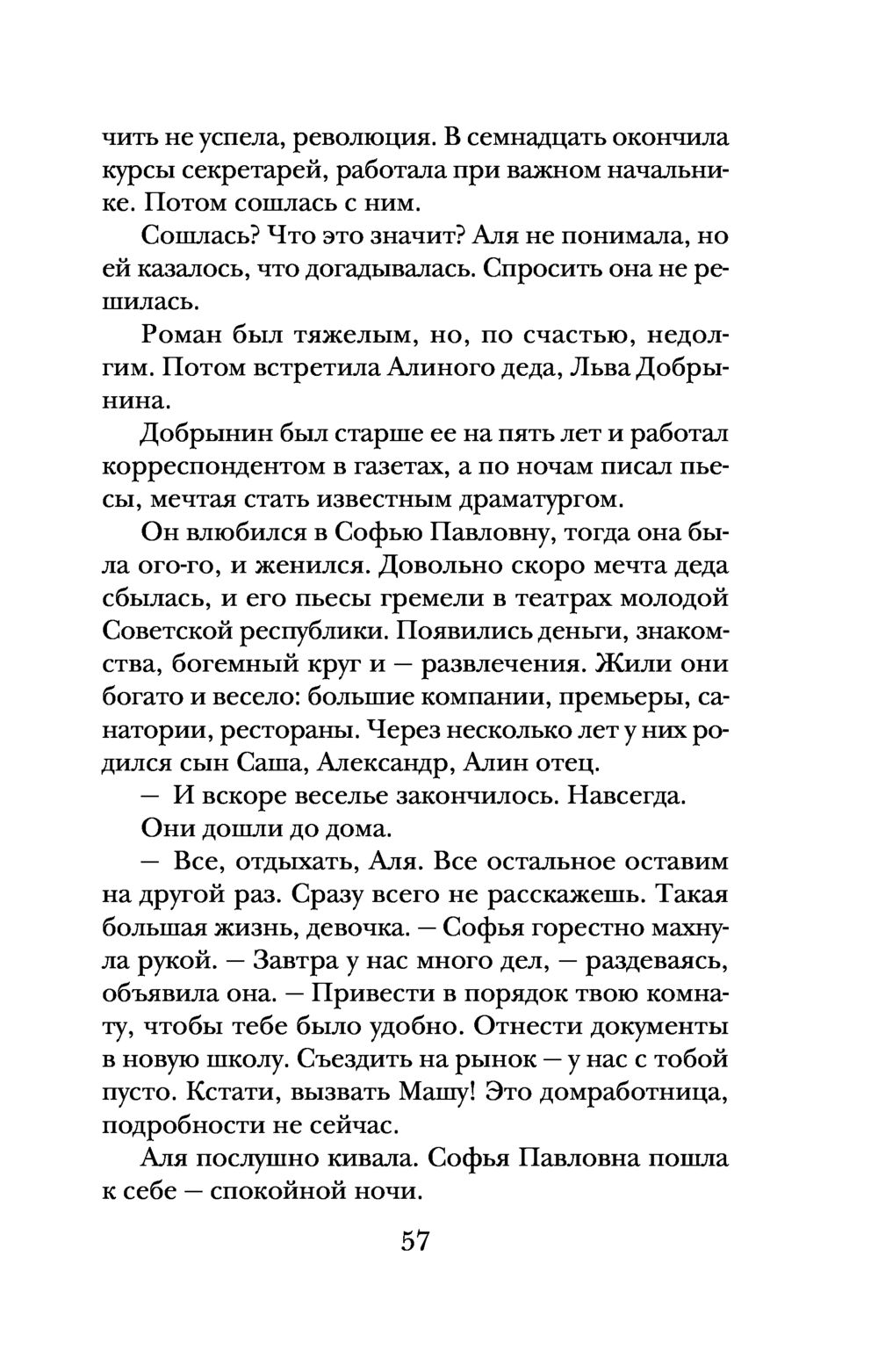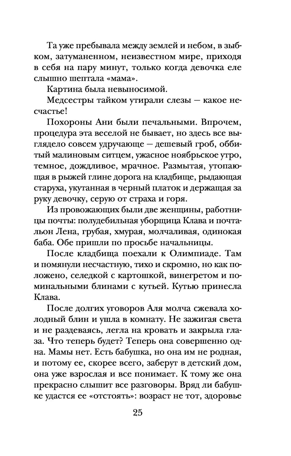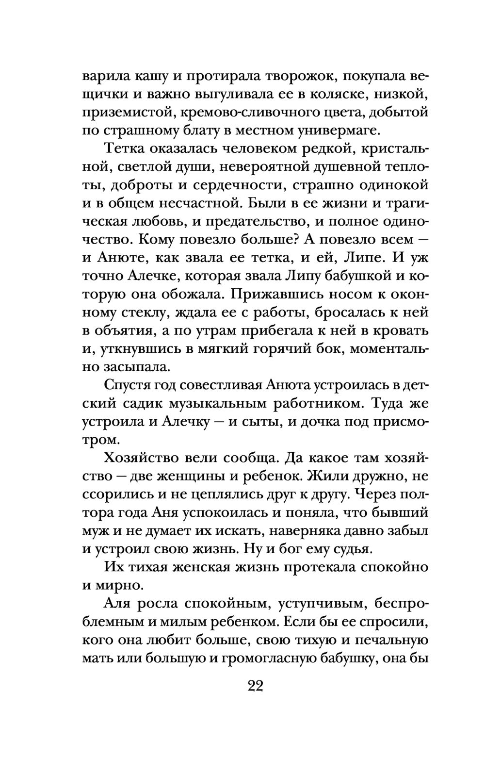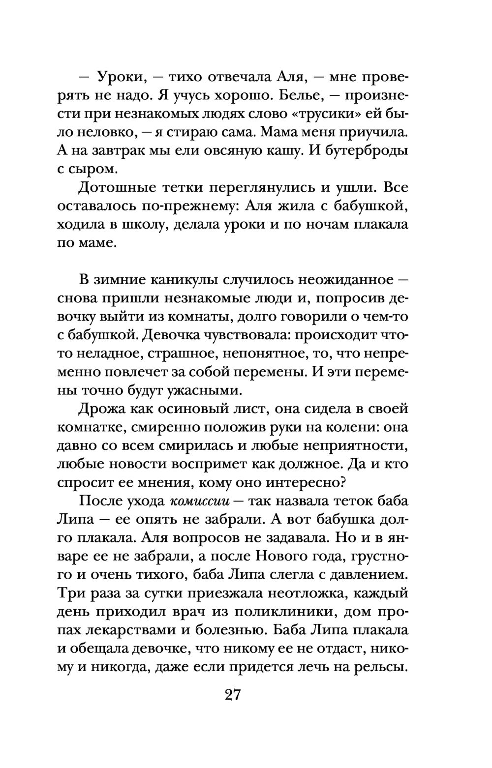 Но жизни без ошибок не бывает. И Аля, став совсем взрослой, понимает: главное – в ее жизни была любовь, настоящая, всепоглощающая. А значит, она почти счастливая женщина. Потому что быть совсем счастливой, наверное, невозможно.