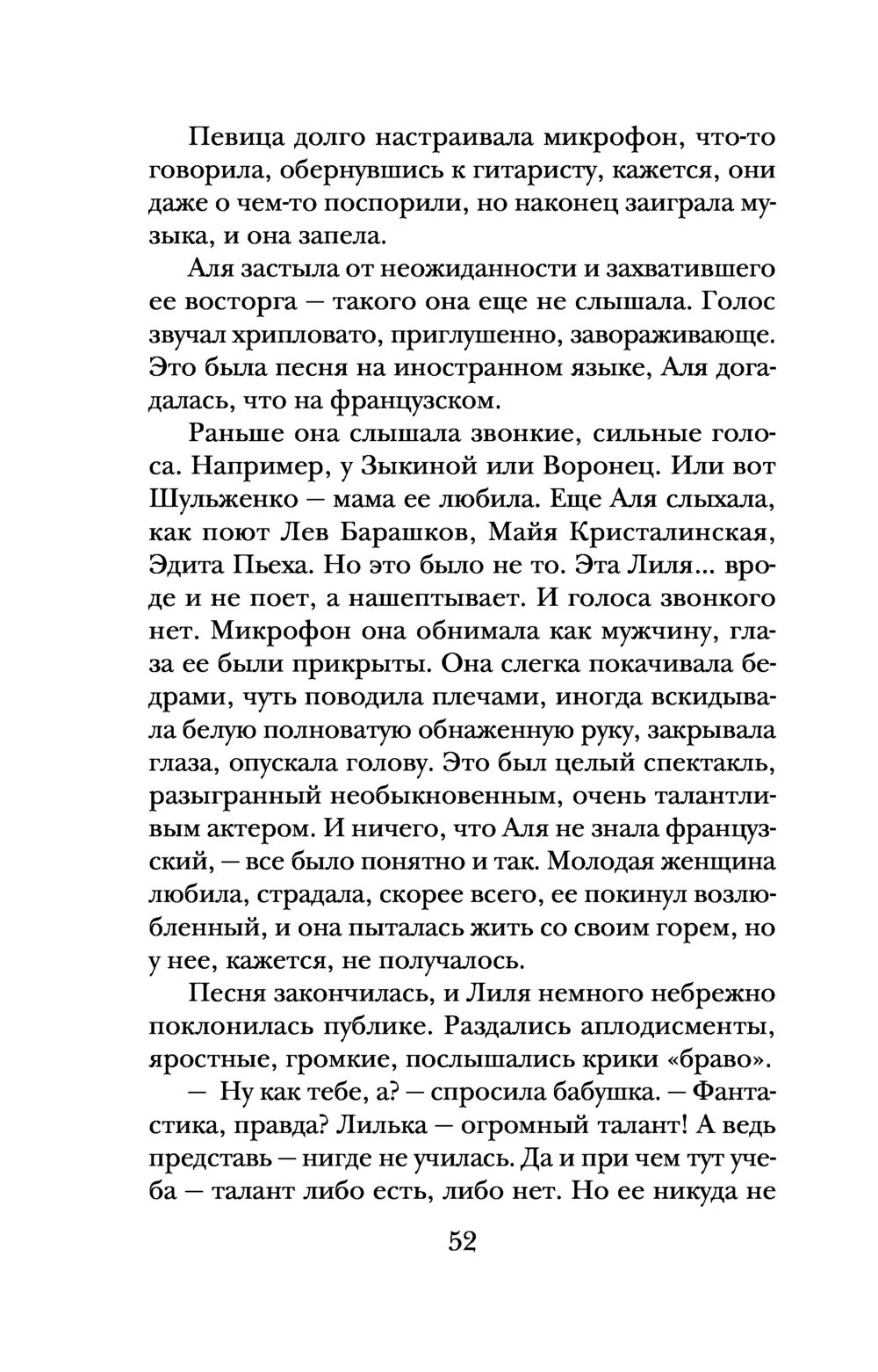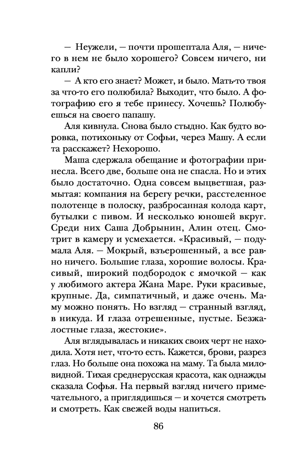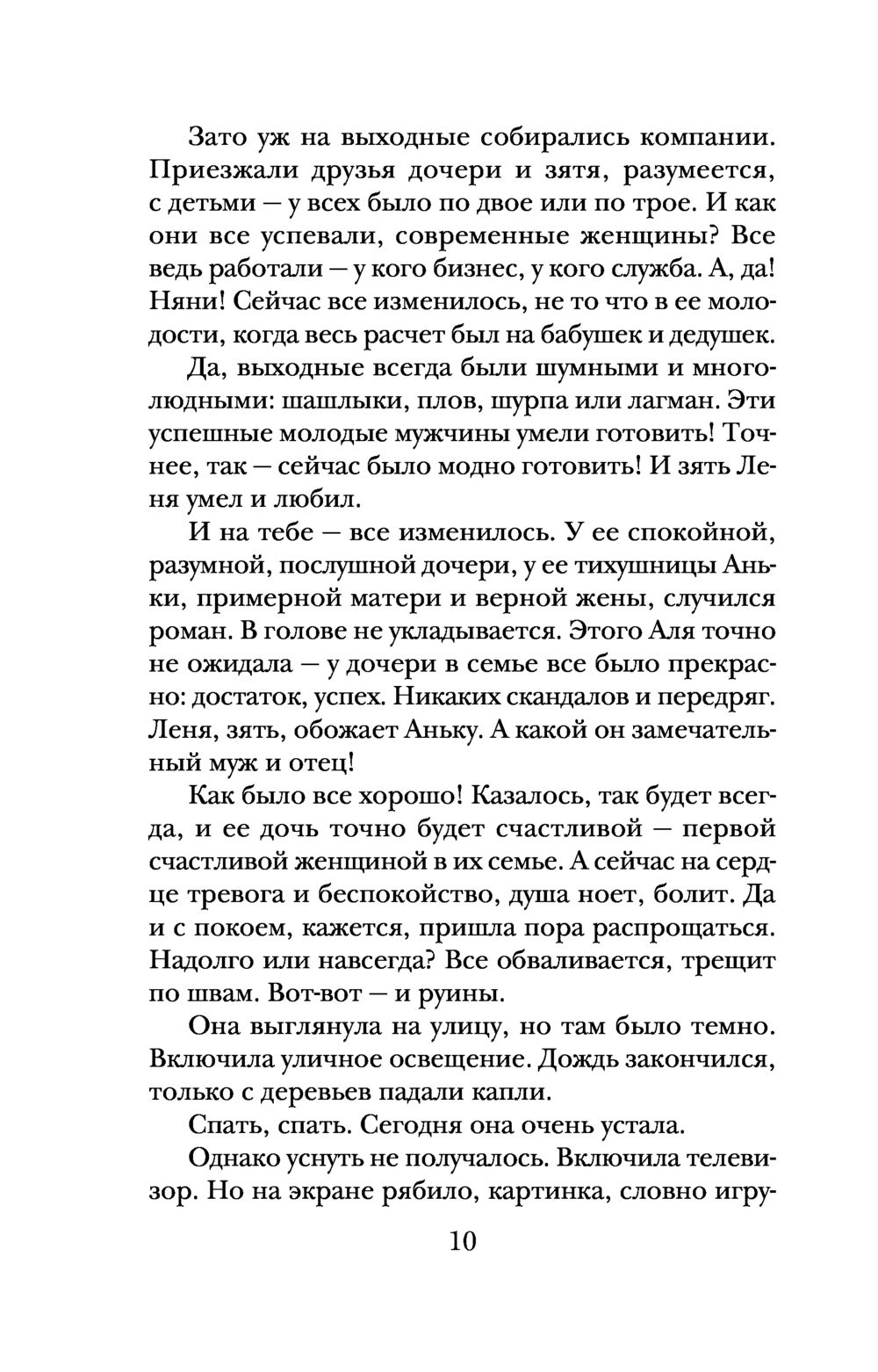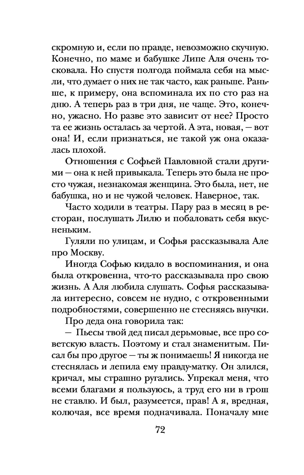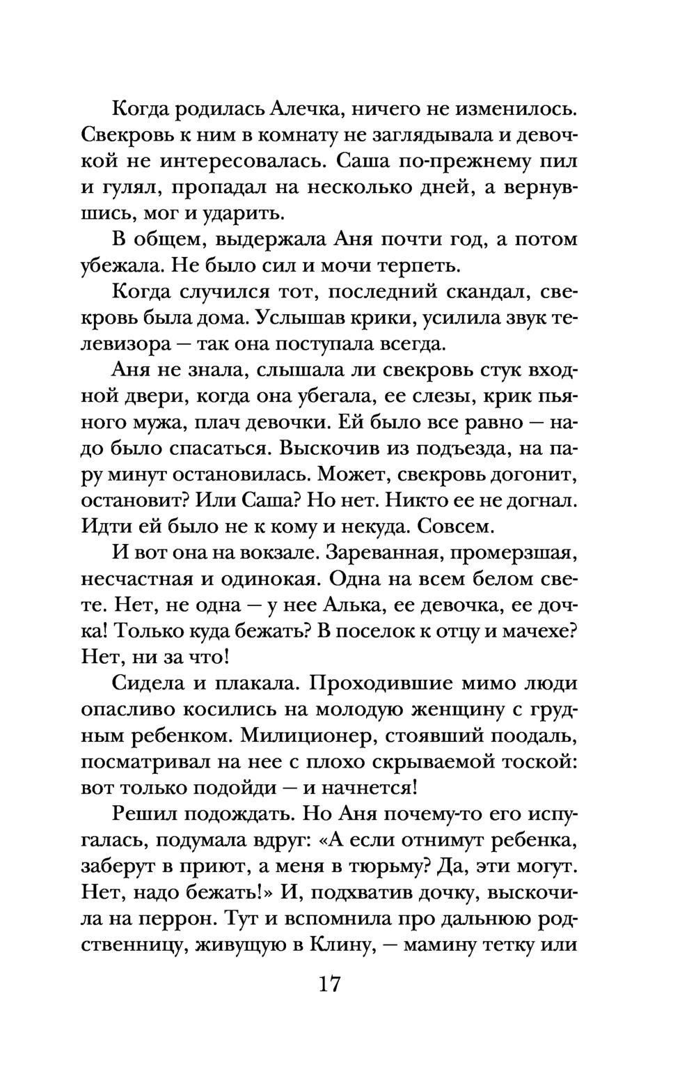 Но жизни без ошибок не бывает. И Аля, став совсем взрослой, понимает: главное – в ее жизни была любовь, настоящая, всепоглощающая. А значит, она почти счастливая женщина. Потому что быть совсем счастливой, наверное, невозможно.