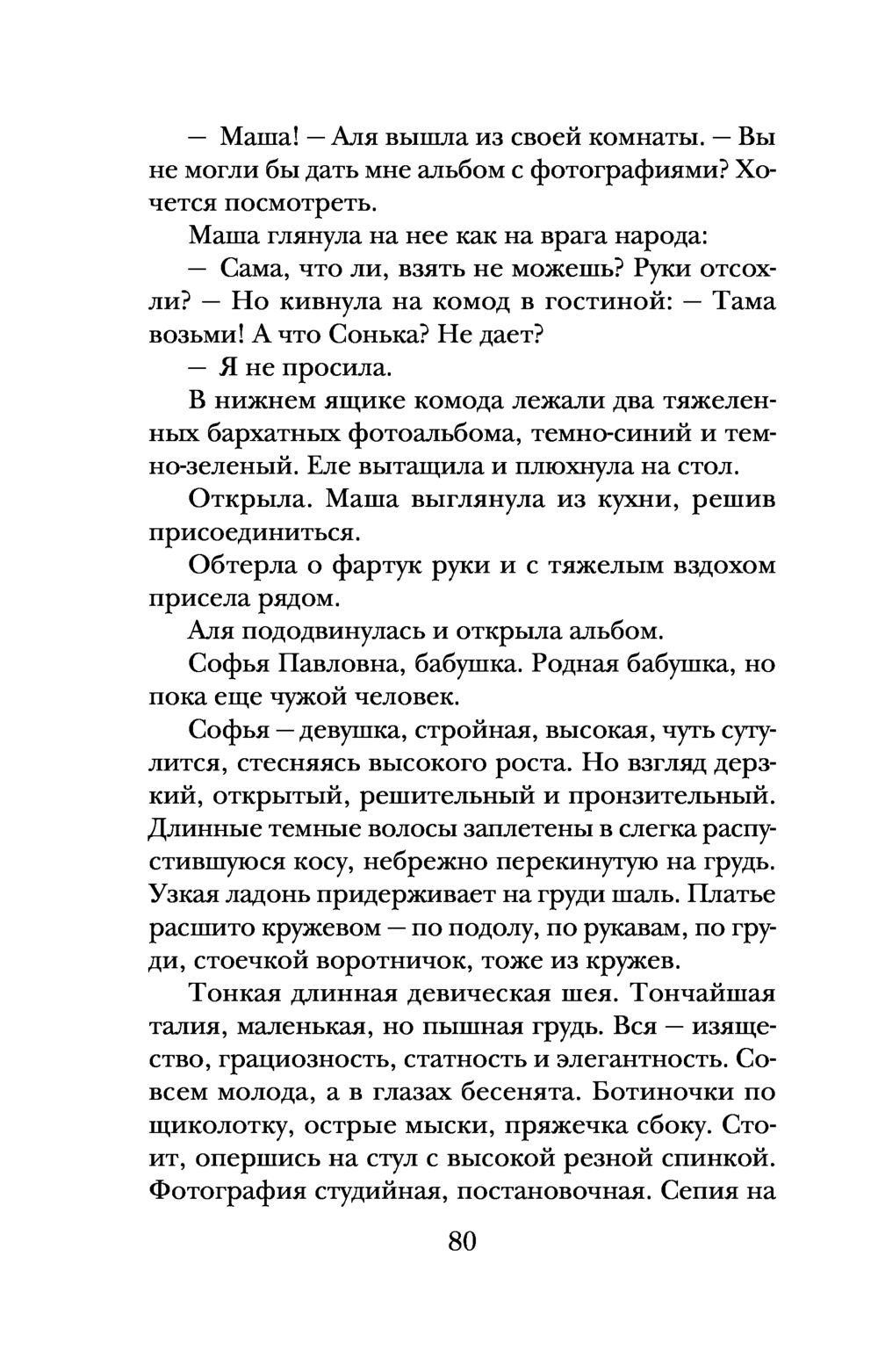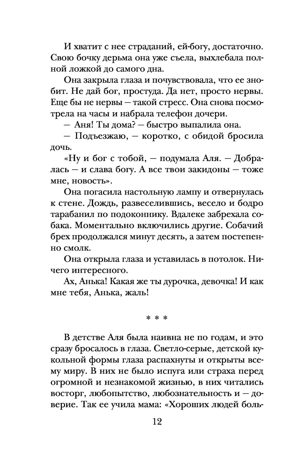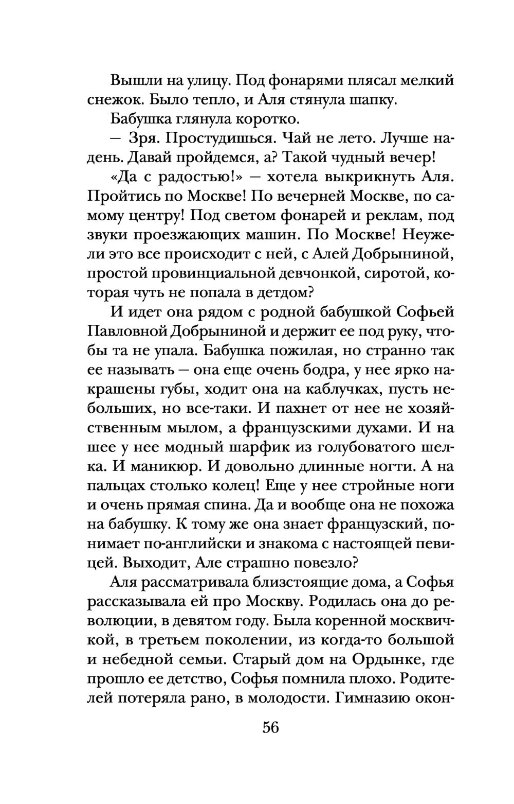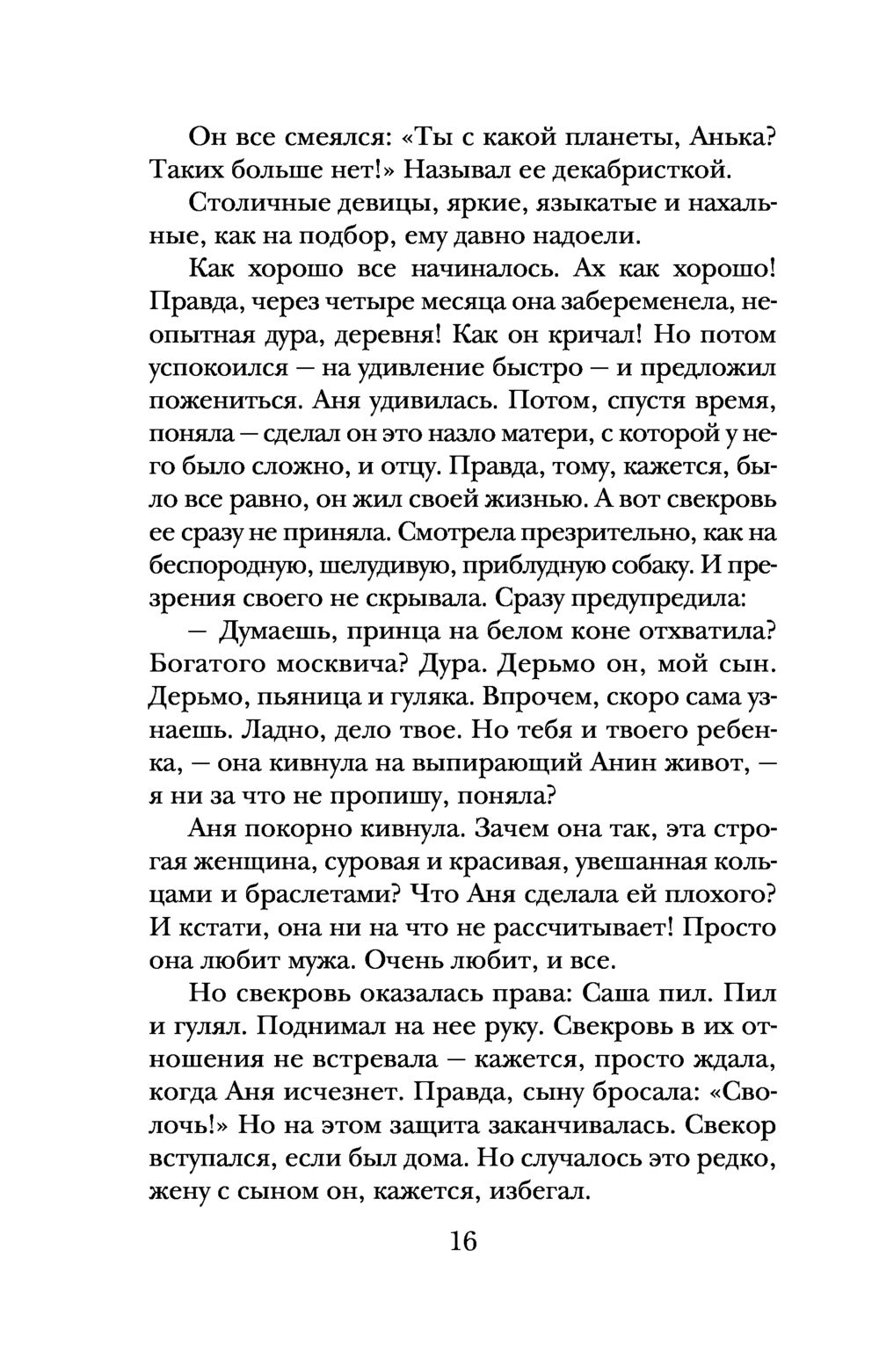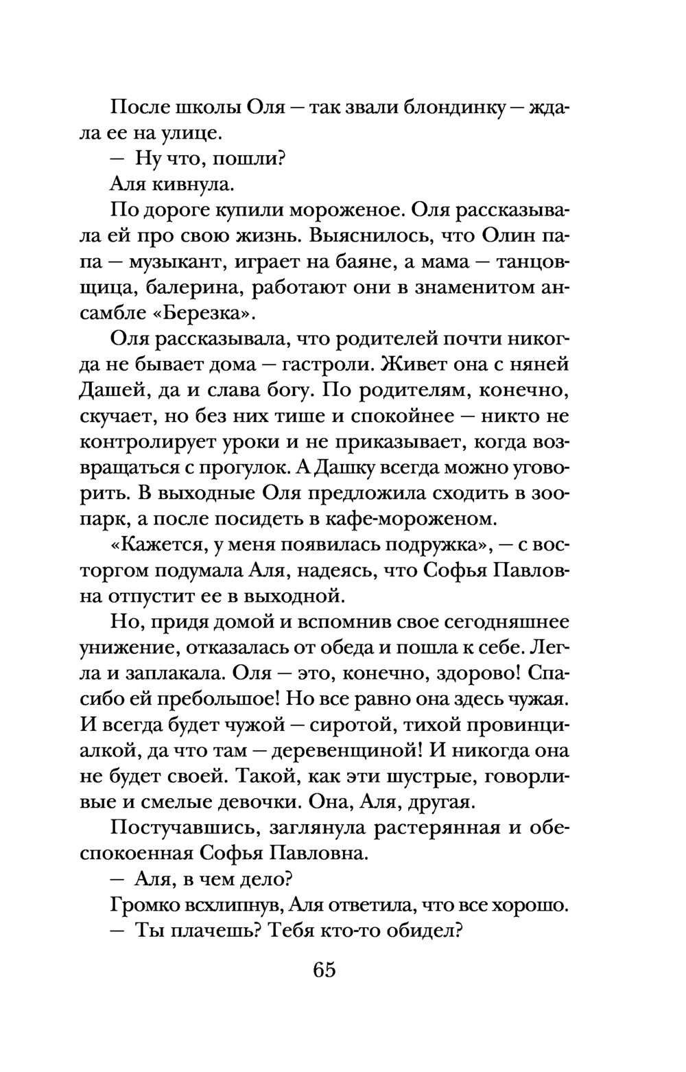 Но жизни без ошибок не бывает. И Аля, став совсем взрослой, понимает: главное – в ее жизни была любовь, настоящая, всепоглощающая. А значит, она почти счастливая женщина. Потому что быть совсем счастливой, наверное, невозможно.
