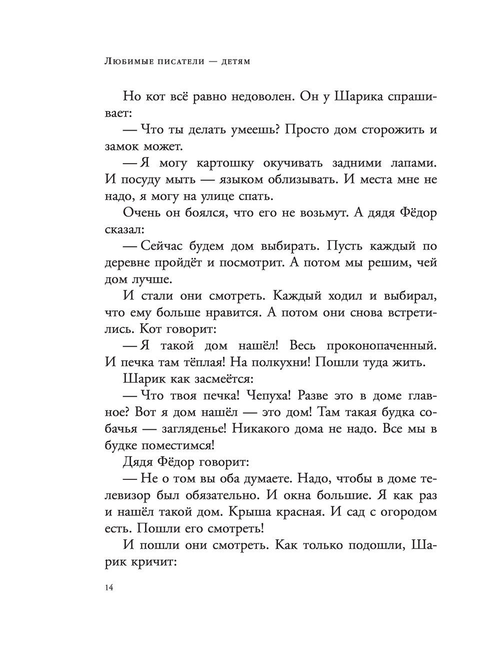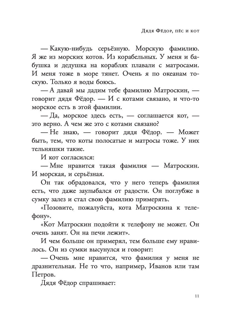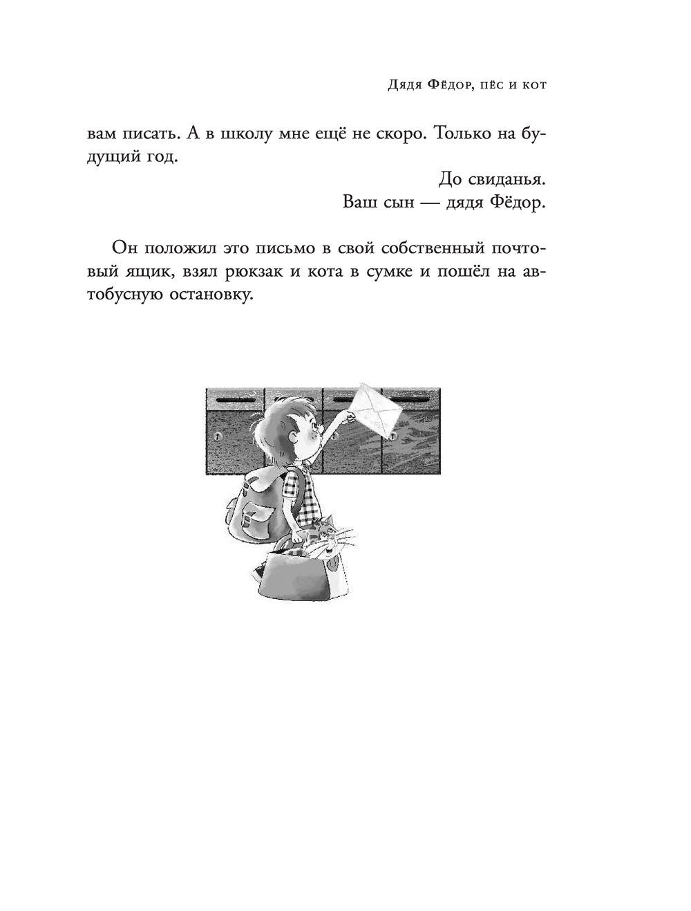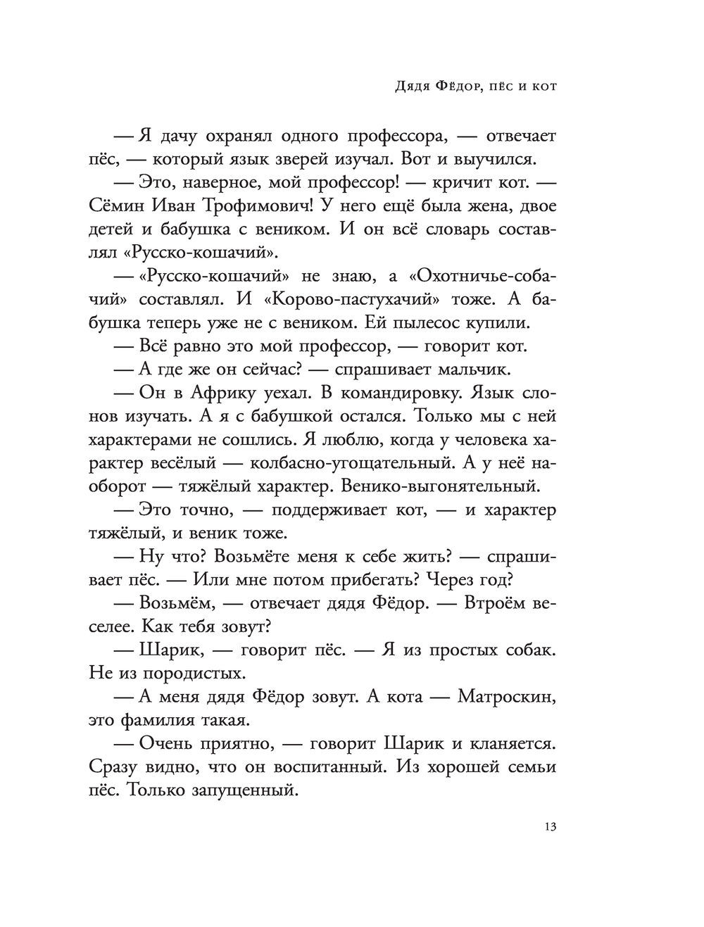 В книгу вошли три повести об обитателях деревни Простоквашино: "Дядя Фёдор, пёс и кот", "Любимая девочка дяди Фёдора" и "Дядя Фёдор идёт в школу, или Нэт из Интернет". Городской мальчик поселился в деревне с котом и собакой. Кот и собака были не обычные – говорящие, но никто (почти) этому не удивлялся. Так они и жили, пока в деревню не приехала девочка Катя – хорошенькая и умненькая. Дяде Фёдору она очень понравилась. А Шарик с Матроскиным испугались: а ну как мальчик с девочкой поженятся лет через десять, а их – вон на улицу?! И тогда они придумали план "спасения" дяди Фёдора… В третьей повести настала пора дяде Фёдору идти в школу. Вместе с ним в подготовительный класс отправился почтальон Печкин, а Шарик с Матроскиным дома занимались. И вот что вышло… Новые иллюстрации Ольги Боголюбовой и Елены Вульф.