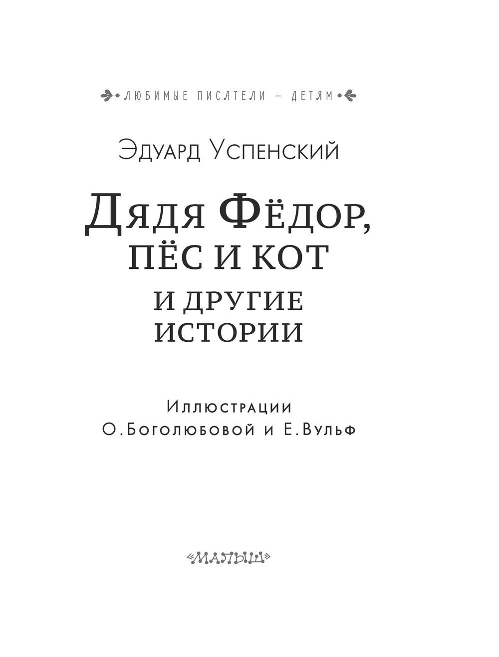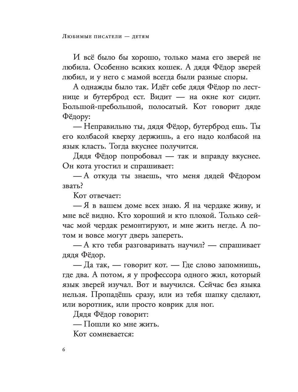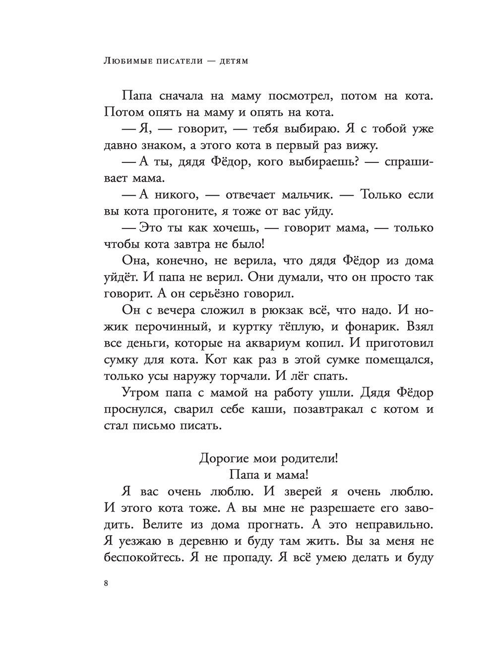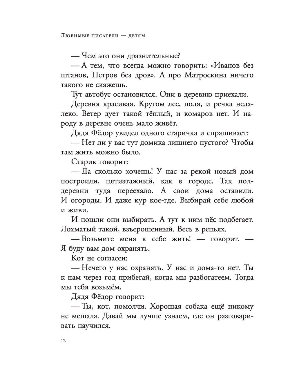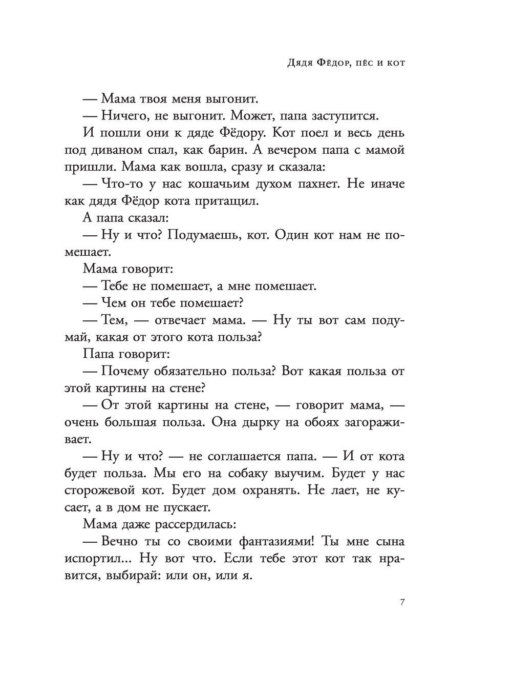 В книгу вошли три повести об обитателях деревни Простоквашино: "Дядя Фёдор, пёс и кот", "Любимая девочка дяди Фёдора" и "Дядя Фёдор идёт в школу, или Нэт из Интернет". Городской мальчик поселился в деревне с котом и собакой. Кот и собака были не обычные – говорящие, но никто (почти) этому не удивлялся. Так они и жили, пока в деревню не приехала девочка Катя – хорошенькая и умненькая. Дяде Фёдору она очень понравилась. А Шарик с Матроскиным испугались: а ну как мальчик с девочкой поженятся лет через десять, а их – вон на улицу?! И тогда они придумали план "спасения" дяди Фёдора… В третьей повести настала пора дяде Фёдору идти в школу. Вместе с ним в подготовительный класс отправился почтальон Печкин, а Шарик с Матроскиным дома занимались. И вот что вышло… Новые иллюстрации Ольги Боголюбовой и Елены Вульф.