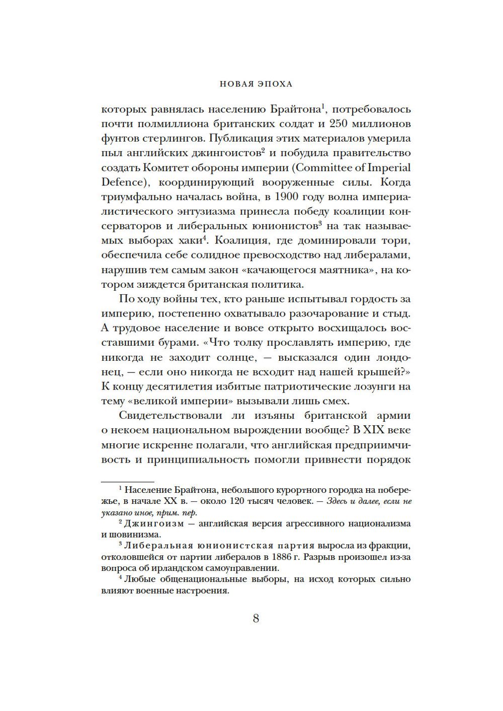 В этом томе события истории Англии берут отсчет с 1902 года, когда завершилась Англо-бурская война, в ходе которой тех, кто раньше испытывал гордость за империю, постепенно охватывали разочарование и стыд. Эдуард VII, хоть и не дотягивал по политическому весу до своей матери, королевы Виктории, был самым любимым в народе английским королем после Карла II. При его сыне Георге V страна участвовала в Первой мировой войне и еще сохраняла некоторые черты викторианского времени, но к концу правления следующего монарха она изменилась до неузнаваемости.