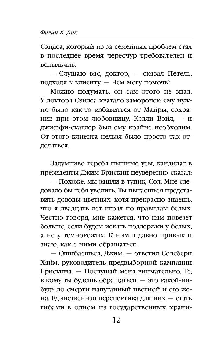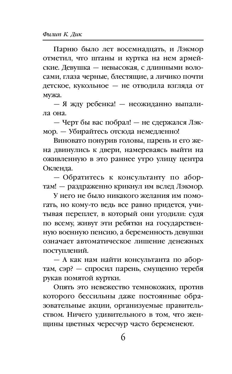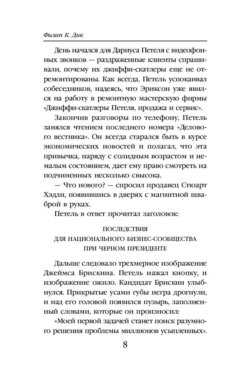Невероятно интересный сюжет. Снова неповторимый мир, со своими интересными изюминками, которые и в наше время далеко не каждый способен придумать и раскрыть. Как и во всех произведениях Филипа Дика - хорошо, но мало
