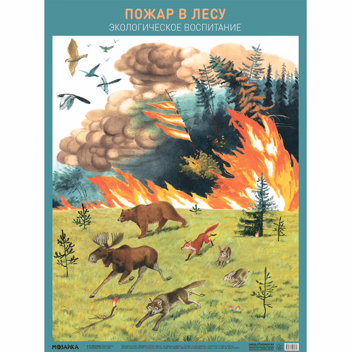 Данный тематический плакат используется в работе с детьми для формирования элементарных знаний о пожаре в лесу, его последствиях, действиях и способах тушения.