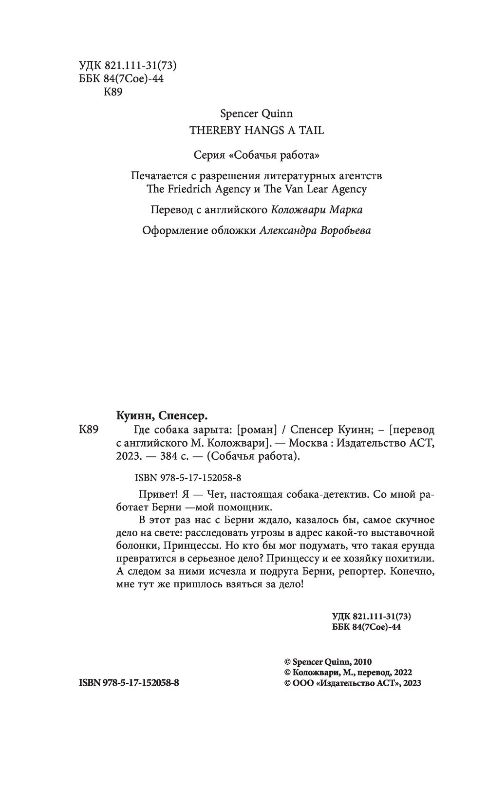 Привет! Я – Чет, настоящая собака-детектив. Со мной работает Берни – мой помощник. В этот раз нас с Берни ждало, казалось бы, самое скучное дело на свете: расследовать угрозы в адрес какой-то выставочной болонки, Принцессы. Но кто бы мог подумать, что такая ерунда превратится в серьезное дело? Принцессу и ее хозяйку похитили. А следом за ними исчезла и подруга Берни, репортер. Конечно, мне тут же пришлось взяться за дело!