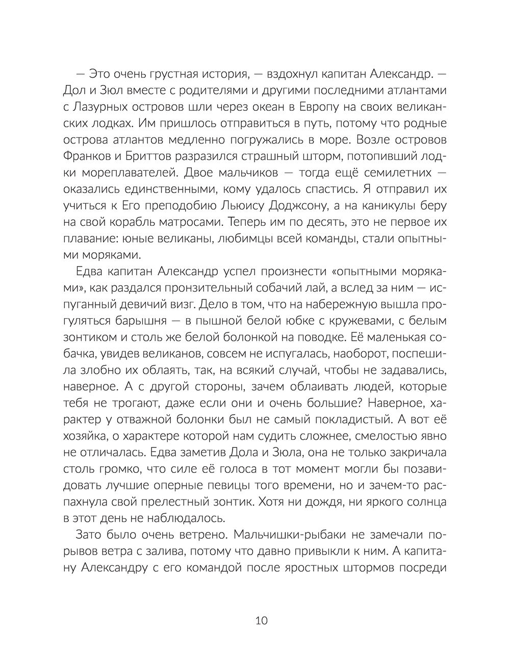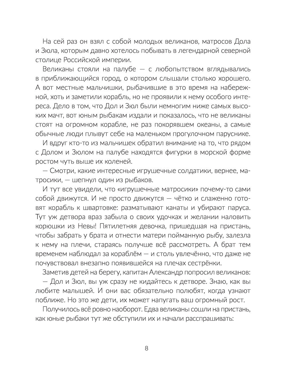 Капитан Александр вместе с заморскими помощниками – великанами Долей и Зюлей – возвращается на родину, в Санкт-Петербург. Для огромных матросов здесь всё в новинку: и красивый город с ровными улицами и площадями, и северная зима, и пышные дворцы императоров, и знаменитый Медный всадник, и наводнение, и приезд загадочного итальянского графа Калиостро, и магические свойства стереоскопа – прибора для объёмного видения изображений. Мальчики-атланты рассказывают самые яркие петербургские легенды необыкновенно увлекательно – и немного странно, ведь у них свое великанское зрение. А байки становятся легендами именно потому, что каждый добавляет в них что-то от себя, и заметьте: все говорят чистую правду, ничего, кроме правды...