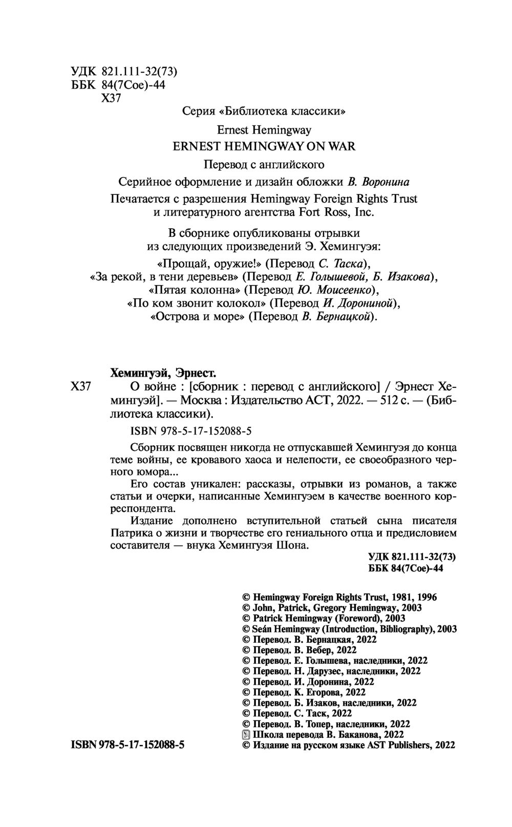 Его состав уникален: рассказы, отрывки из романов, а также статьи и очерки, написанные Хемингуэем в качестве военного корреспондента.