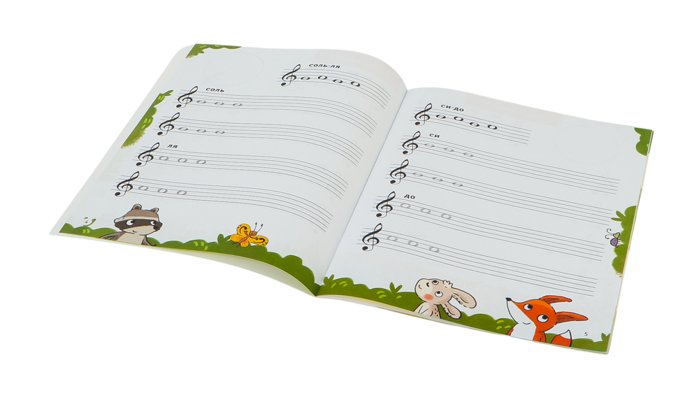 Нотные прописи – это красочная тетрадь для освоения музыкального письма в подготовительном или 1-м классе ДМШ и ДШИ. Крупный нотный стан, интересное оформление и веселые наклейки помогают создать радостную, творческую атмосферу при формировании у детей необходимых музыкальных навыков.