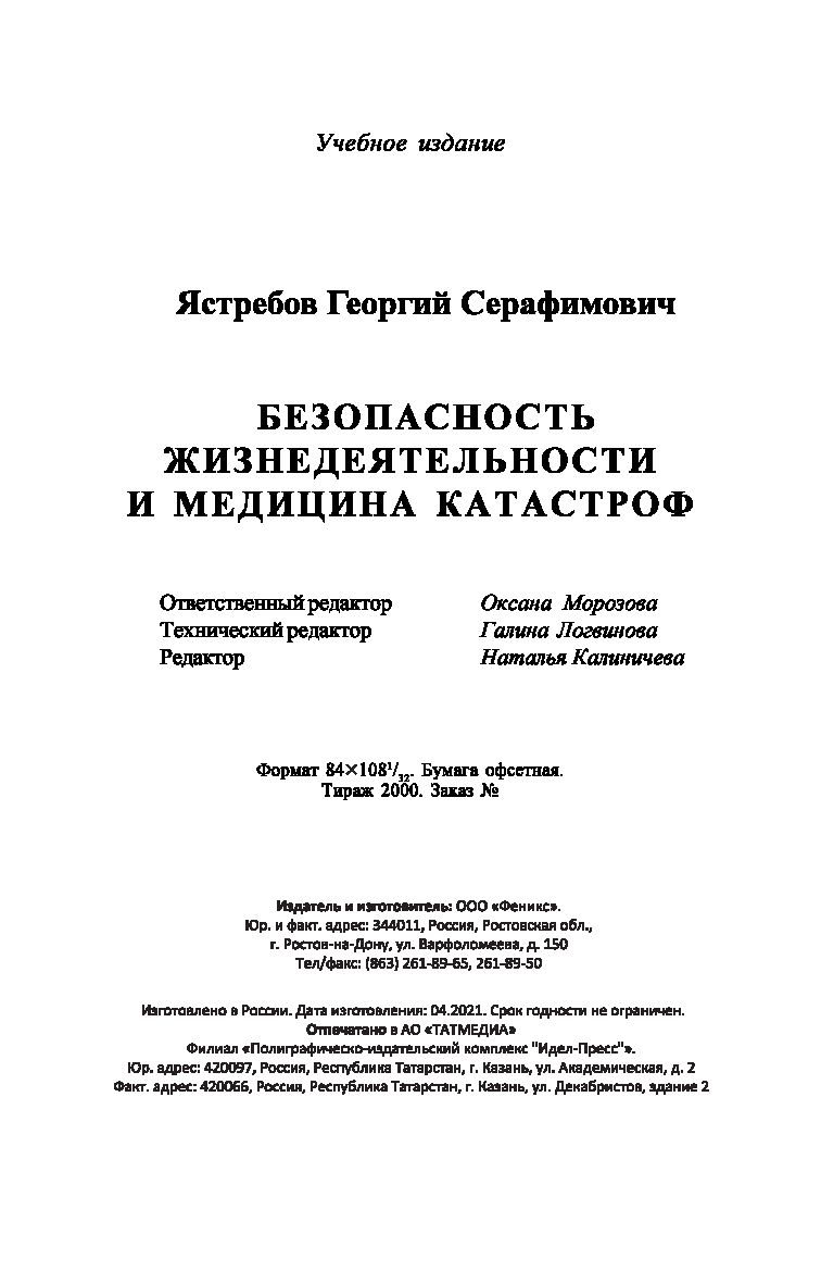 Безопасность жизнедеятельности и медицина катастроф. Учебное пособие