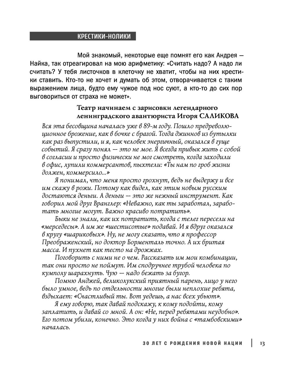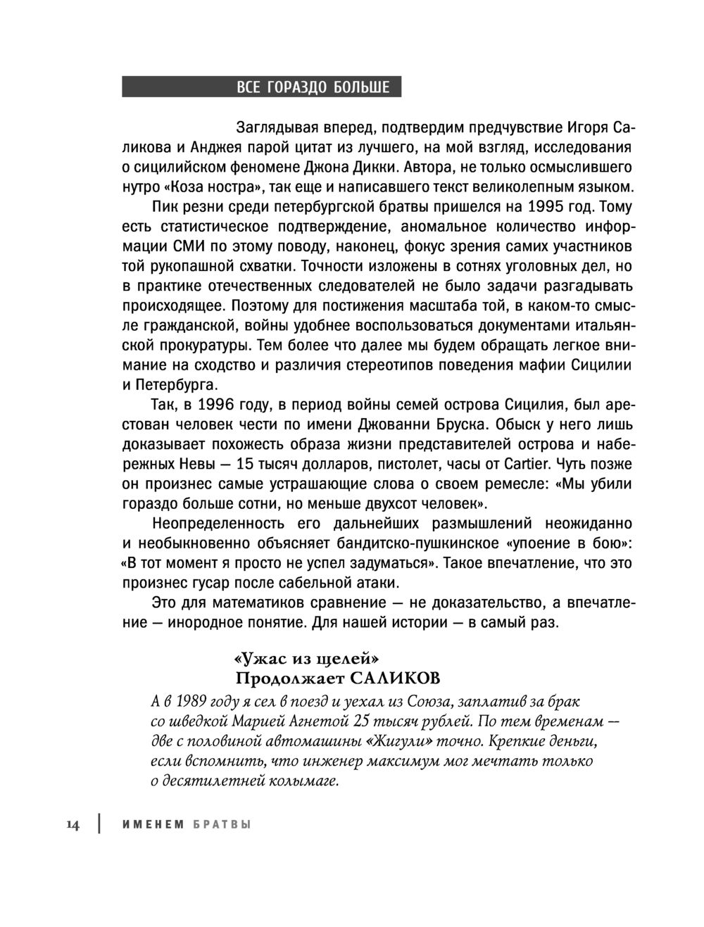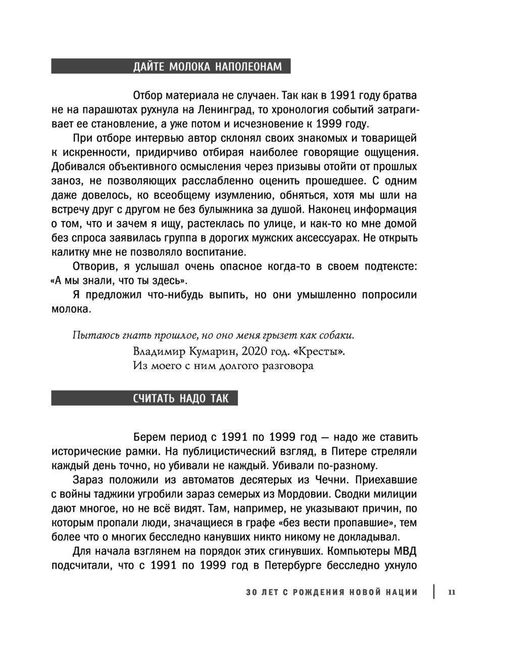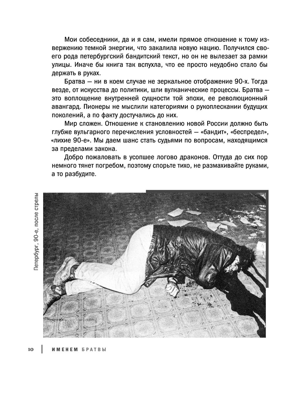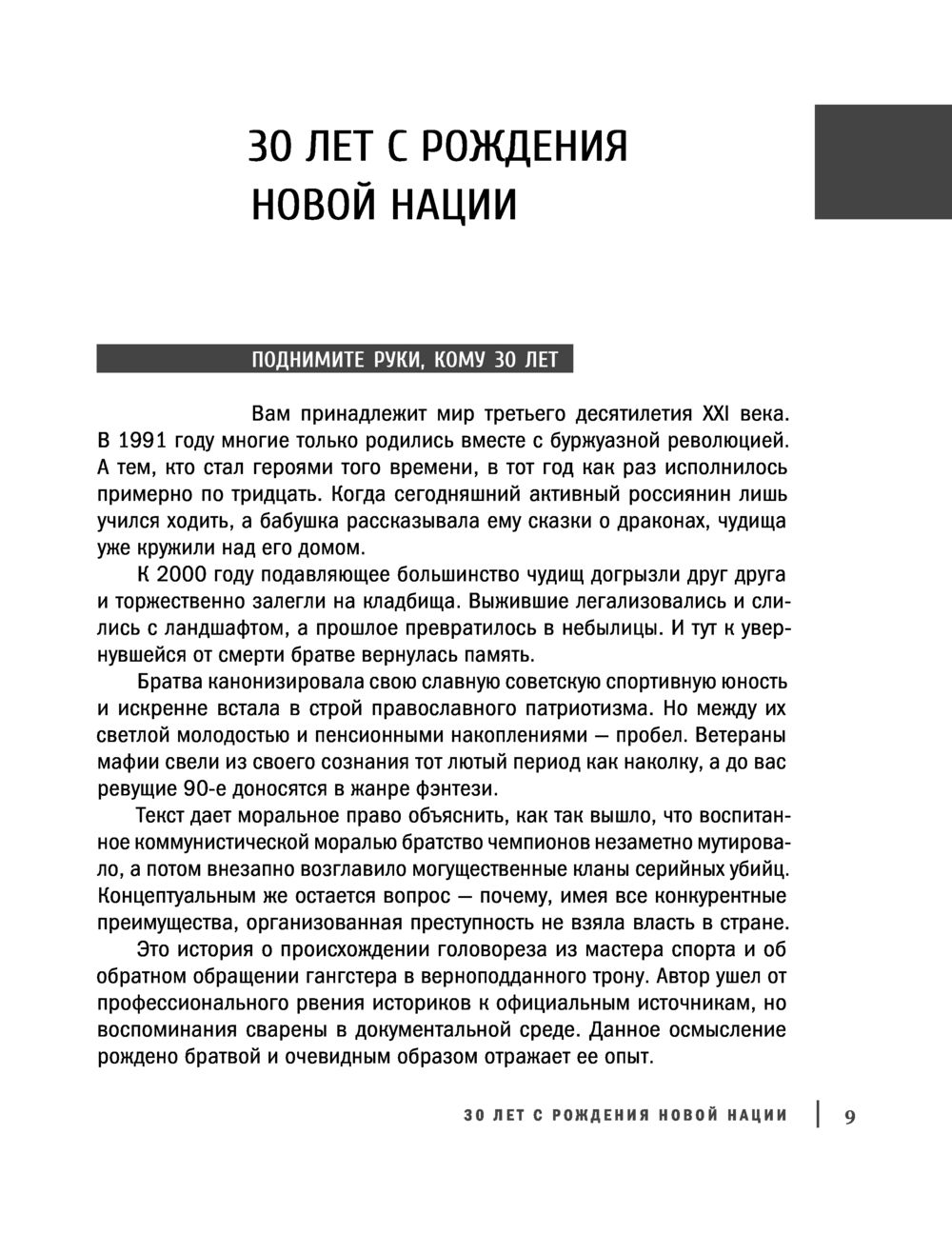 С 1991 года выросло новое поколение. Обсуждая девяностые, молодые люди предсказуемо мыслят штампами. Автор и его собеседники были частью того мощнейшего движения советских спортсменов, которое надолго подмяло под себя власть на улицах. Свирепый опыт дает нам право осмыслить те вулканические и кровавые процессы. У выживших есть что предъявить и себе, и времени. Они до сих пор готовы к конфликту. Этим текстом Братва забивает вам стрелу. Смелее. Евгений Вышенков, как тогда говорили, "подержит вам спину" – постоит на вашей стороне.