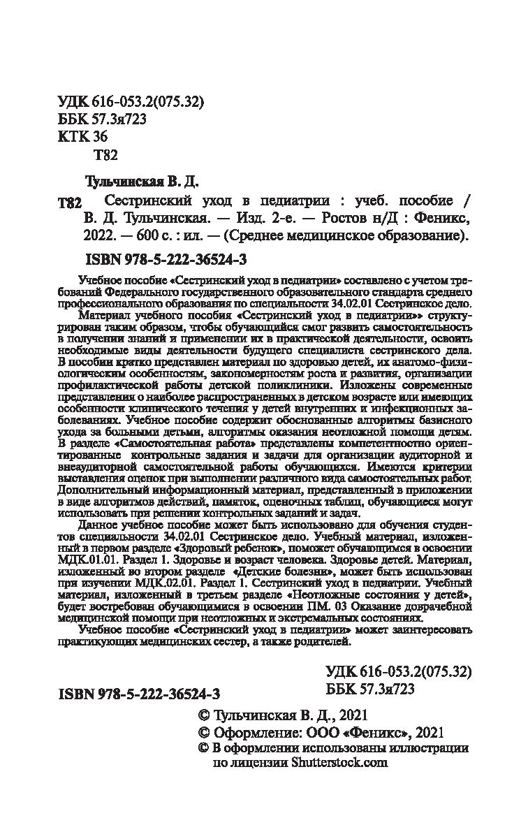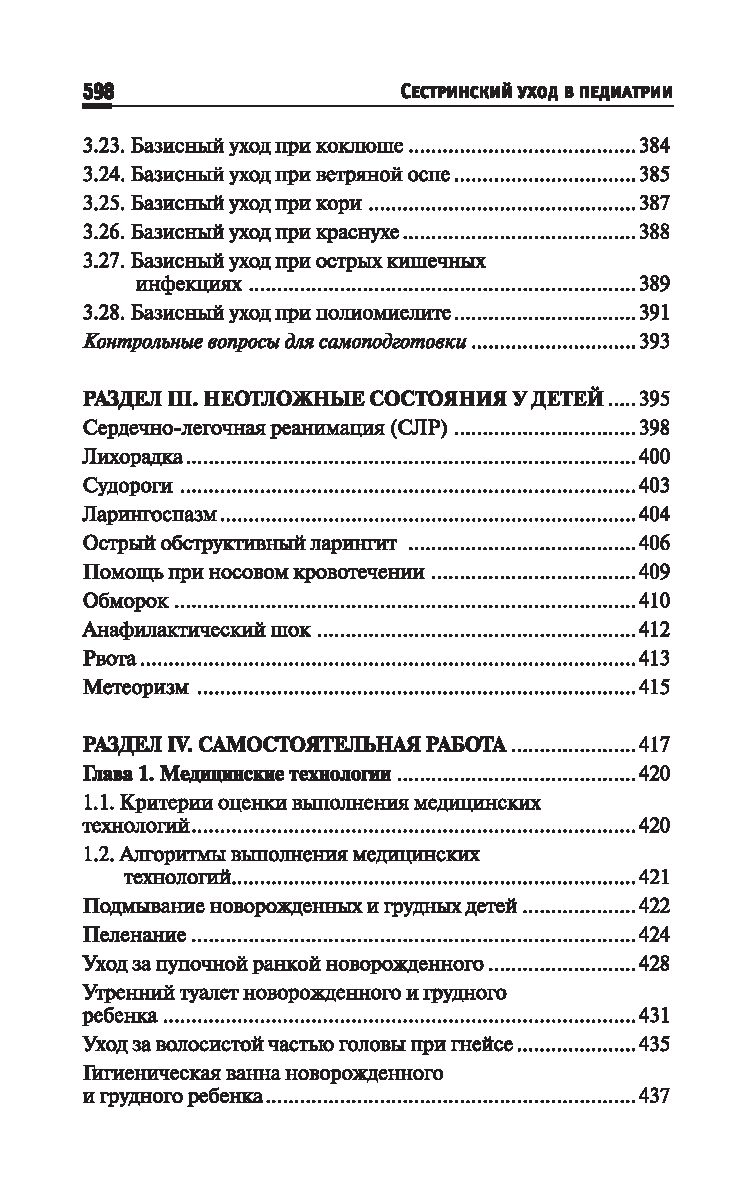 Материал учебного пособия "Сестринский уход в педиатрии" структурирован таким образом, чтобы обучающийся смог развить самостоятельность в получении знаний и применении их в практической деятельности, освоить необходимые виды деятельности будущего специалиста сестринского дела. В пособии кратко представлен материал по здоровью детей, их анатомо-физиологическим особенностям, закономерностям роста и развития, организации профилактической работы детской поликлиники. Изложены современные представления о наиболее распространенных в детском возрасте или имеющих особенности клинического течения у детей внутренних и инфекционных заболеваниях. Учебное пособие содержит обоснованные алгоритмы базисного ухода за больными детьми, алгоритмы оказания неотложной помощи детям. В разделе "Самостоятельная работа" представлены компетентностно ориентированные контрольные задания и задачи для организации аудиторной и внеаудиторной самостоятельной работы обучающихся. Имеются критерии выставления оценок при выполнении различного вида самостоятельных работ. Дополнительный информационный материал, представленный в приложении в виде алгоритмов действий, памяток, оценочных таблиц, обучающиеся могут использовать при решении контрольных заданий и задач.