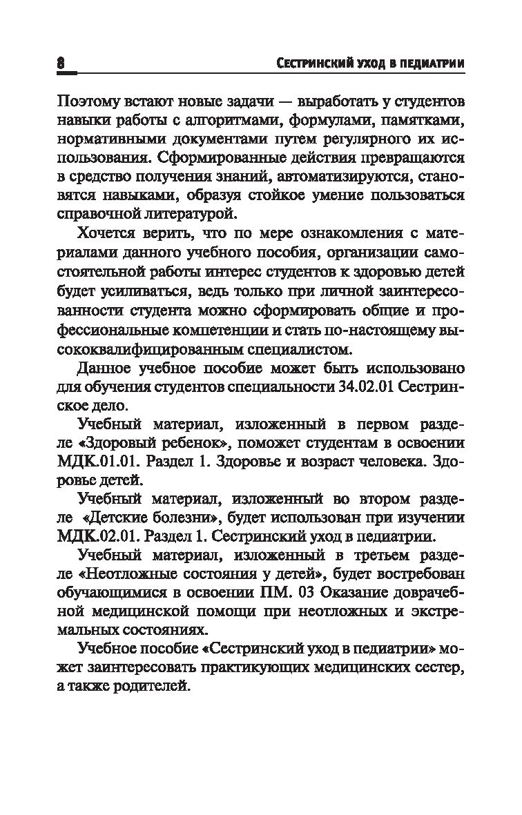 Данное учебное пособие может быть использовано для обучения студентов специальности 34.02.01 Сестринское дело. Учебный материал, изложенный в первом разделе "Здоровый ребенок", поможет обучающимся в освоении МДК.01.01. Раздел 1. Здоровье и возраст человека. Здоровье детей. Материал, изложенный во втором разделе "Детские болезни", может быть использован при изучении МДК.02.01. Раздел 1. Сестринский уход в педиатрии. Учебный материал, изложенный в третьем разделе "Неотложные состояния у детей", будет востребован обучающимися в освоении ПМ. 03 Оказание доврачебной медицинской помощи при неотложных и экстремальных состояниях.